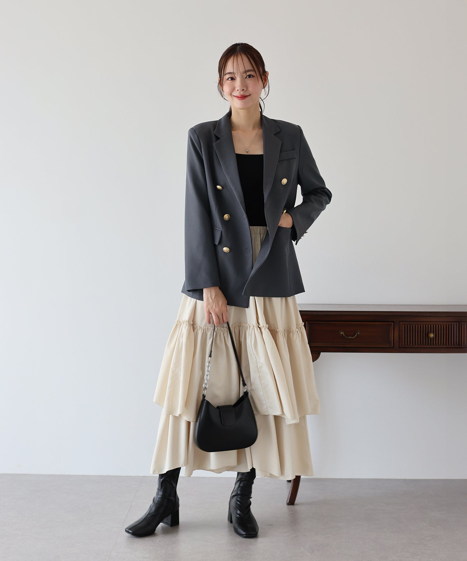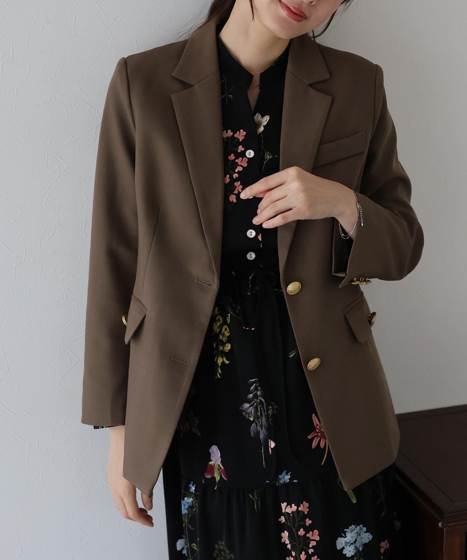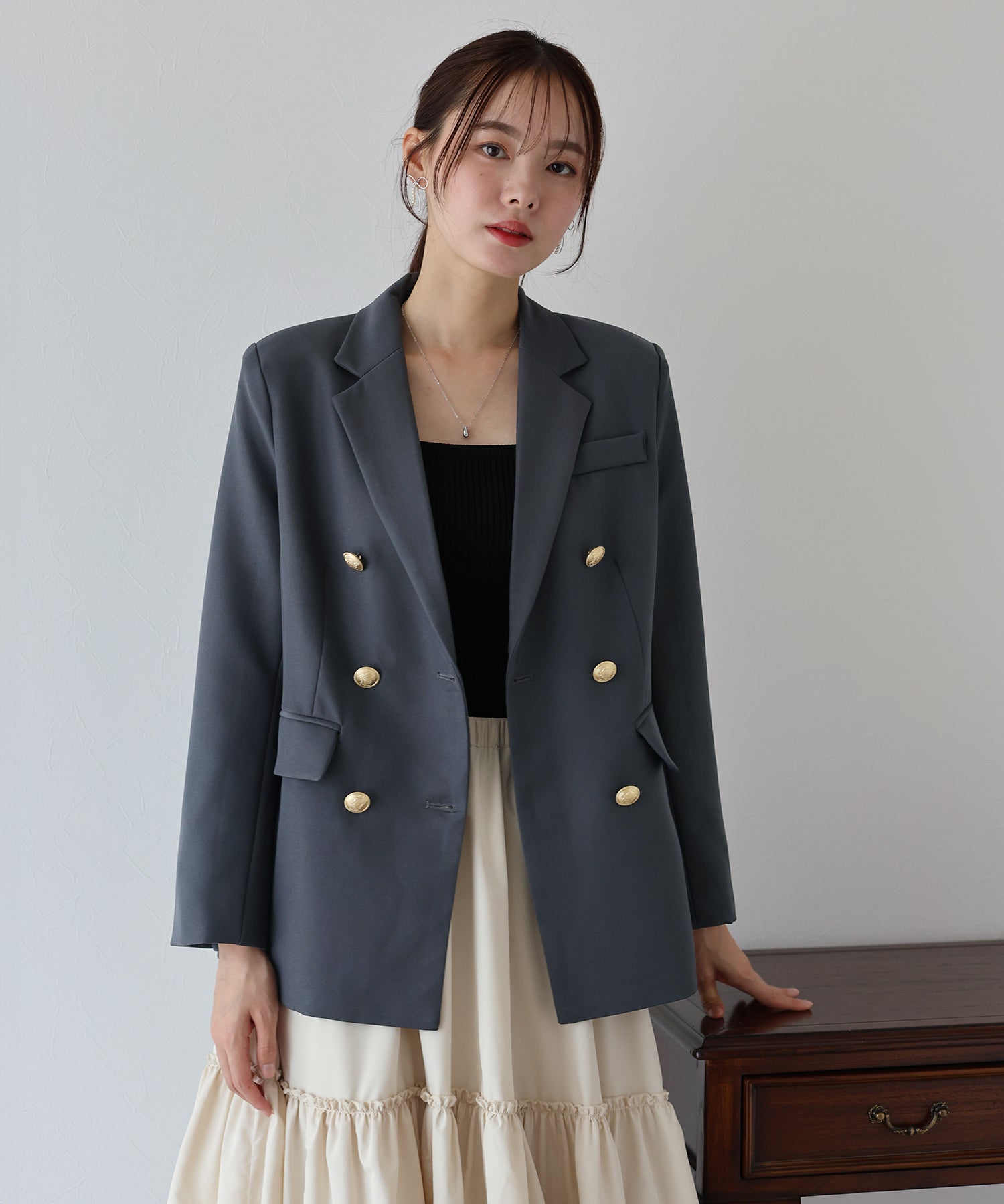 様々なスタイルに大活躍の金釦ダブルブレザージャケット ?POINT 程よく緩いシルエットがオンオフ問わず様々なスタイリングにマッチする仕上げたテーラードジャケット。 ベーシックながらフロントと袖に付いたゴールド釦がアクセントに。 ゆったりとし過ぎずジャスト過ぎない絶妙なサイズ感で、ヒップをカバーしてくれるやや長めの着丈が◎ ダブル仕立てのデザインできちんと感のあるジャケットなので、きれいめなブラウスやボトムと合わせるとオフィスカジュアルにも。 シーズンレスで取り入れやすい一着です。