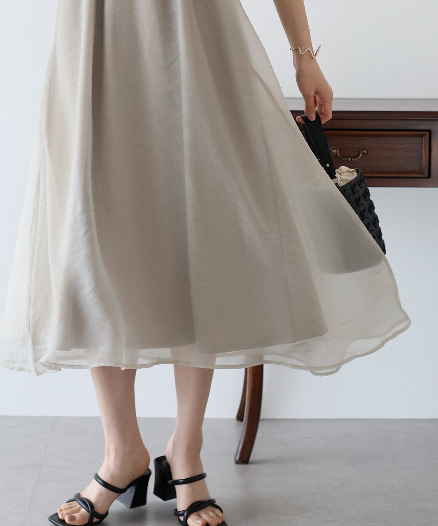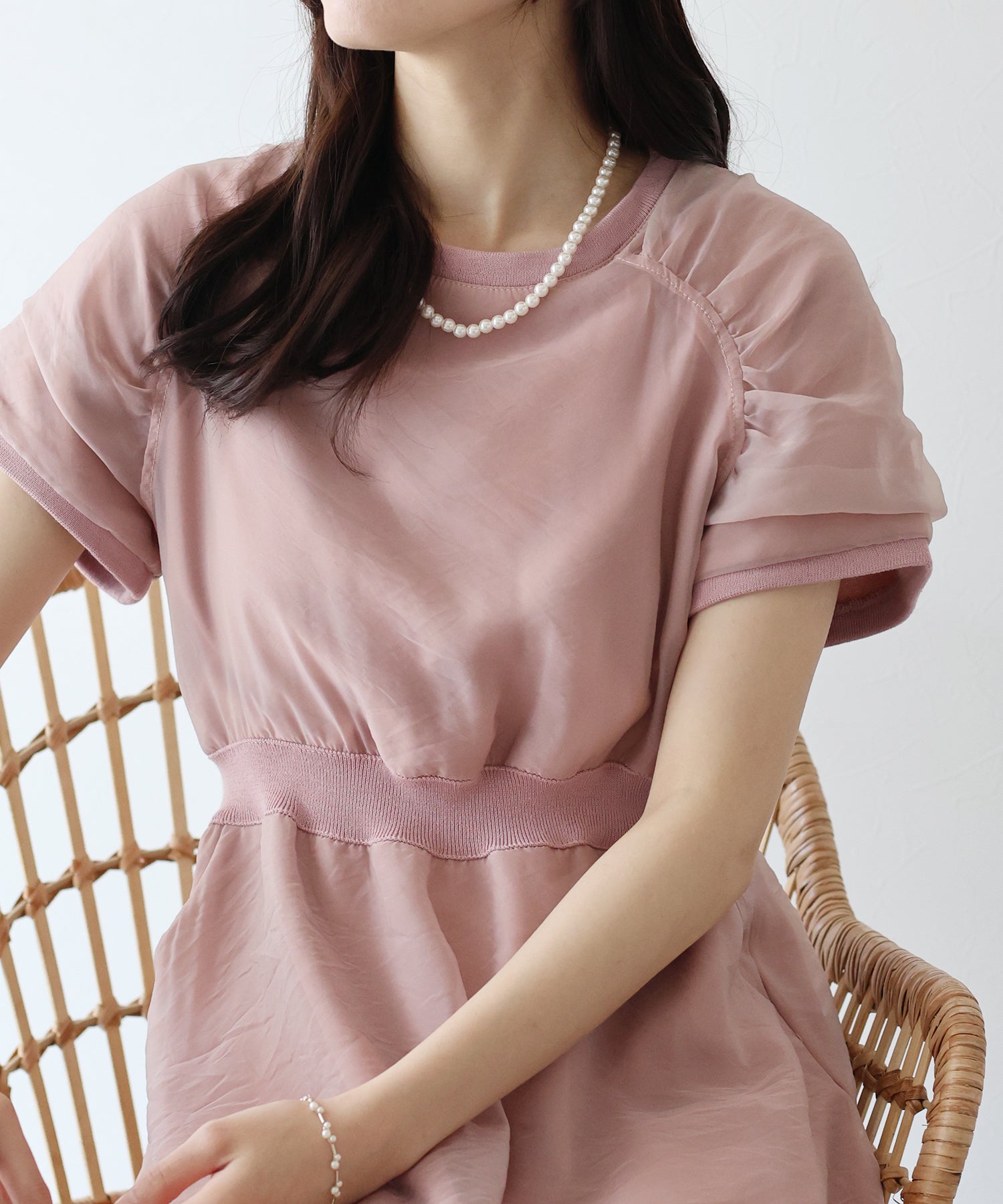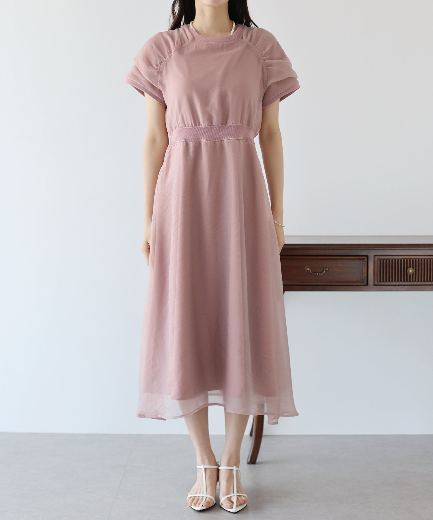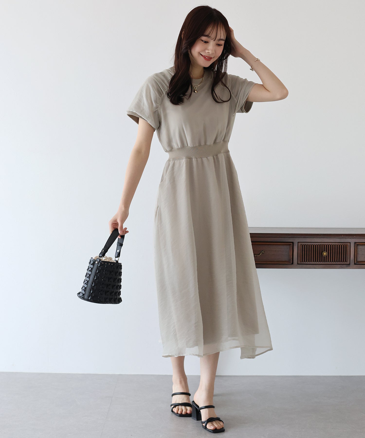 オーガンジー素材が魅力的なレイヤードワンピース ?POINT 1枚着るだけでサマになるオーガンジーレイヤードワンピース。 カジュアルなスエット素材のワンピースに、オーガンジー素材をレイヤードし フェミニンなムードをプラスしました。 高めのウエスト位置で切り替えたデザインなので一枚でスタイルアップ効果があり 余裕のあるサイズ感のスリーブで二の腕をカバーし、スカート部分のウエストゴムで自然に体型カバーを叶えます。 忙しい朝も即コーディネートが完成する時短ワンピースです。