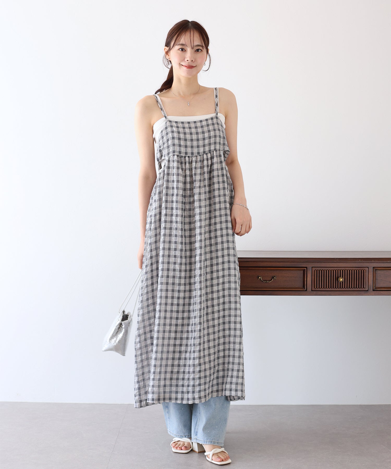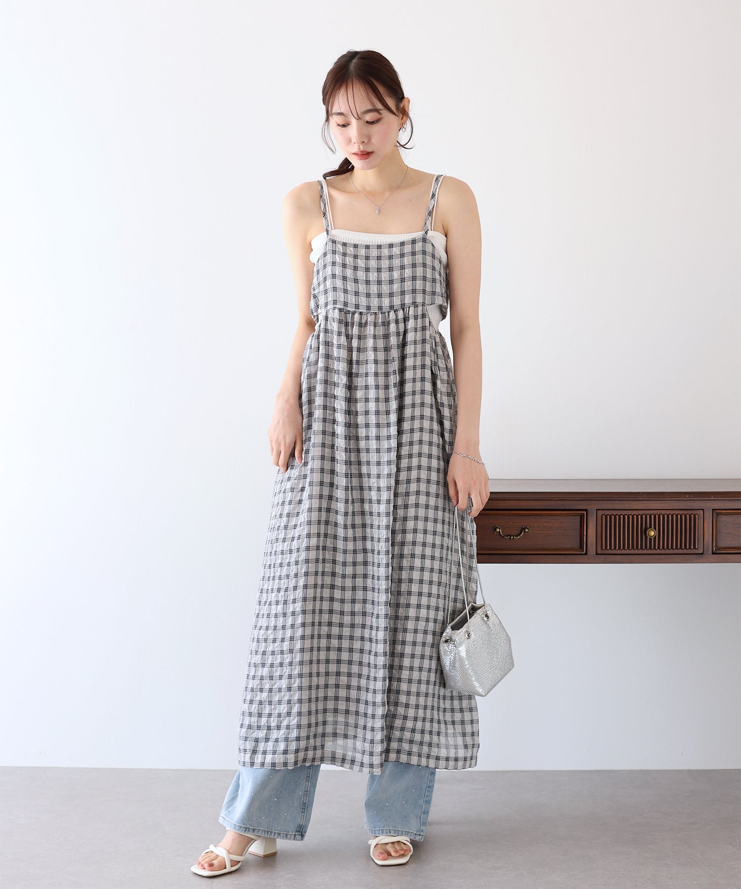 カジュアル×可愛いチェック柄のキャミワンピ ?POINT 旬のキャミワンピースから春夏らしいチェック柄が登場。 ぽこぽことした表面変化のある涼しげなムードのシアー生地に、キャミワンピの華奢な肩ひもでキュートな抜け感を演出してくれます。 チェック柄でカジュアルに仕上げつつもウエストのスリットでセクシーさをプラス◎ 後ろに部分的にゴムを使用し、スカートはふんわりと広がるフレアシルエットなので、メリハリをつけながら下半身の体型カバーまで期待できます! 肩紐にアジャスターが付いているので長さはお好みで調節可能◎ コーデの主役にもなる涼しげなカジュアルアイテムです。