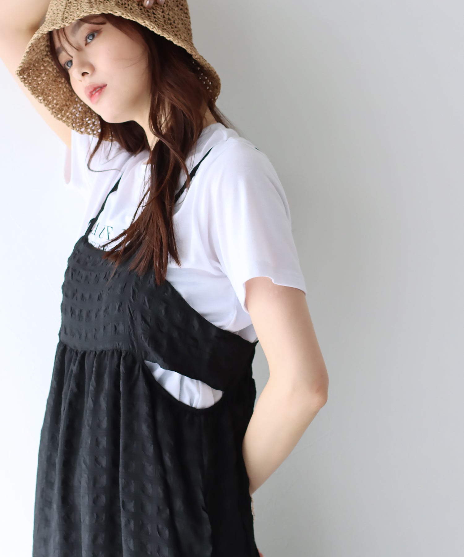 ?STYLING ボリューム感が可愛いデザインなので、インナーは華奢なキャミソールやブラトップを合わせて ワンピースをメインで着ると涼しげな夏コーデに。 ワンピースの上からシャツを羽織るのも◎ 中にTシャツやタンクトップをレイヤードするのもおすすめです! 春~秋口まで長く着られながらも、下半身の体型カバーまで出来るカジュアルなワンピースです。