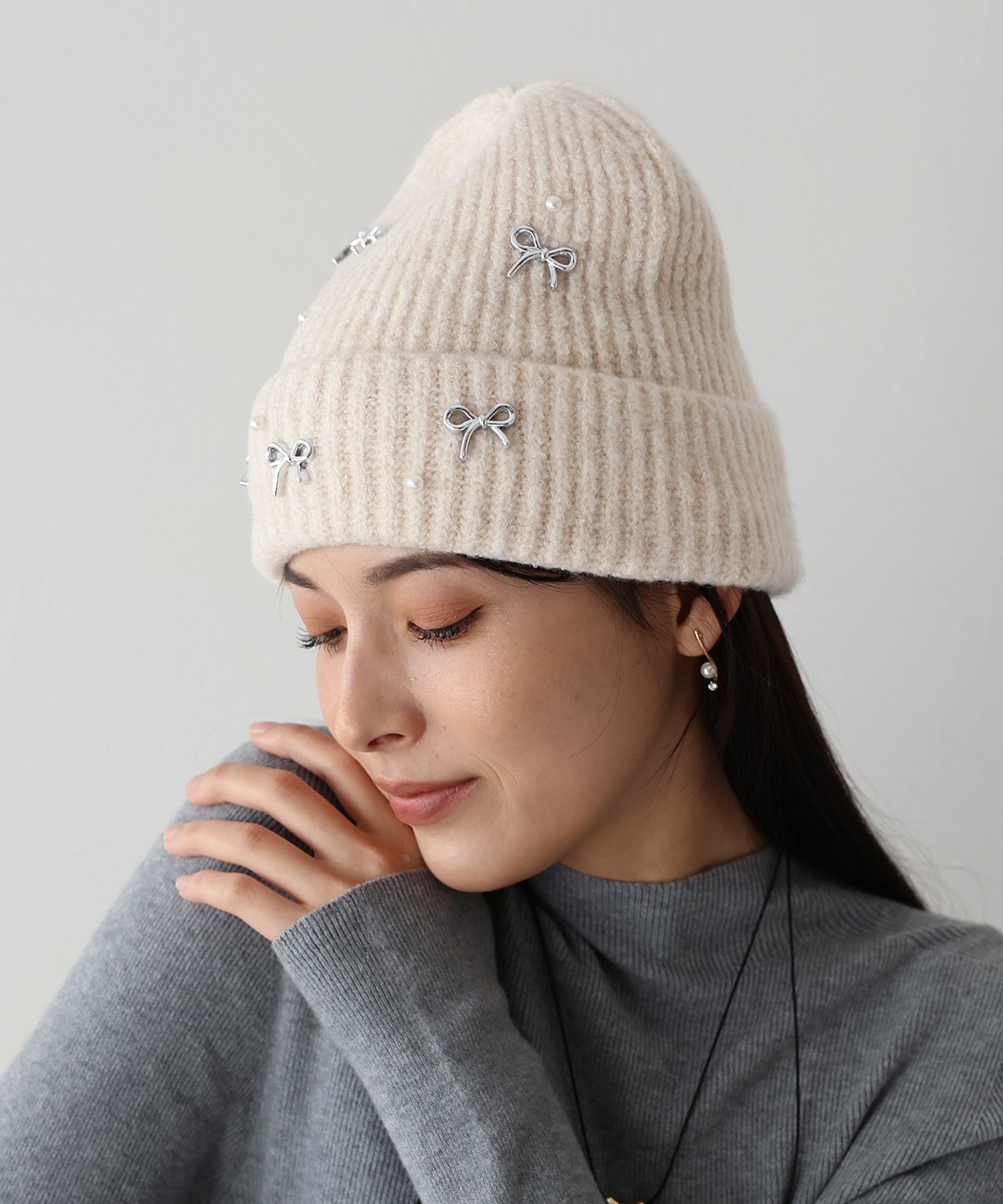 パール&リボンデザインがニット帽でもカジュアルすぎず女性らしい印象にしてくれます。