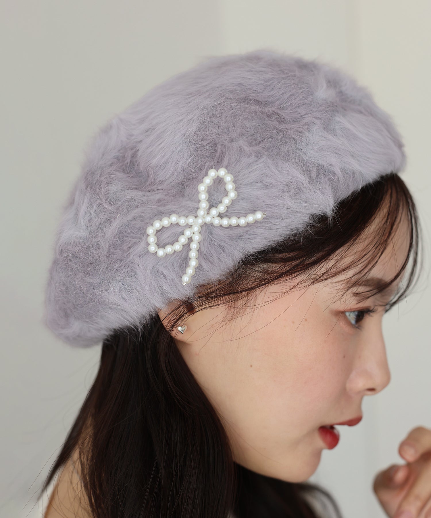 ふわふわのファーにパールリボンを付けたフェミニンなベレー帽