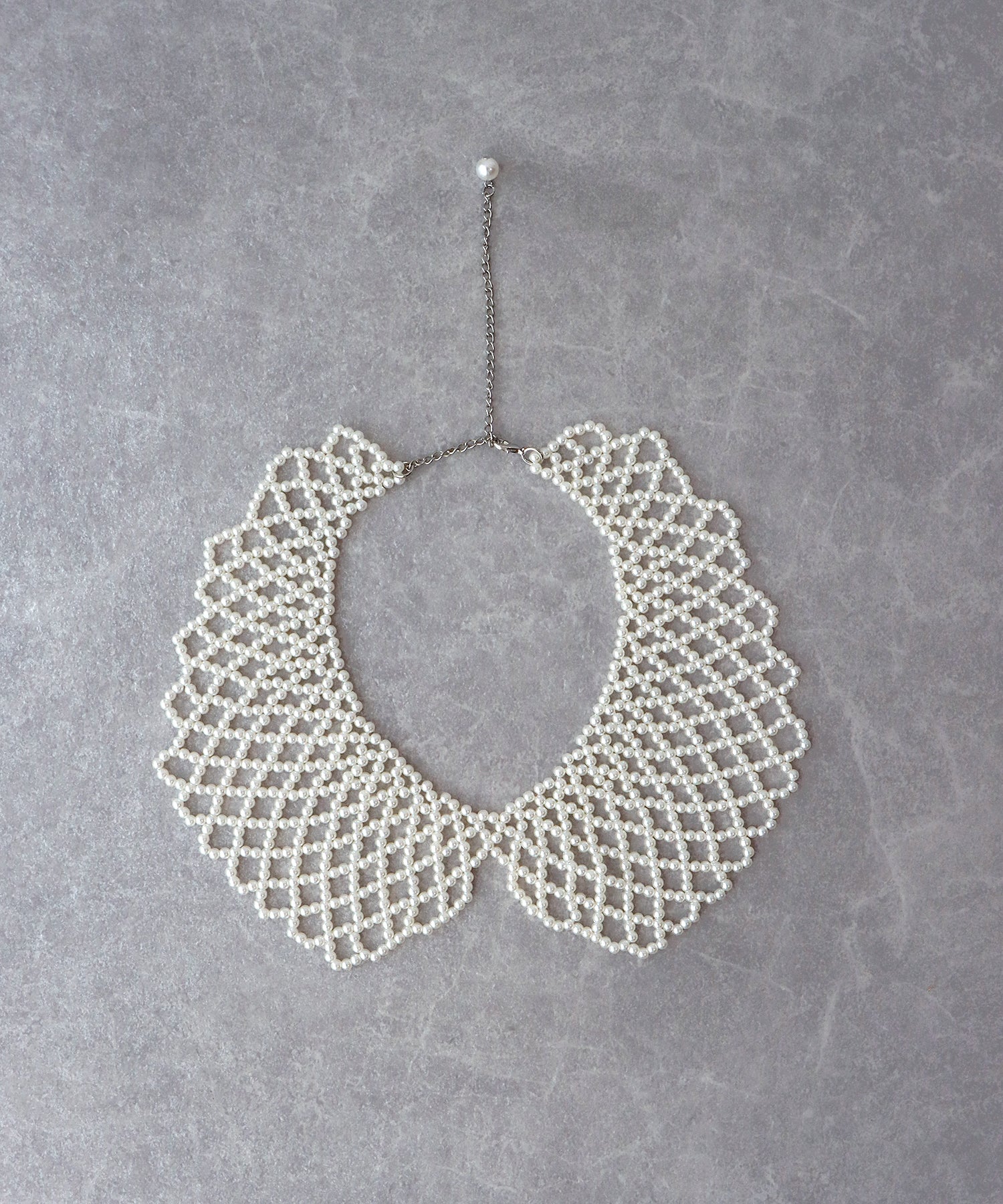 トレンドの付け襟をパールで仕上げたネックレス ?POINT 首元を華やかにしてくれるレースのようなつけ襟デザインのパールネックレス。 肌なじみの良いなめらかな光沢のパールが上品でクラシカルな雰囲気。 手持ちのお洋服の印象ががらりと変わり、1つ持っておくだけでコーディネートの幅が広がります。?