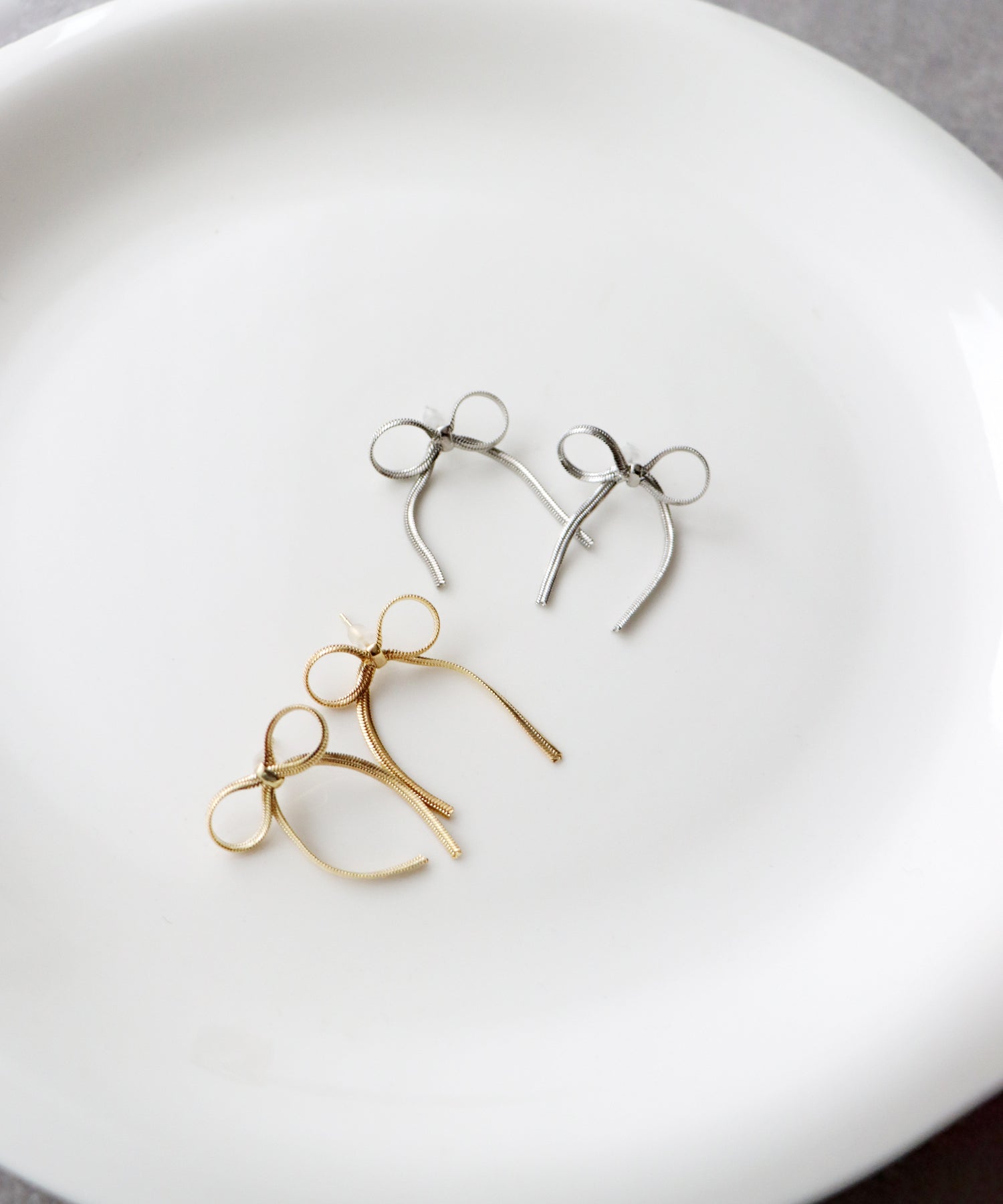 洗練されたリボンモチーフピアス ?POINT スネークチェーンでリボンを結んだようなデザイン。 ガーリーなモチーフでありながらもメタリックな素材感で、カジュアルなコーディネートにも取り入れやすく 動く度に揺れるデザインは顔周りを華やかにしてくれます。 程よいサイズ感でどんなコーディネートにも合わせやすく、旬な印象を与えてくれるアクセサリーです。
