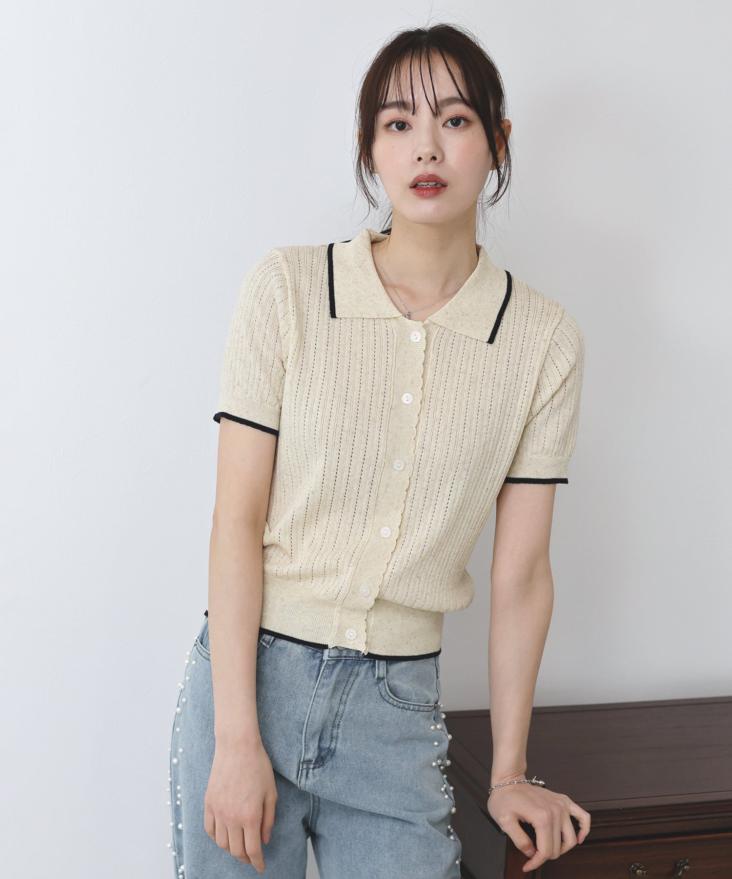 ?DETAIL ポロ襟 バイカラー ボタン開閉 前立てスカラップ