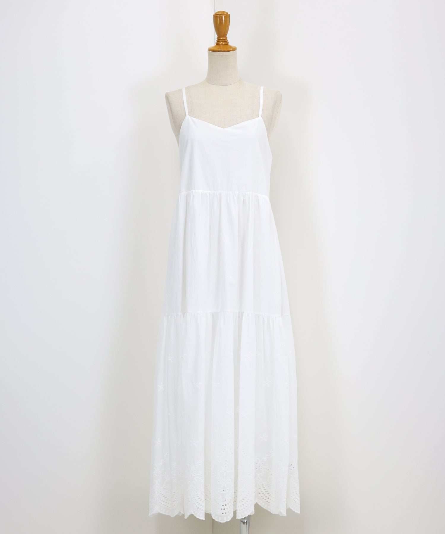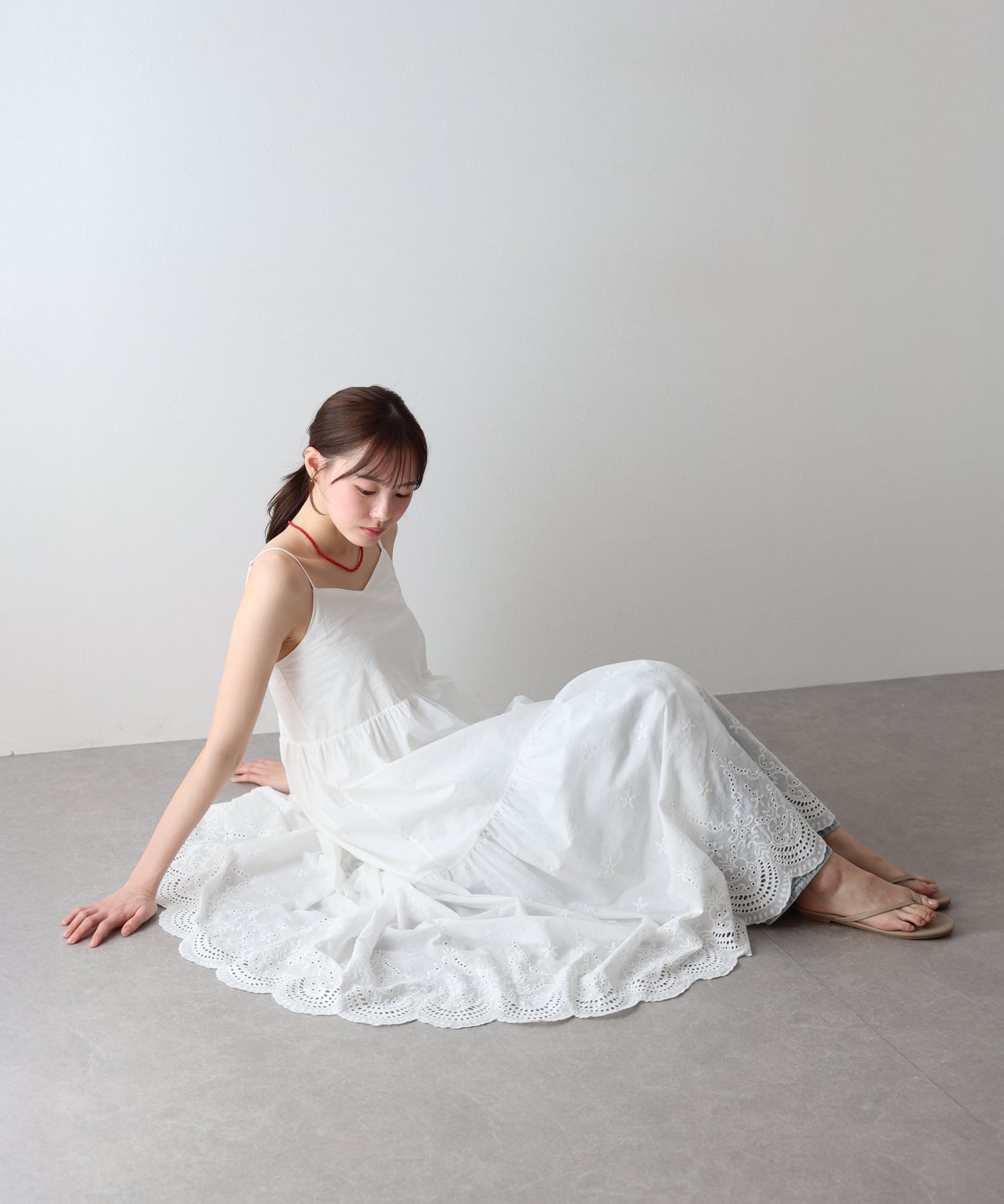 ?POINT ナチュラルな風合いが魅力のコットンティアードキャミワンピース。 軽やかなコットン素材に、動くたびにふんわり広がるティアードデザインがフェミニンな印象を演出します。 裾には繊細な花柄刺繍とカットワークレースが施され、可憐で上品なアクセントに。 バックラインにはシャーリングゴムを施し、フィット感がありながらも快適な着心地を実現。 さらにアジャスター付きストラップで、丈感を自由に調整できるのも嬉しいポイント◎ 裏地付きなので透けにくく、安心して着用いただけます。