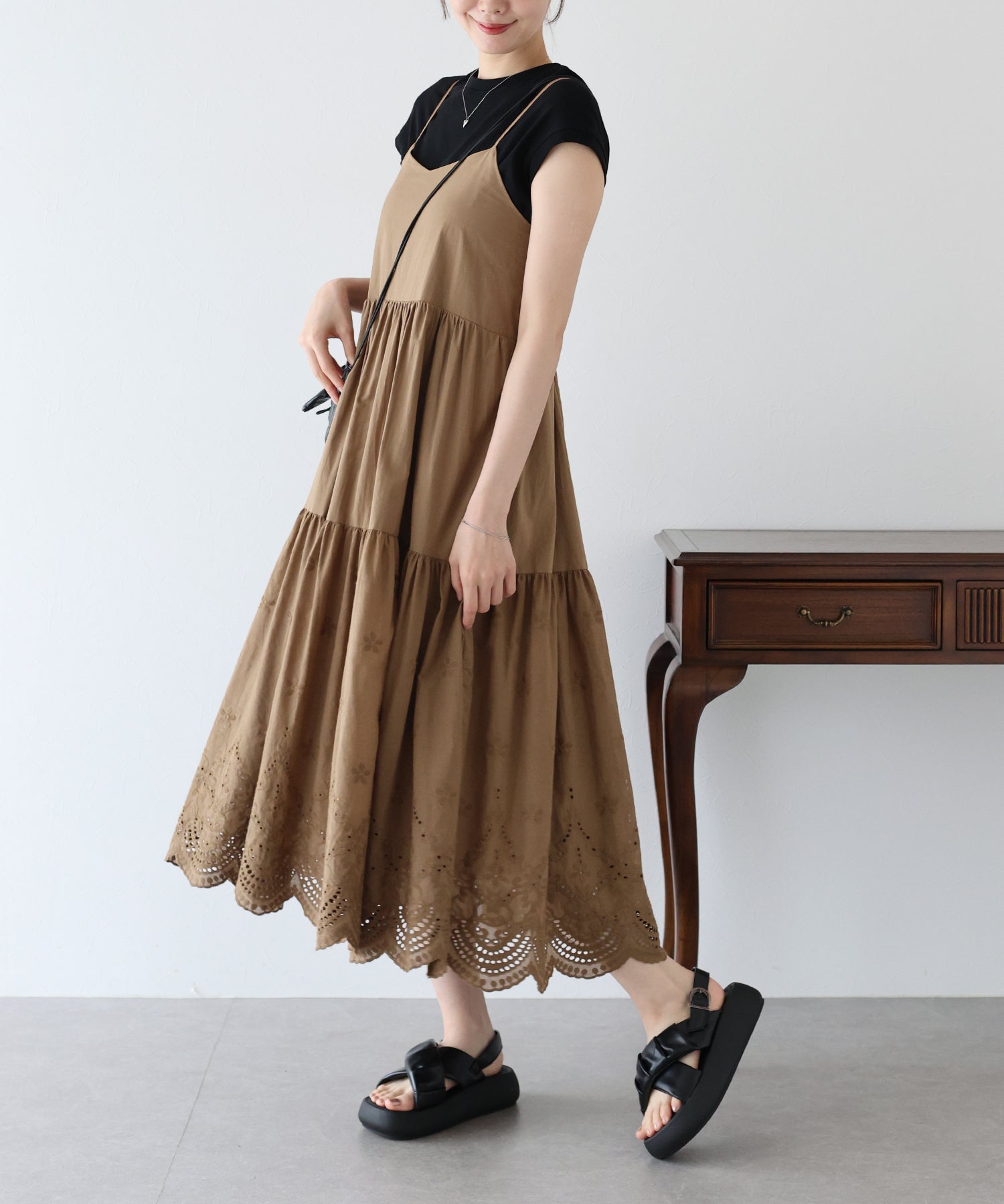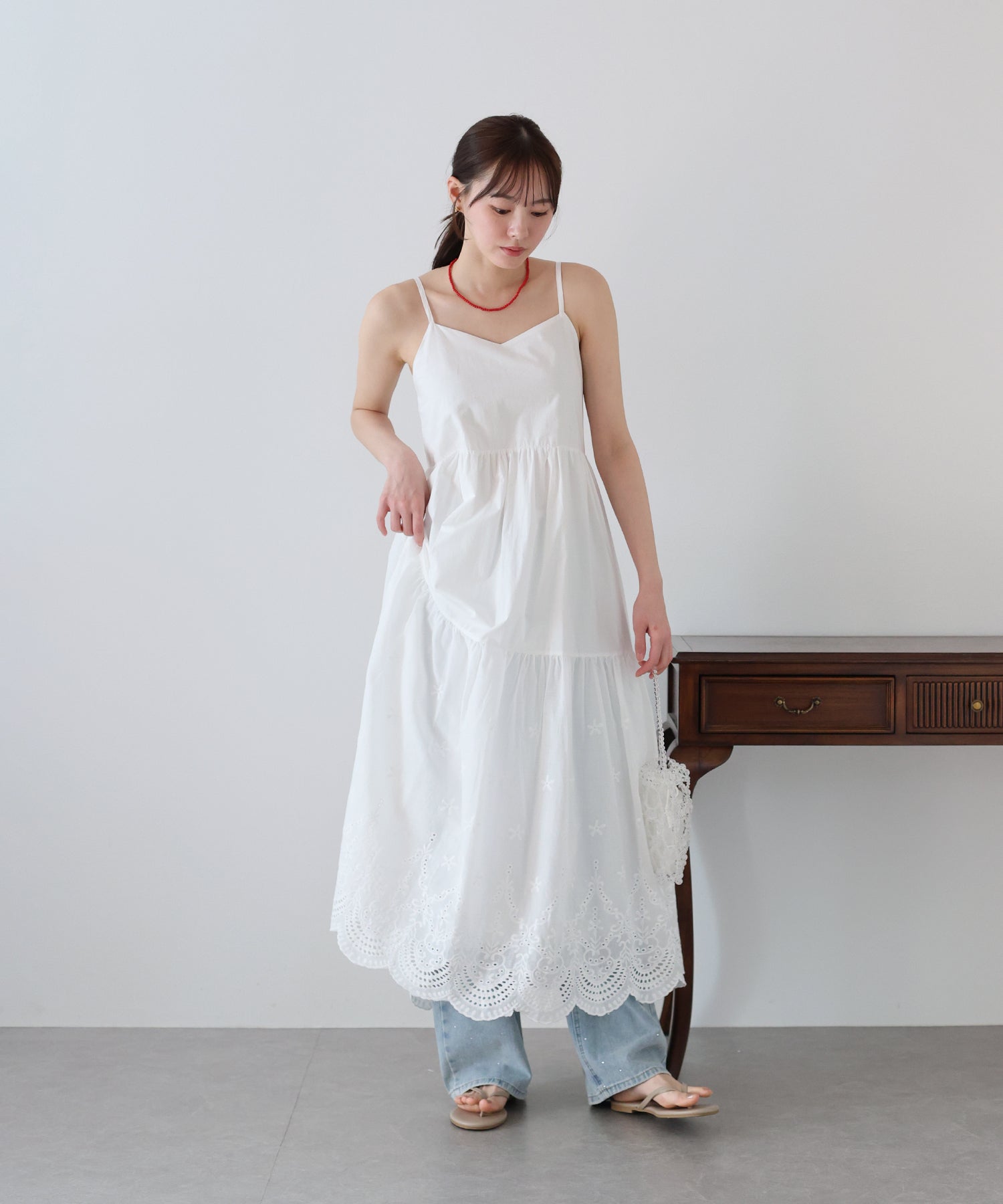 繊細な花柄刺繍が彩るナチュラルフェミニンなティアードキャミワンピース