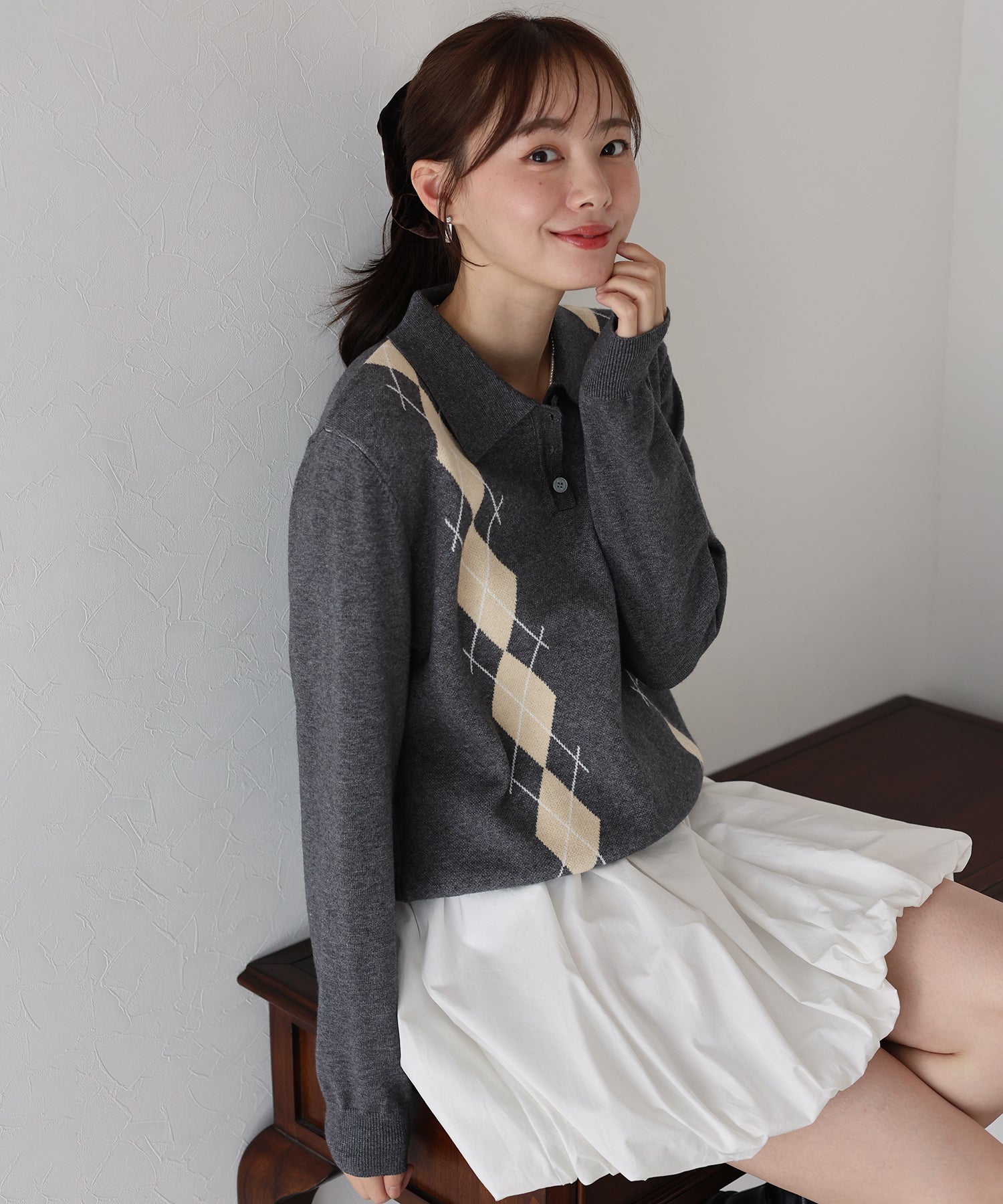 アーガイル柄が秋冬のムードを高めるポロ襟ニット。