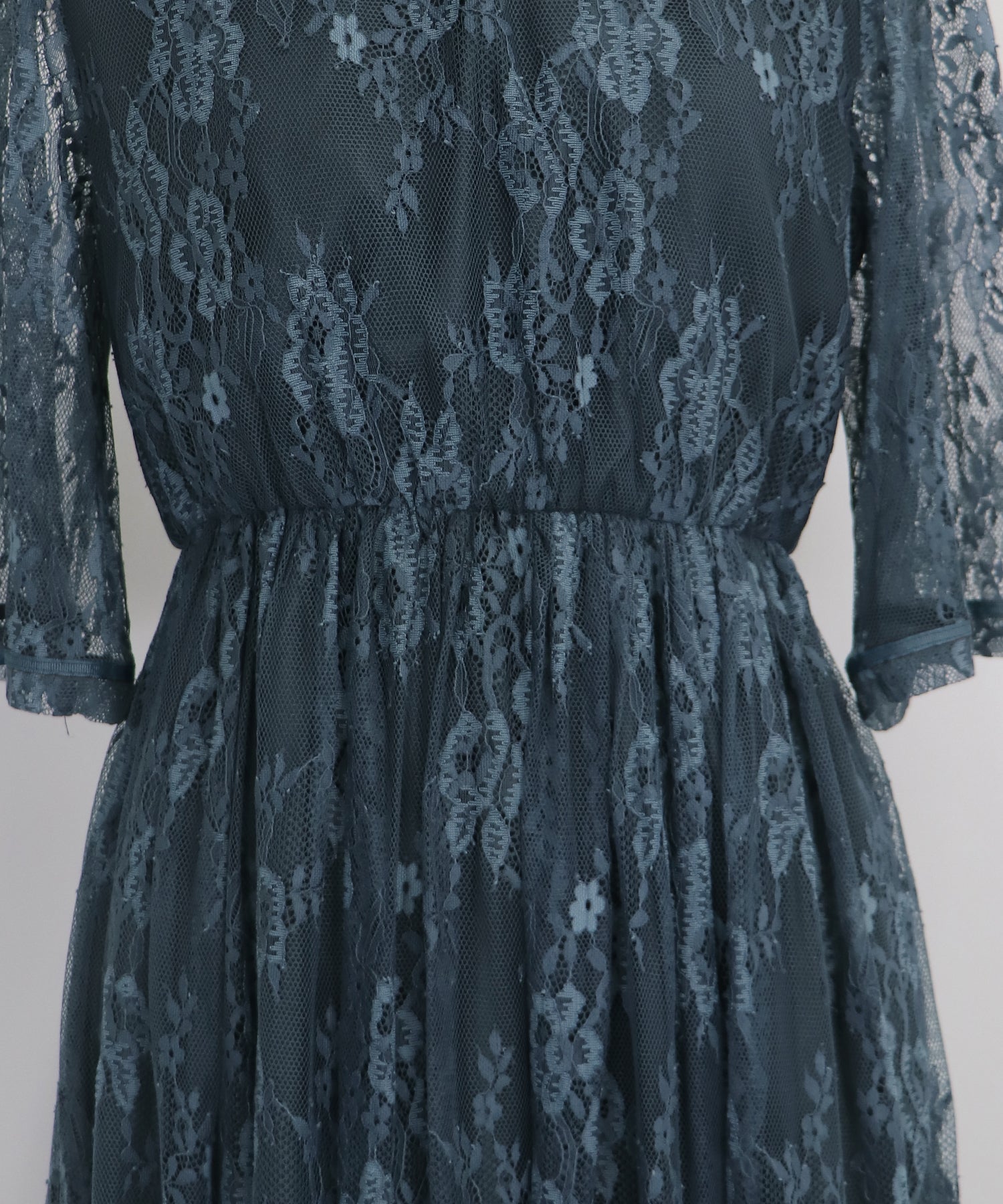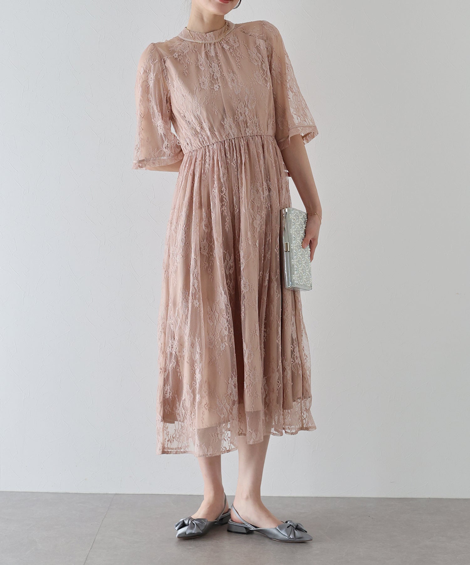 繊細な配色レースを使用し、総レースなのに甘すぎないハイネックデザインのパーティーワンピース?結婚式ワンピース