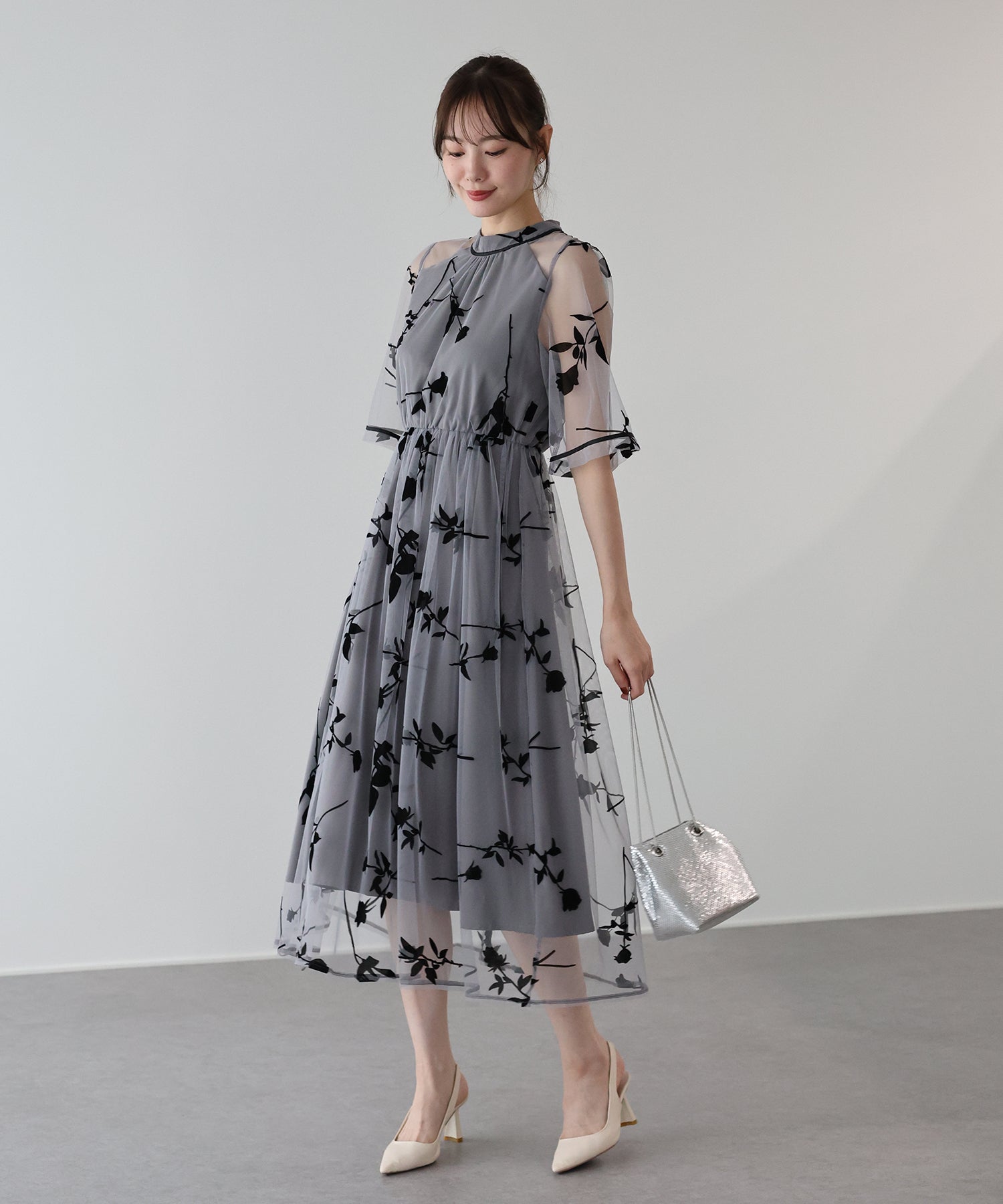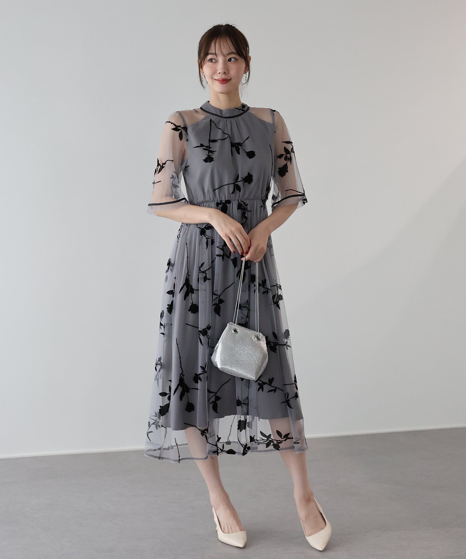 シアーな透け感は保ちつつ、あえて首元はハイネックに仕上げたことで上品でクラシカルな雰囲気。