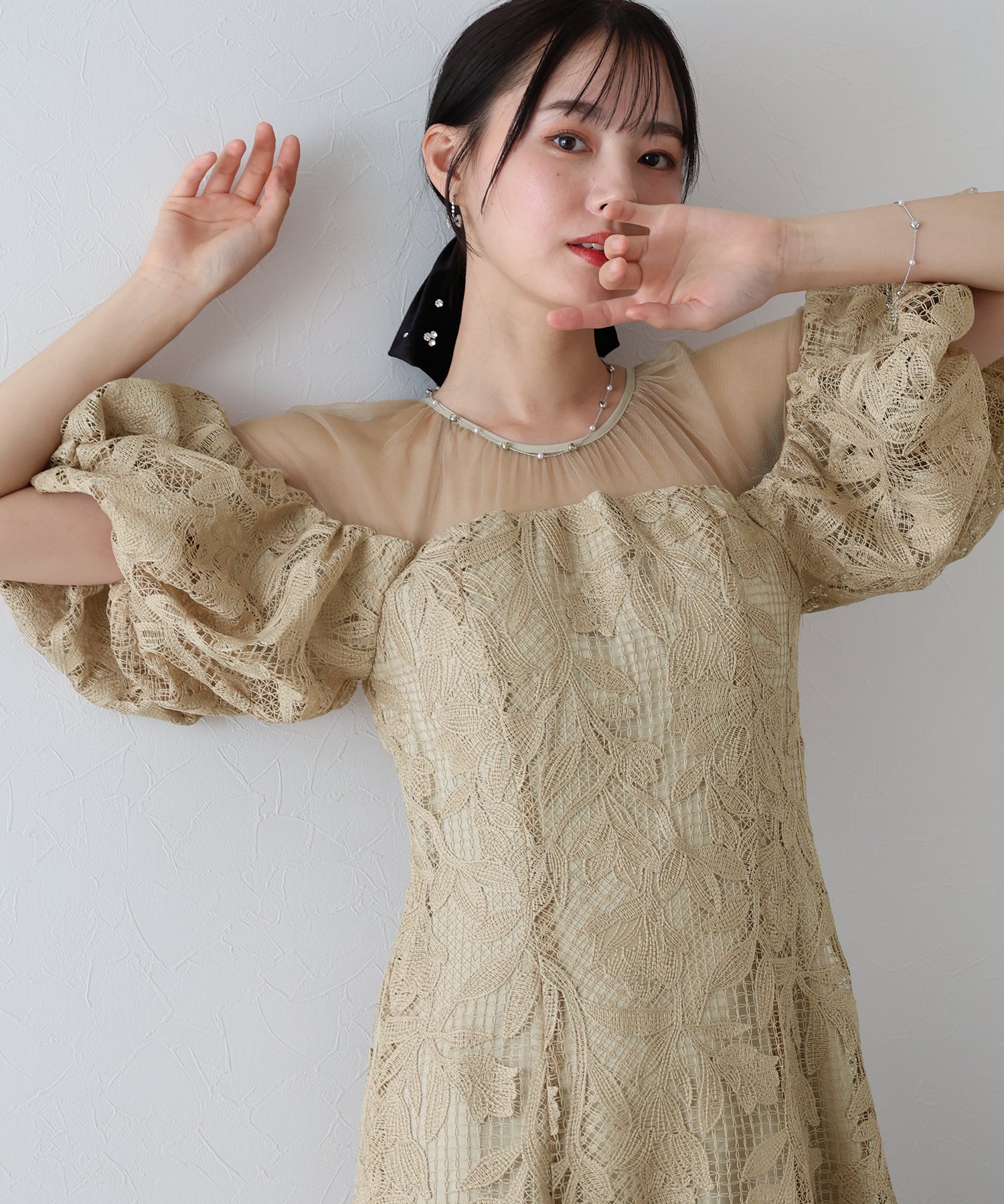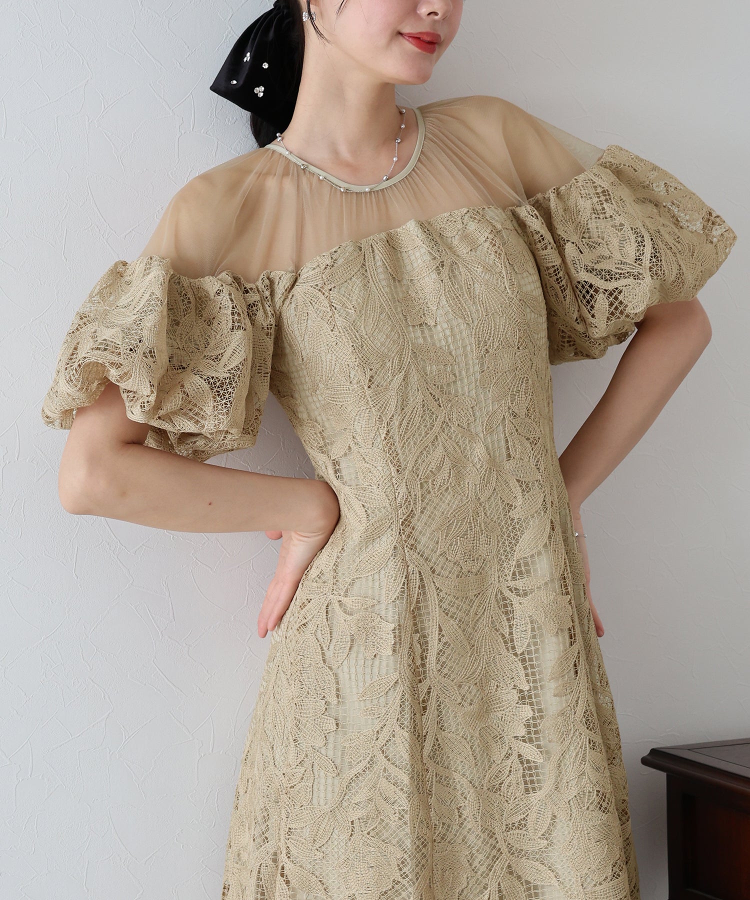 大人フェミニンなディテールが可愛いパーティーワンピース?結婚式ワンピース ?POINT フワッとしたボリュームがある袖が目を惹くオケージョンドレス。 ボリュームあるバルーン袖がポイント。 肩回りやデコルテ部分を程よいシアー感にすることで、女性らしさを引き立てます。 インナーカップ付きなので、一枚でさらっと着られるのが嬉しいポイント。 裾にかけて広がる緩やかなフレアラインは、動くたび優雅な印象を与えてくれます。 デイリー、オケージョンシーンなど幅広いシーンでご着用いただきたい1着です。