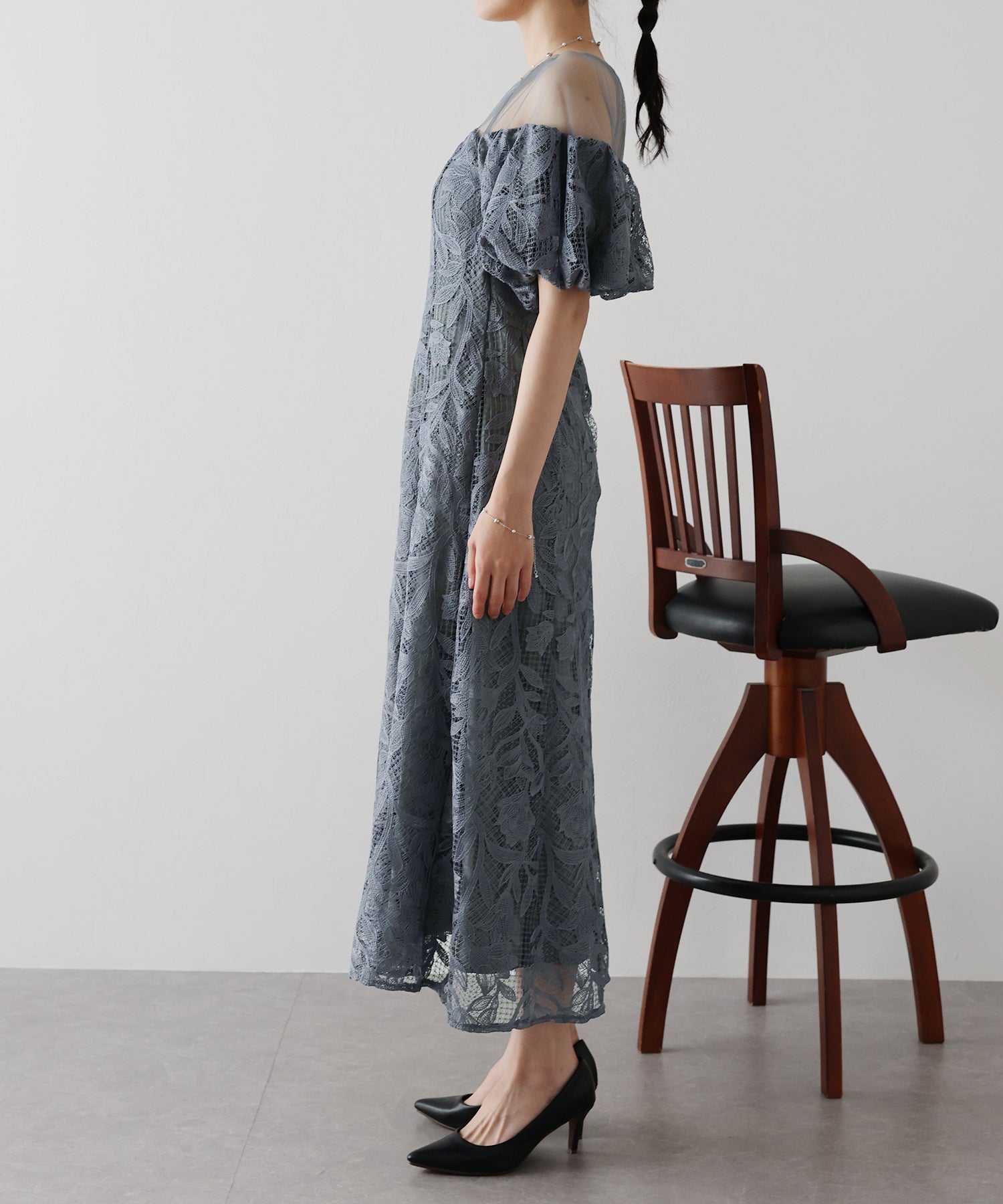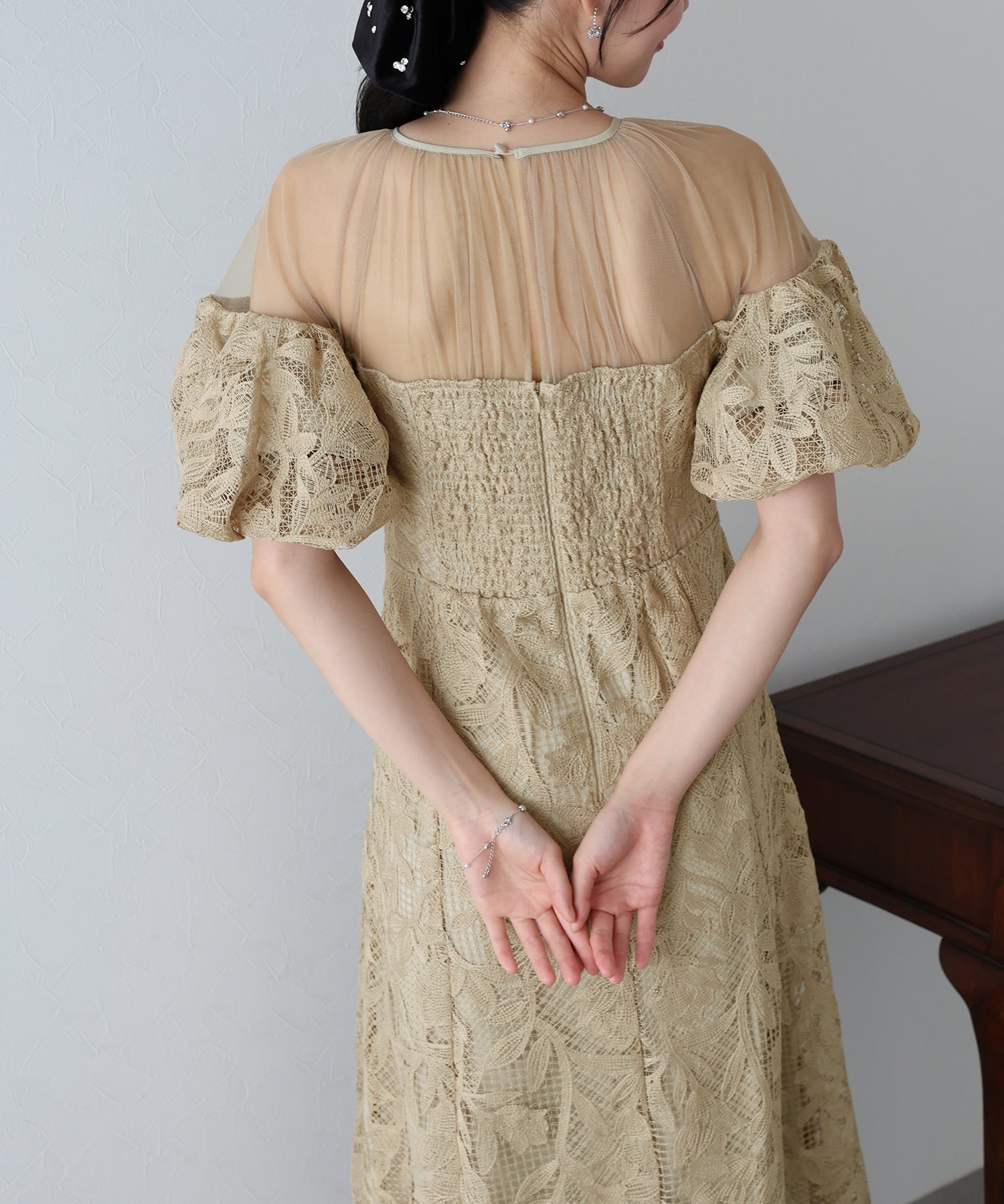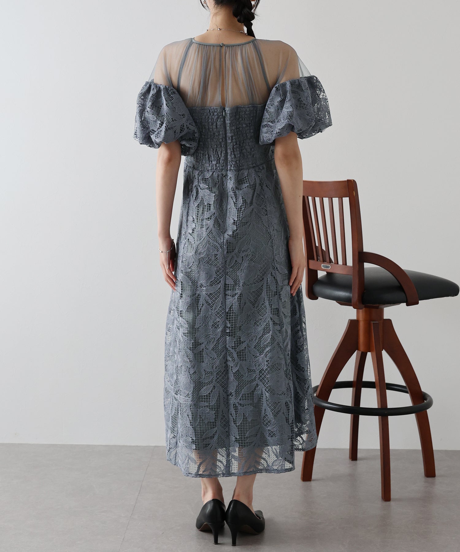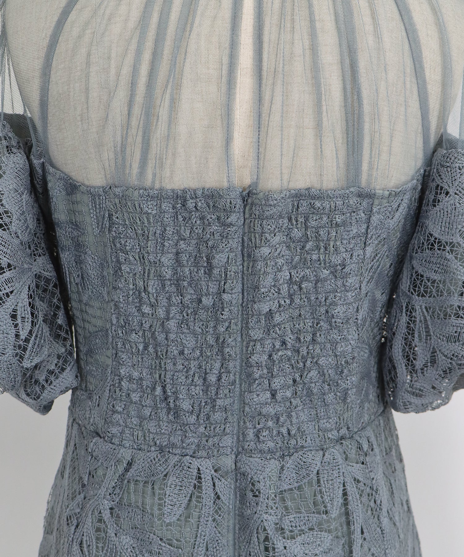 ?DETAIL 肩周り、デコルテ部分透け感あり バックウエストゴム仕様 バックファスナー付き インナーカップ付き 裏地あり