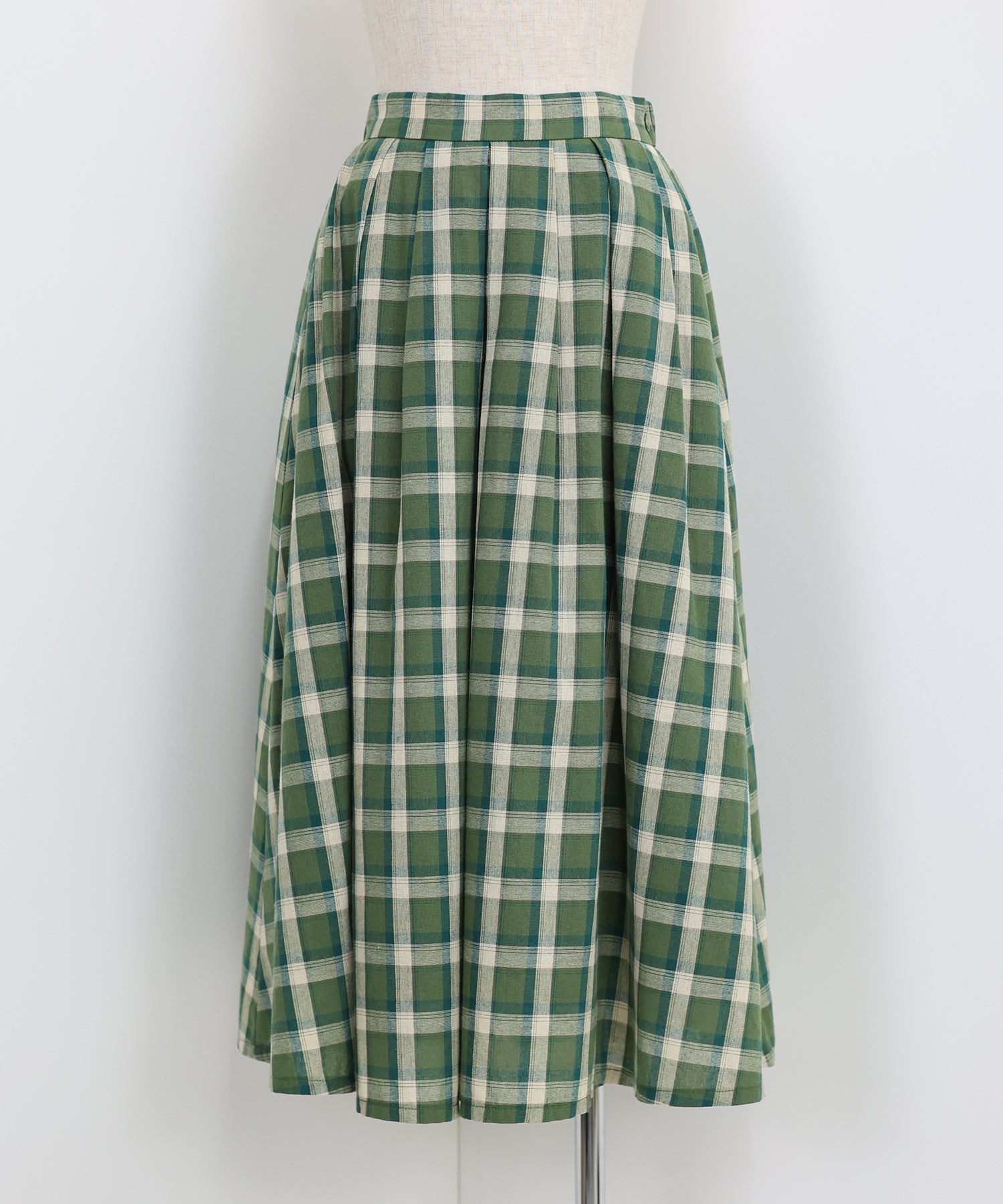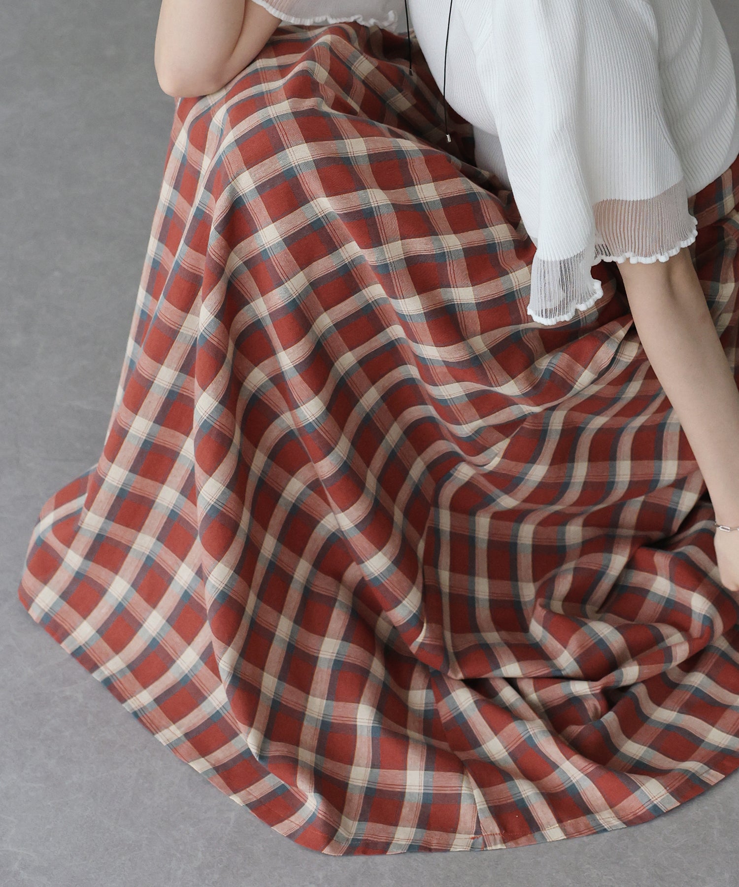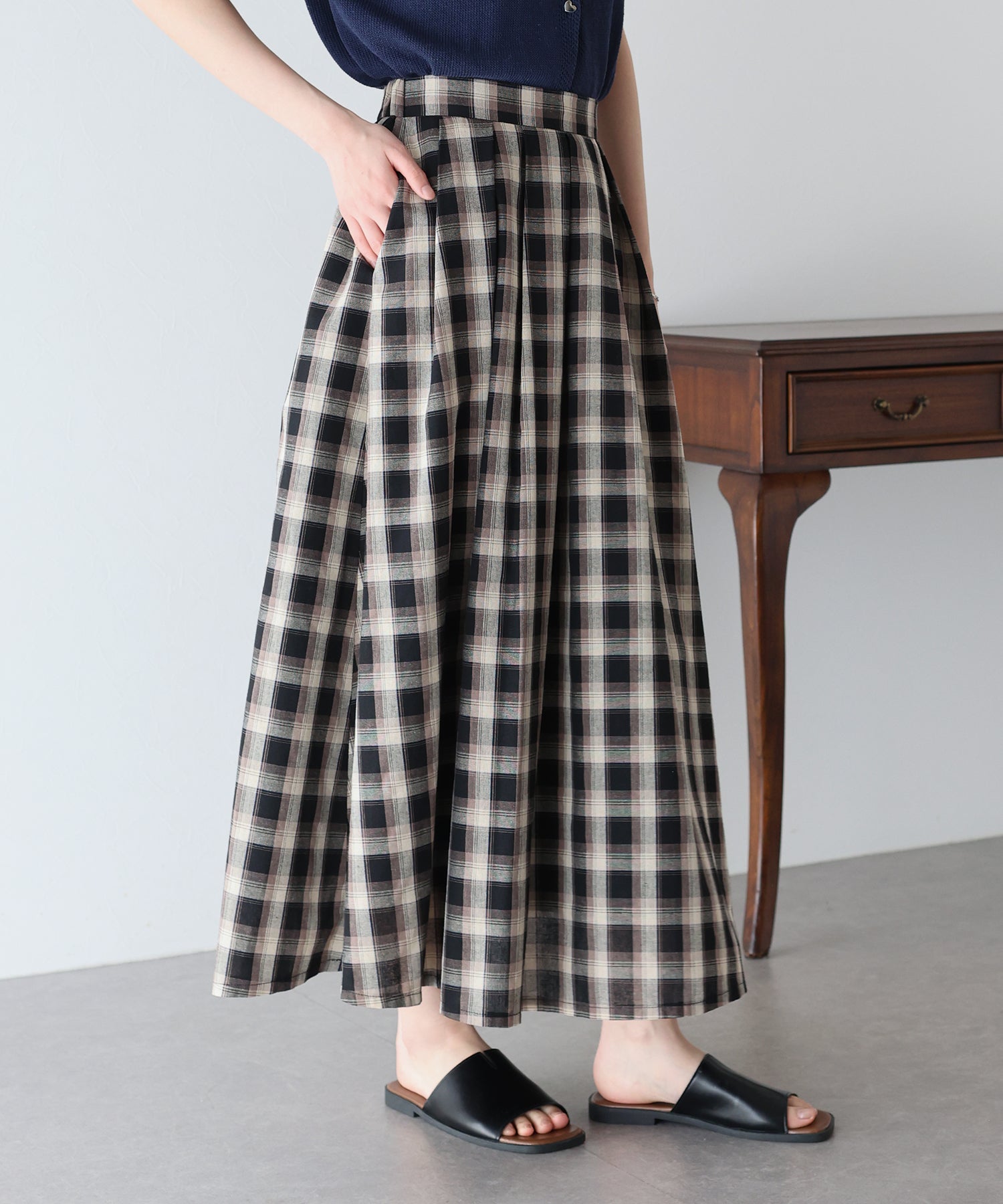 ?POINT 夏らしいさらっとしたチェック生地のフレアースカート。 スタイリングのアクセントになるチェック柄に仕上げました。 タックを入れきちんと感を演出。 バックウエストゴムとサイドファスナーで着脱しやすく、ストレスのない着心地でお楽しみいただけます。 裏地付きなので透けにくく、綿混素材なので春夏にぴったりの1枚です。