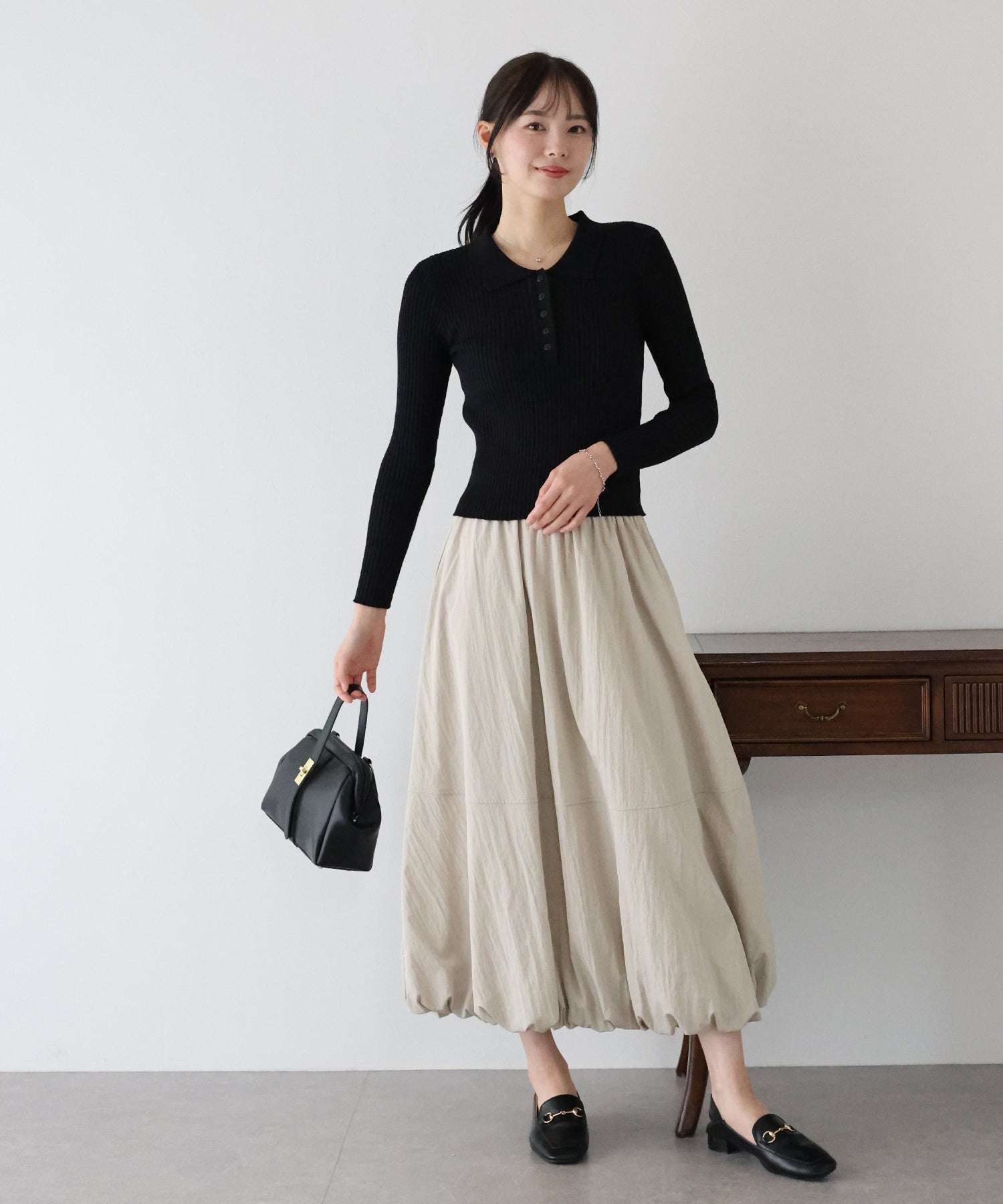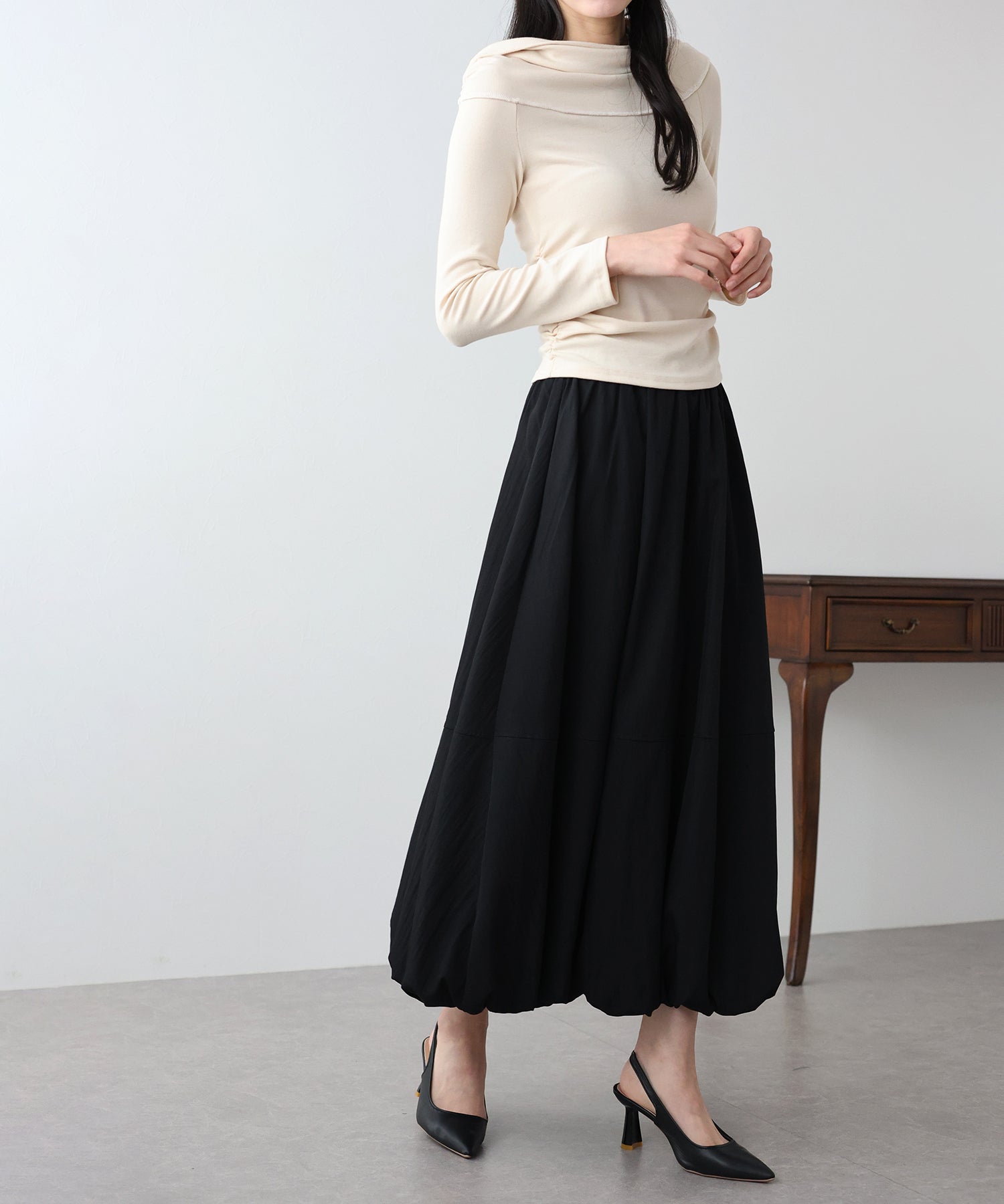 ふんわりと広がる立体的なバルーンシルエットが目を惹くロングスカート