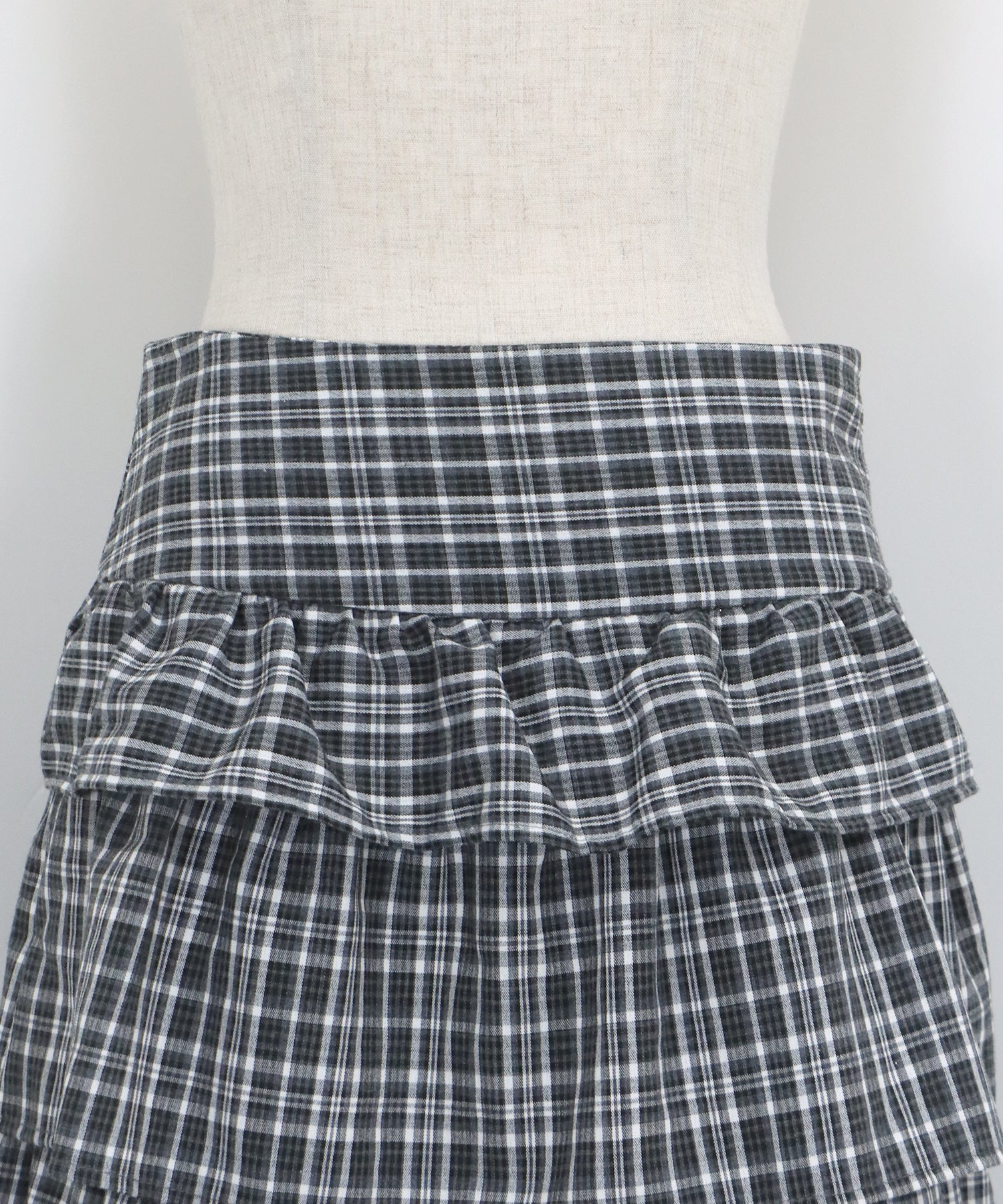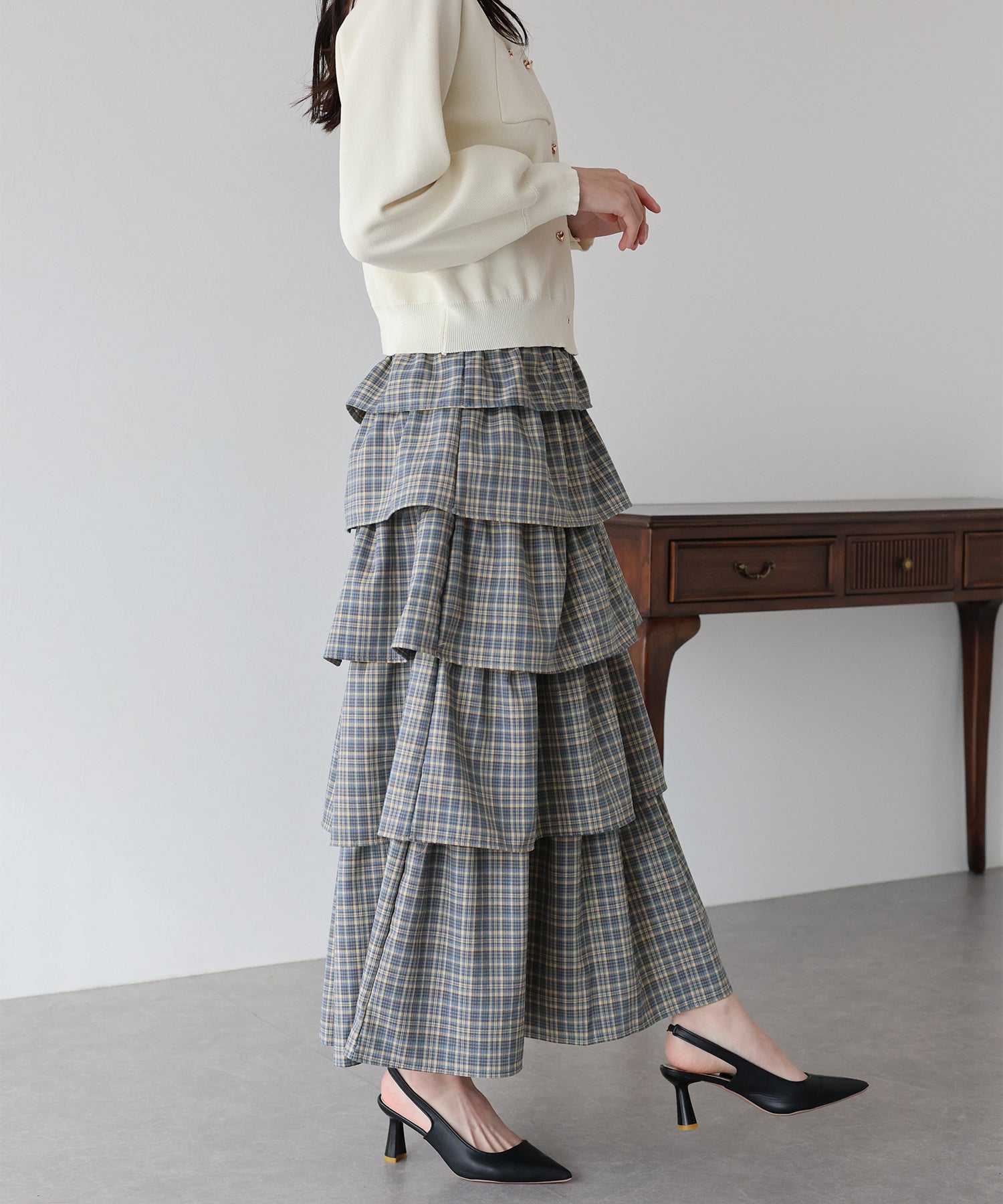 トレンド感のある5段重ねのフリルデザインと旬のチェック柄が華やかで、女性らしい印象で着用いただけます。