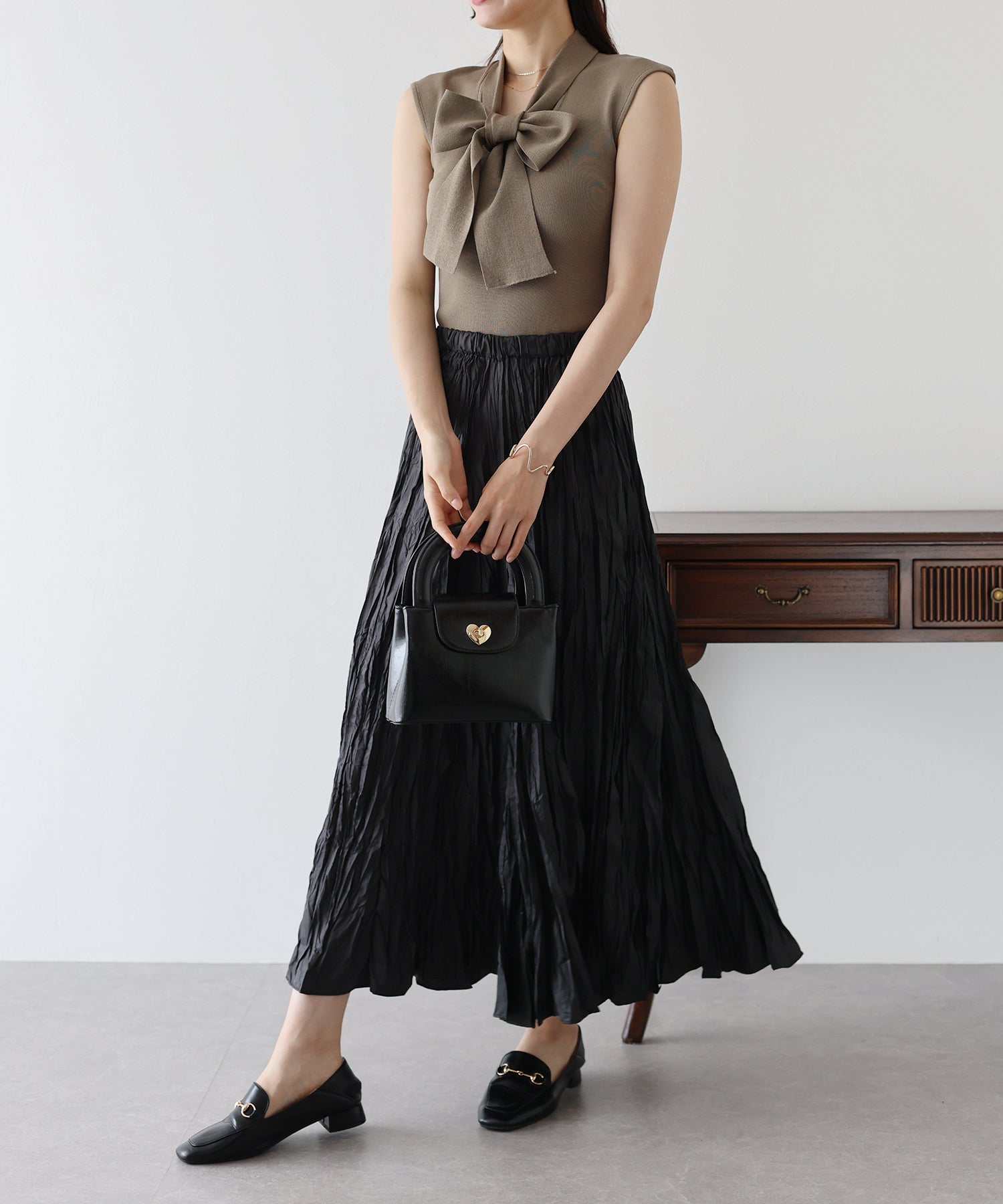 ふんわりと揺れるシワ加工されたプリーツで女性らしい雰囲気とこなれ感を演出し、着るだけでオシャレなコーデが完成します。