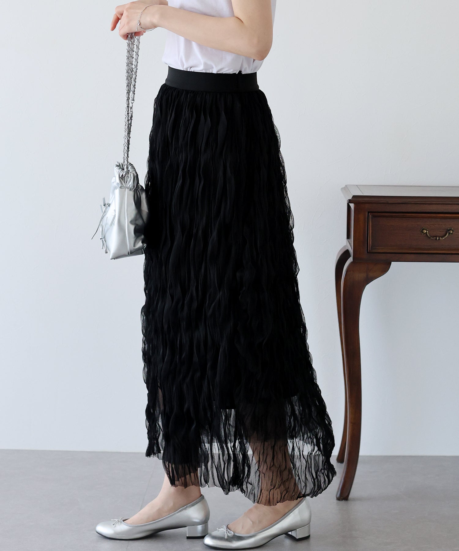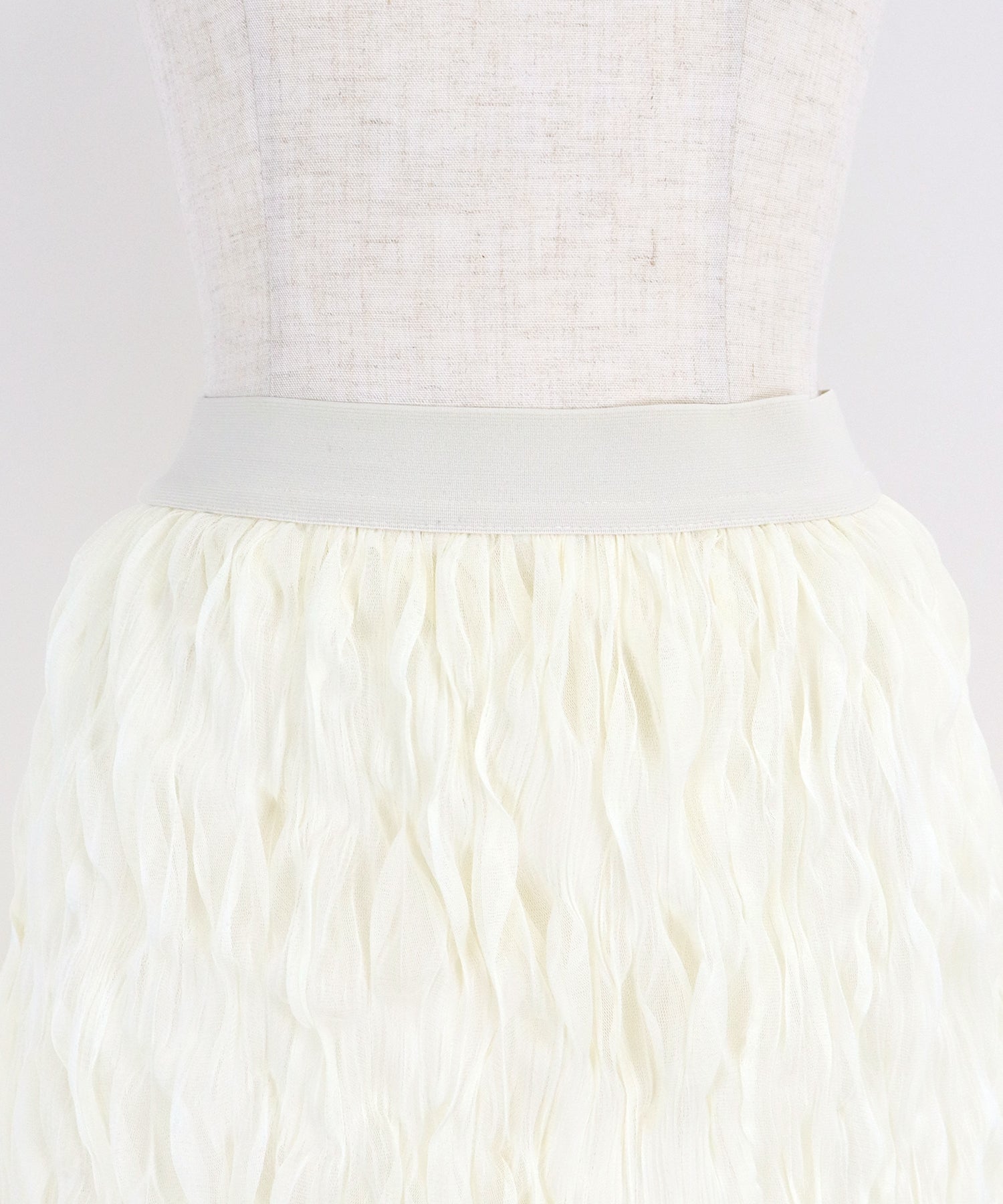 ホイップクリームのようなボリューム感のあるチュールスカート ?POINT ホイップをたっぷり絞ったようなボリュームとシアー感が華やかなチュールスカート。 チュールスカートには珍しいIラインシルエットで、身体のラインを拾いすぎずスッキリと見せてくれます。 ウエスト部分はゴム仕様なのでストレスなく着用いただけます。 シンプルなトップスに合わせるだけで華やかになる主役アイテムです。