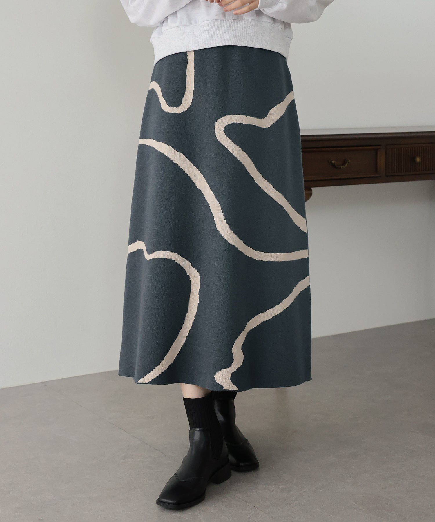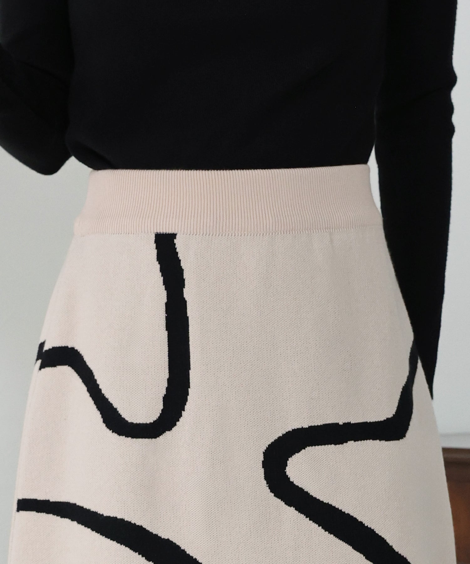 ?POINT ランダムな曲線が目を惹く、ニュアンス感漂うスカート。 大胆に入った配色ラインでインパクトのある見た目ながらも、 ベーシックな配色とすっきりとした台形のフレアーシルエットで大人っぽさをプラス。 優しい肌触りのニット素材&ウエストウエストゴムで履き心地も抜群◎ 厚みのあるしっかりとした生地感で暖かみもあり、秋冬の着こなしに華やかさを与えてくれる主役級スカートです。