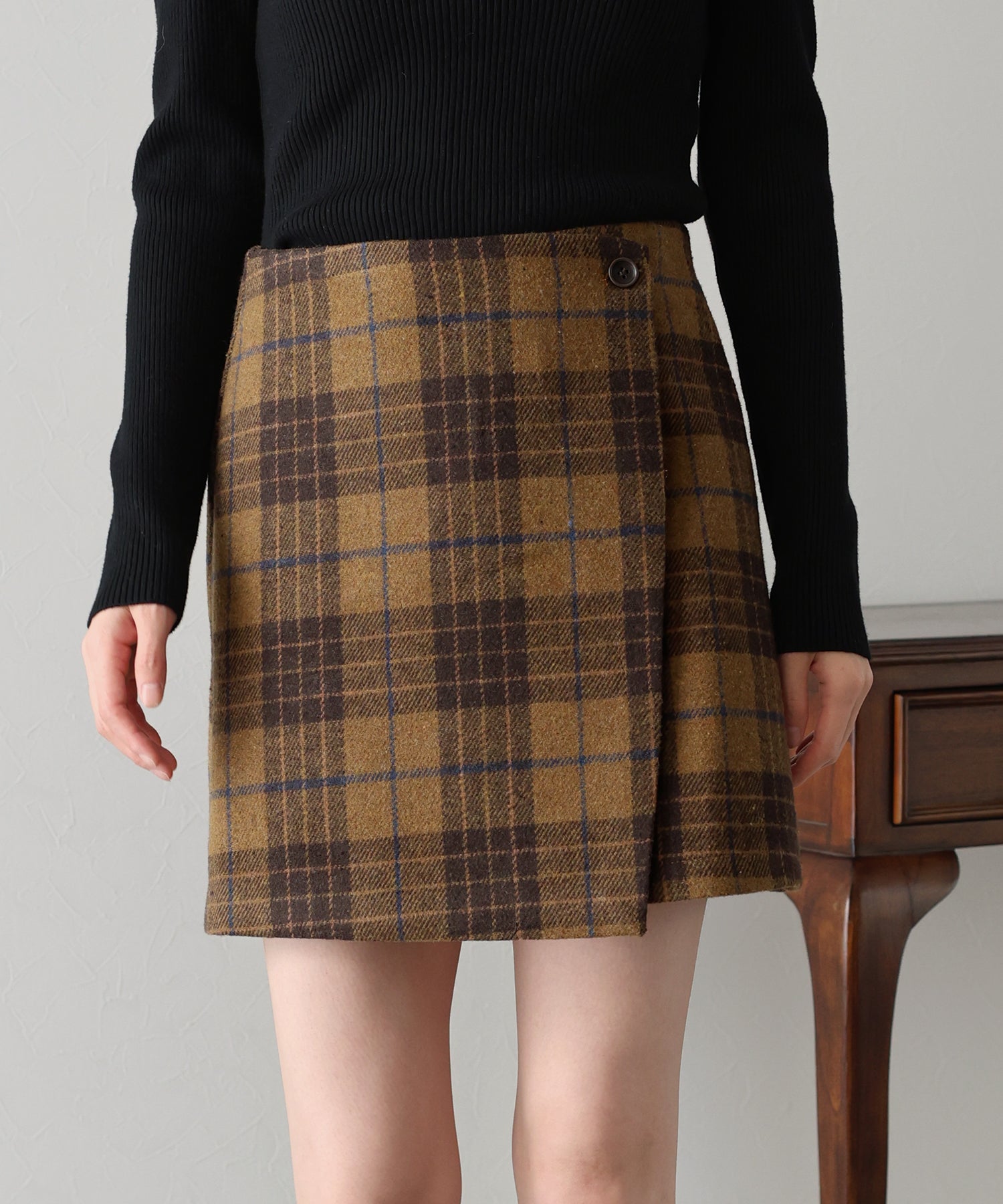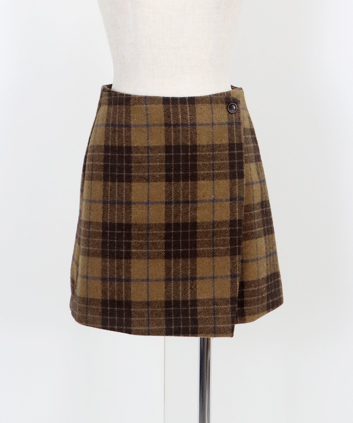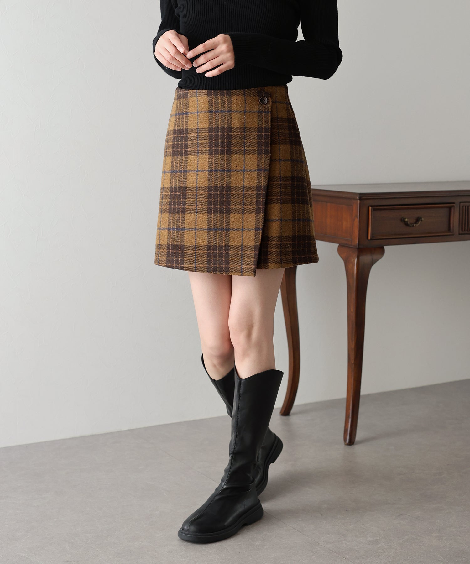 ミニ丈とチェック柄でカジュアル感を加え、ラップスカート風のデザインでおしゃれなポイントをプラス。