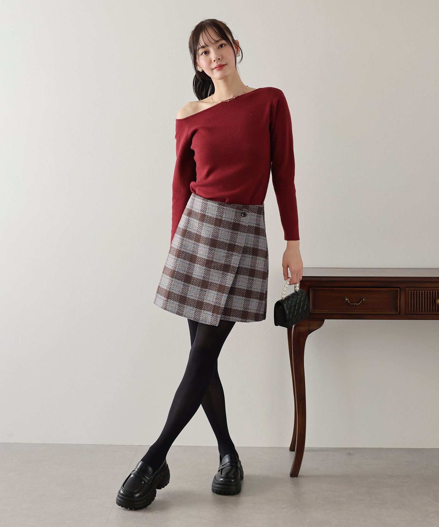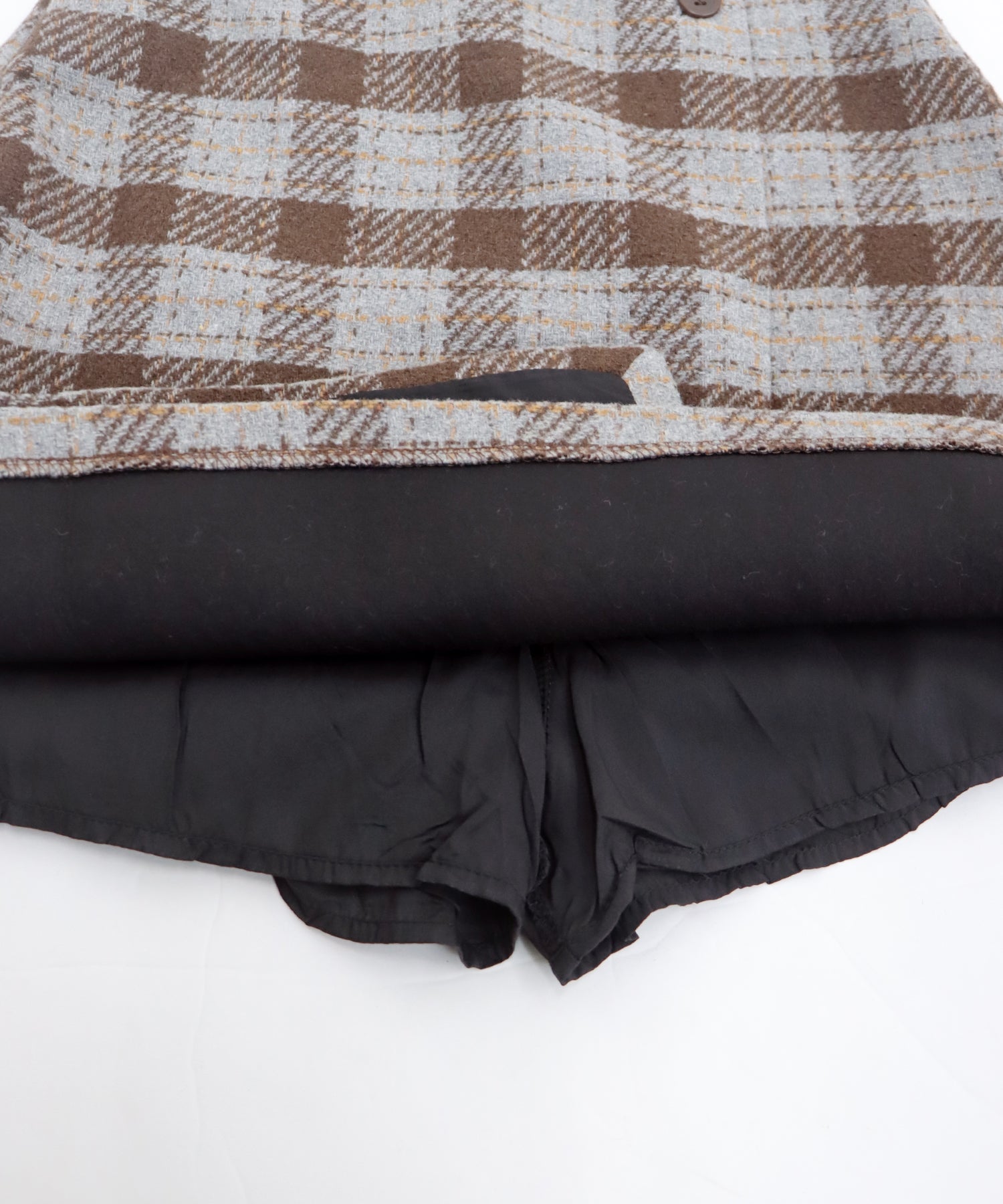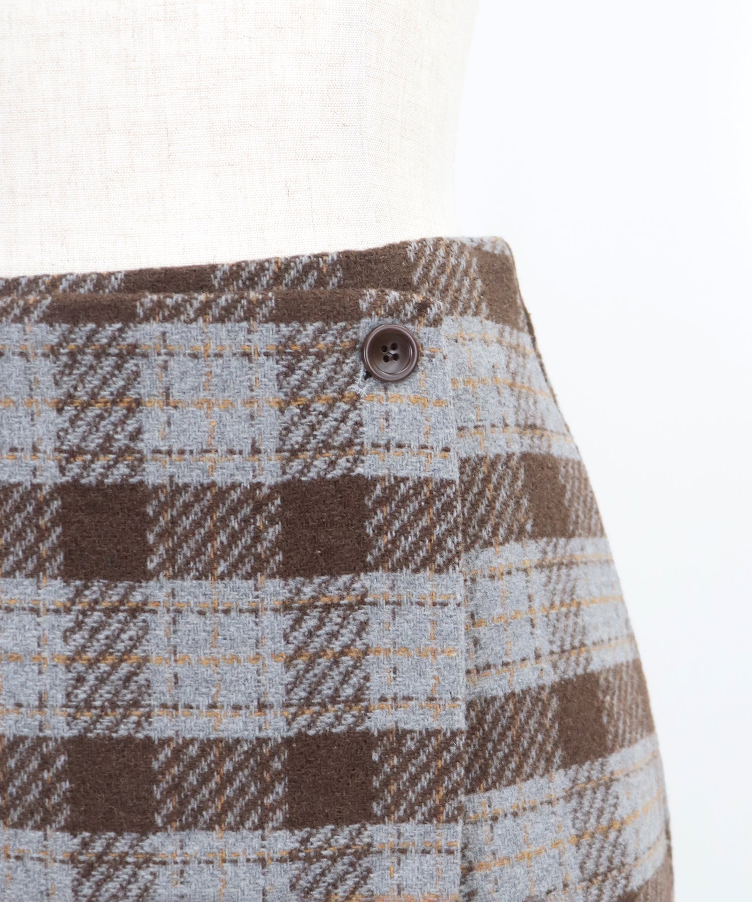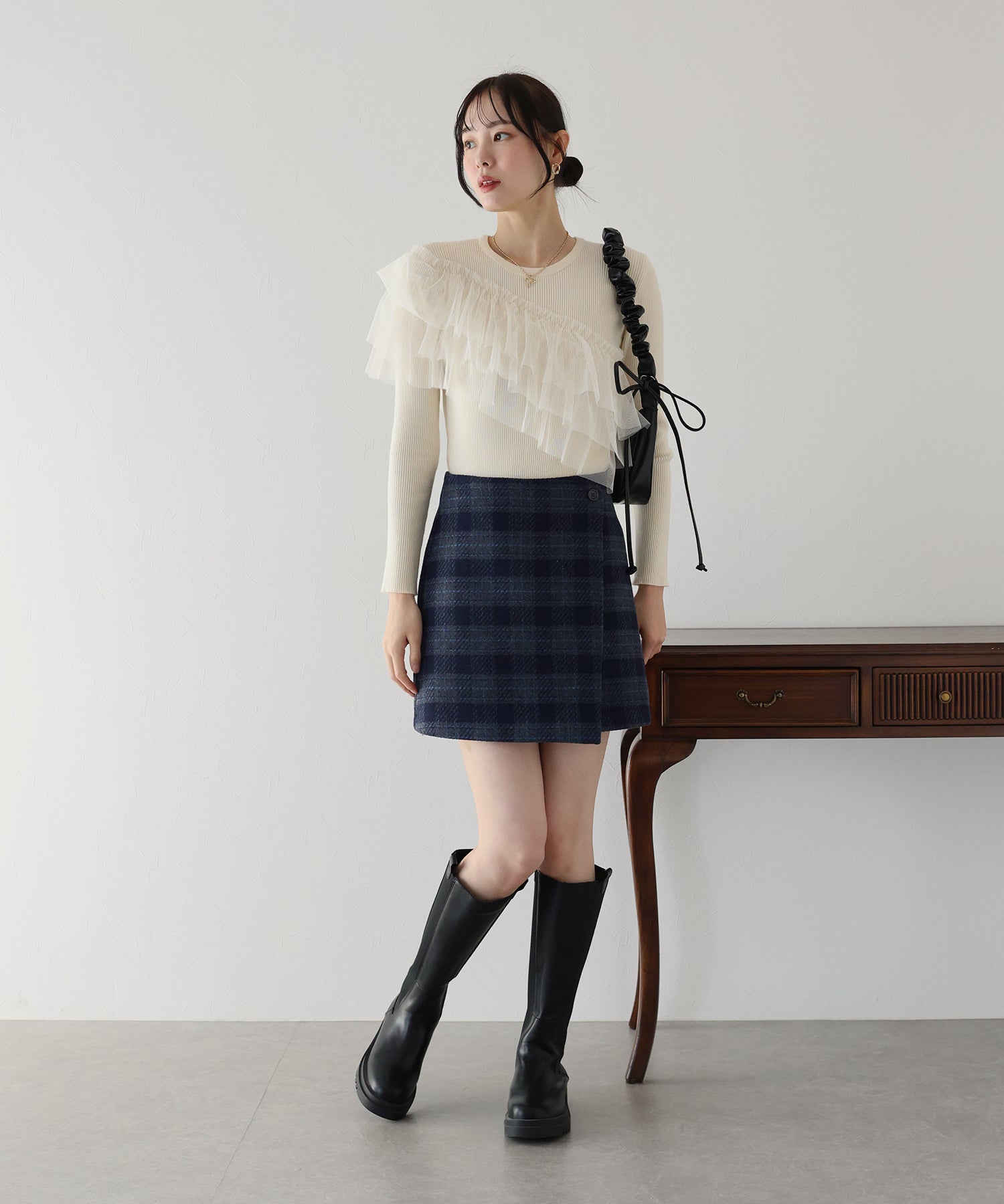 ミニ丈とチェック柄でカジュアル感を加え、ラップスカート風のデザインでおしゃれなポイントをプラス。