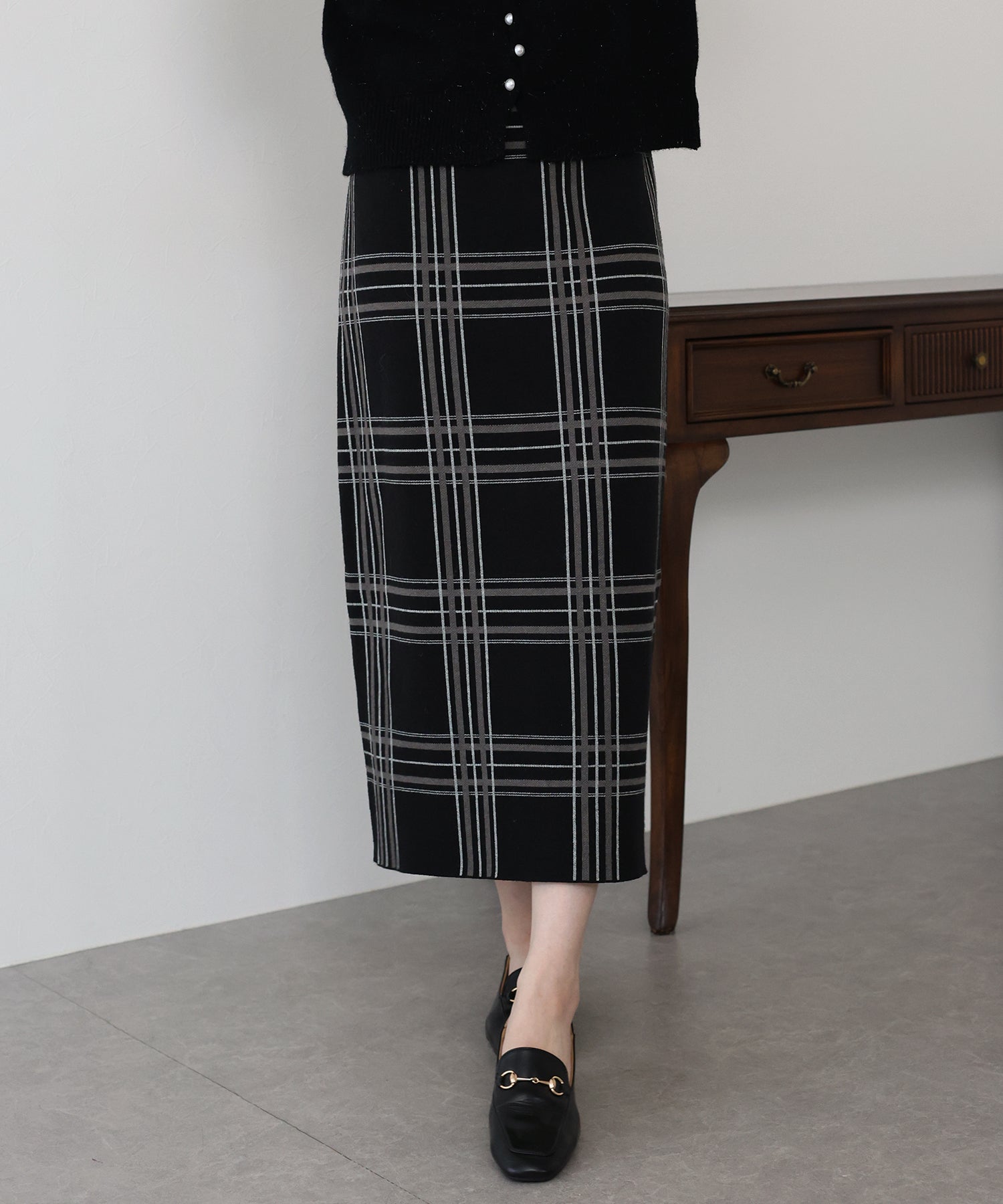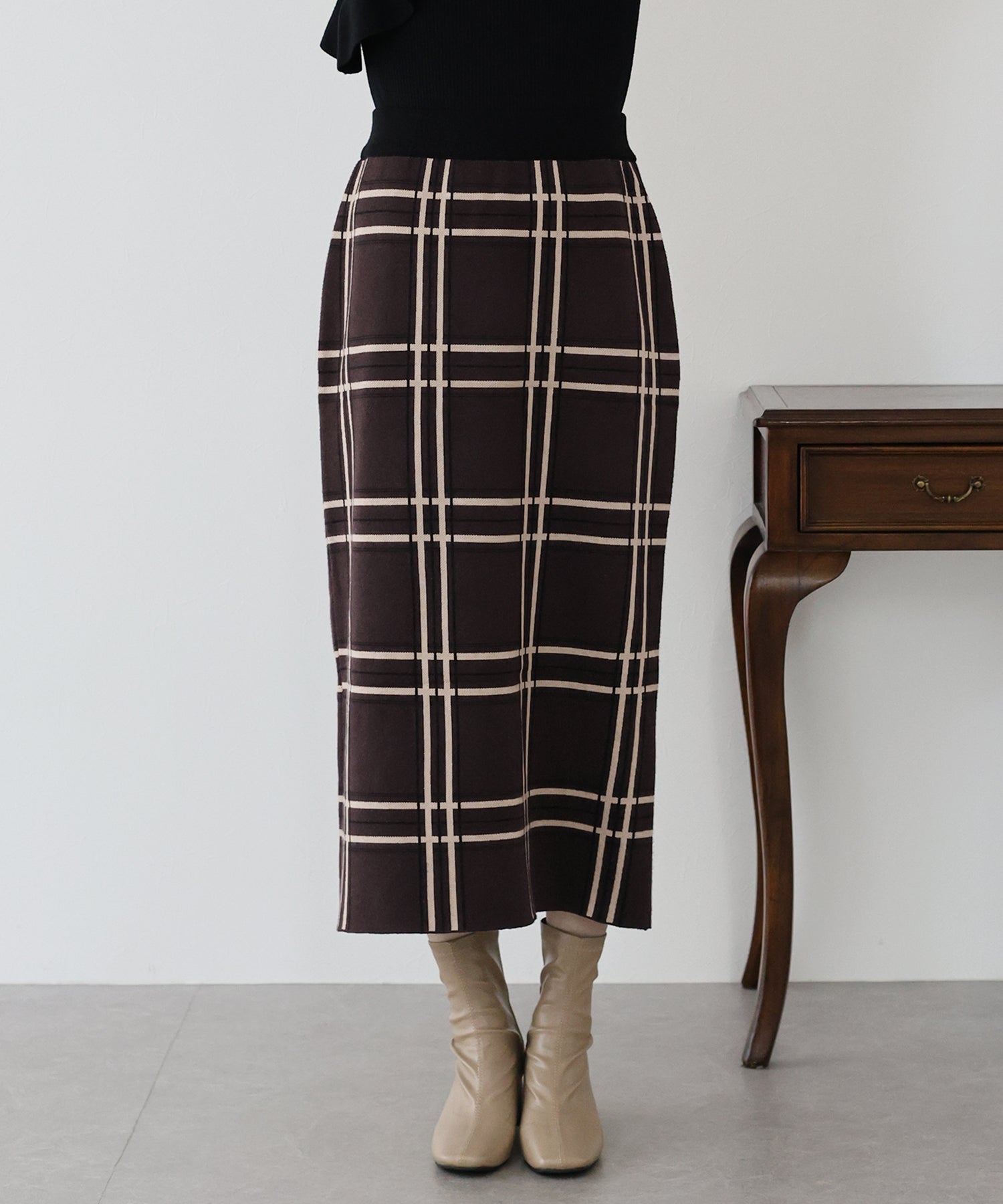 秋冬を先取りできるチェック柄が目を引くニットタイトスカート。