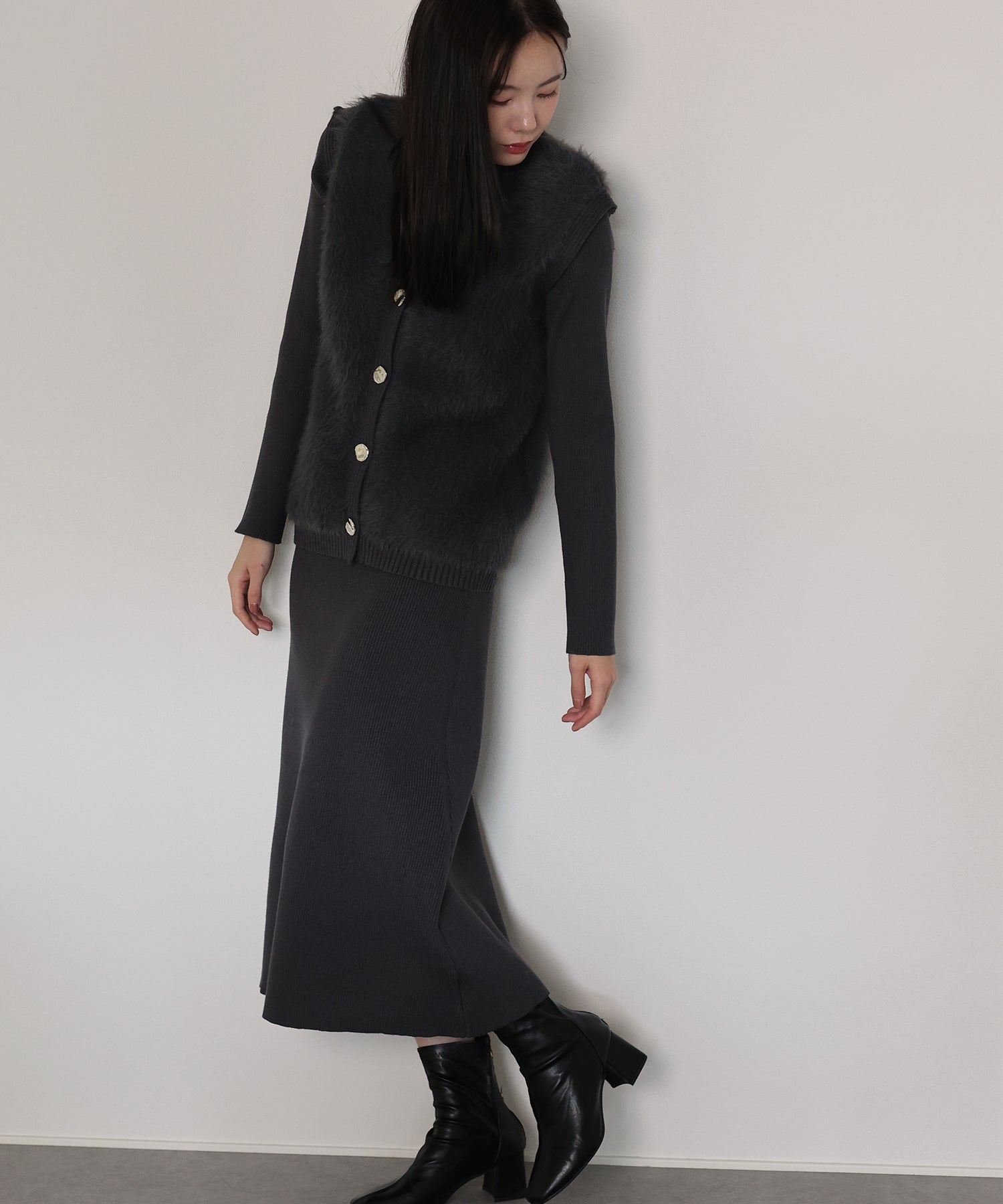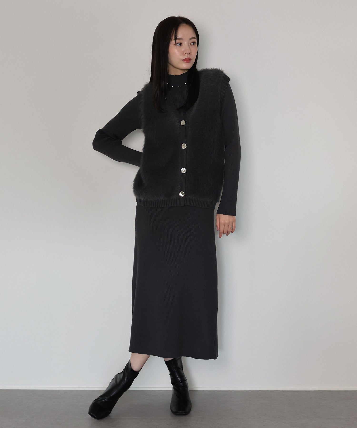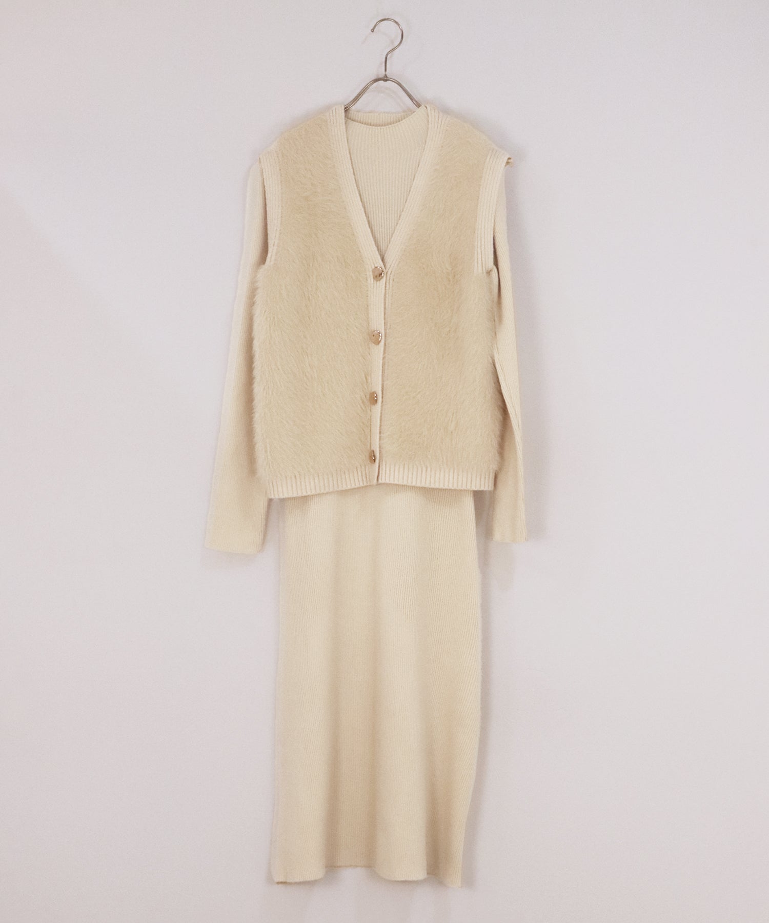 シャギーニットベスト&ワンピースのレイヤードセット ?POINT ゴールドボタンのシャギーベストとワンピースがセットになったリブニットワンピース。 着るだけで今っぽく仕上がり、忙しい朝も即コーディネートが完成する優れもの。 滑らかな触り心地のニット素材で着やすさ抜群。 ベストはシャギーニットがシーズンライクなムードを高め、ニュアンスゴールドボタンがナチュラルなアクセントに。 縦ラインを強調するリブ編みがモードなシルエットを演出し、都会的なスタイリングが完成します◎ セットでも単品でもご着用頂けるので、着回し力抜群のアイテムです。