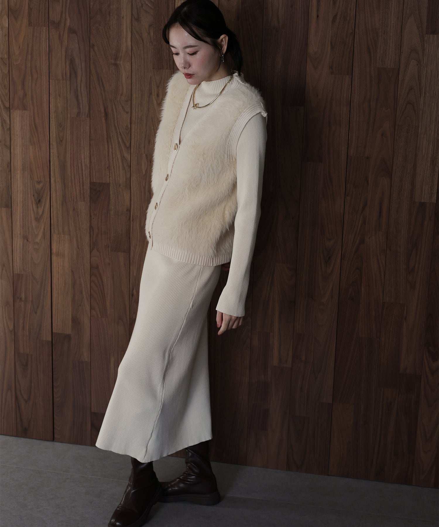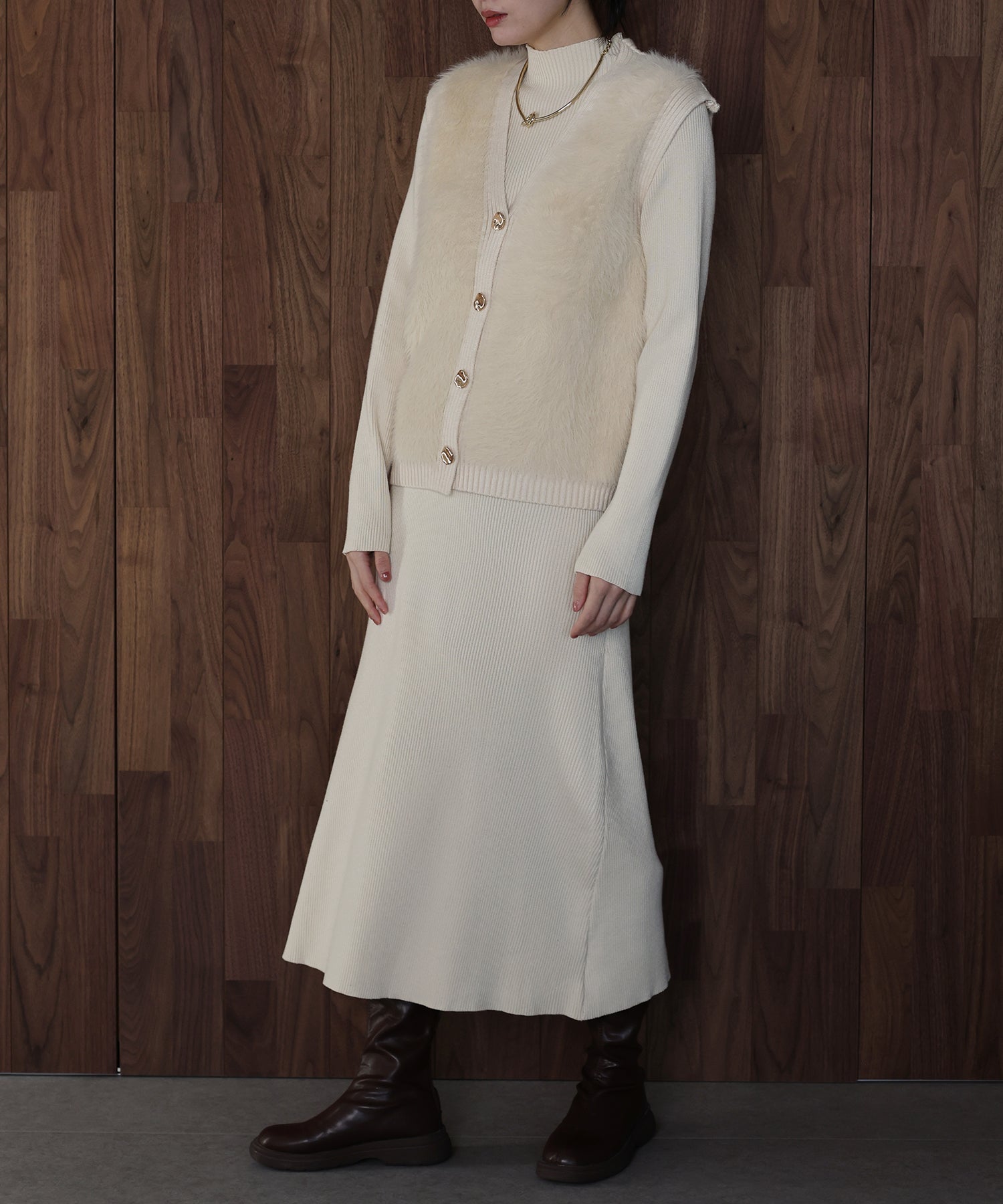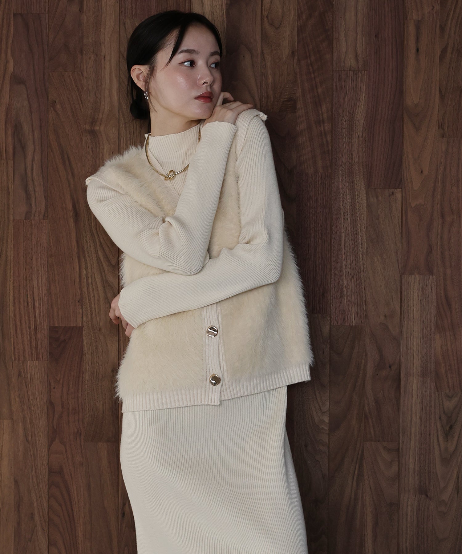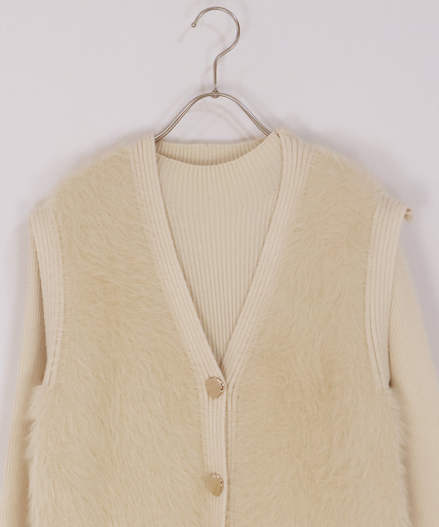 シャギーニットベスト&ワンピースのレイヤードセット ?POINT ゴールドボタンのシャギーベストとワンピースがセットになったリブニットワンピース。 着るだけで今っぽく仕上がり、忙しい朝も即コーディネートが完成する優れもの。 滑らかな触り心地のニット素材で着やすさ抜群。 ベストはシャギーニットがシーズンライクなムードを高め、ニュアンスゴールドボタンがナチュラルなアクセントに。 縦ラインを強調するリブ編みがモードなシルエットを演出し、都会的なスタイリングが完成します◎ セットでも単品でもご着用頂けるので、着回し力抜群のアイテムです。