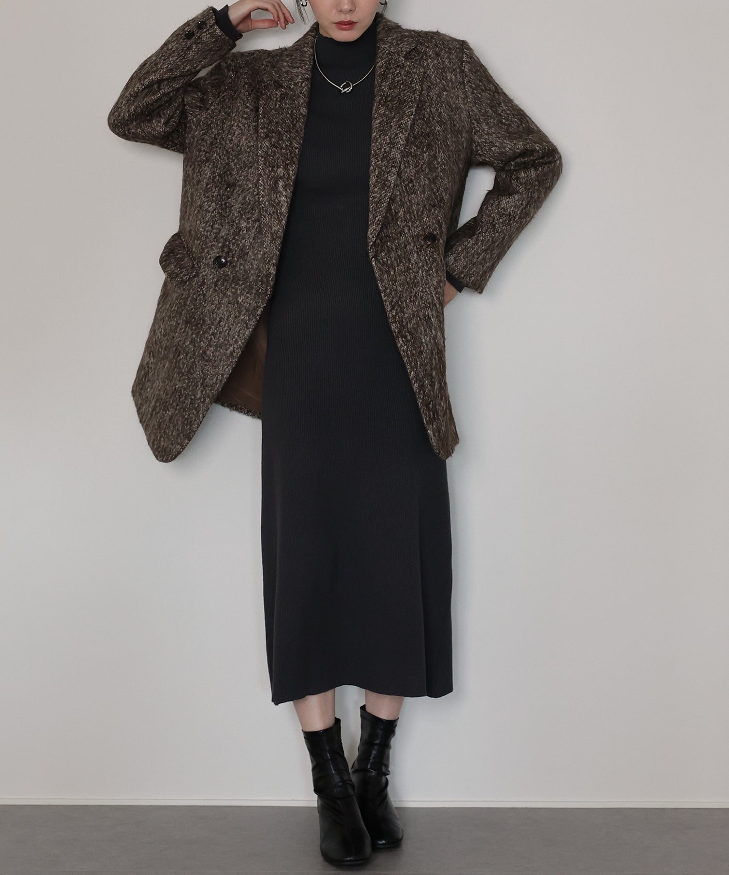?STYLING セットで着るだけで着映えするワンピースは足元や小物で印象を変えて楽しめます。 ヒールでシャープにまとめればモード感を、スニーカーで外せば力の抜けた都会的カジュアルに。 小物はミニマルにまとめることで、洗練された印象を際立たせます。