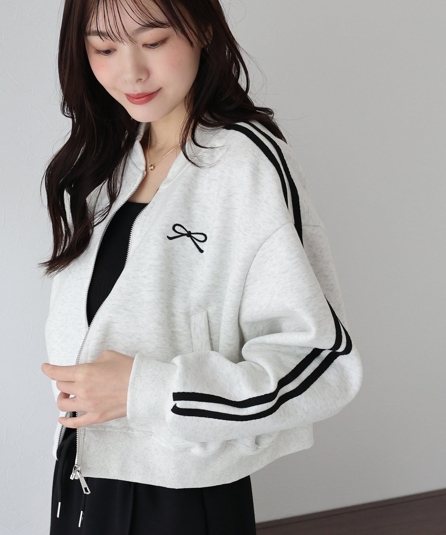 スポーティなサイドライン入りのブルゾンに、リボン刺繍を加えフェミニンなアクセントをプラス。