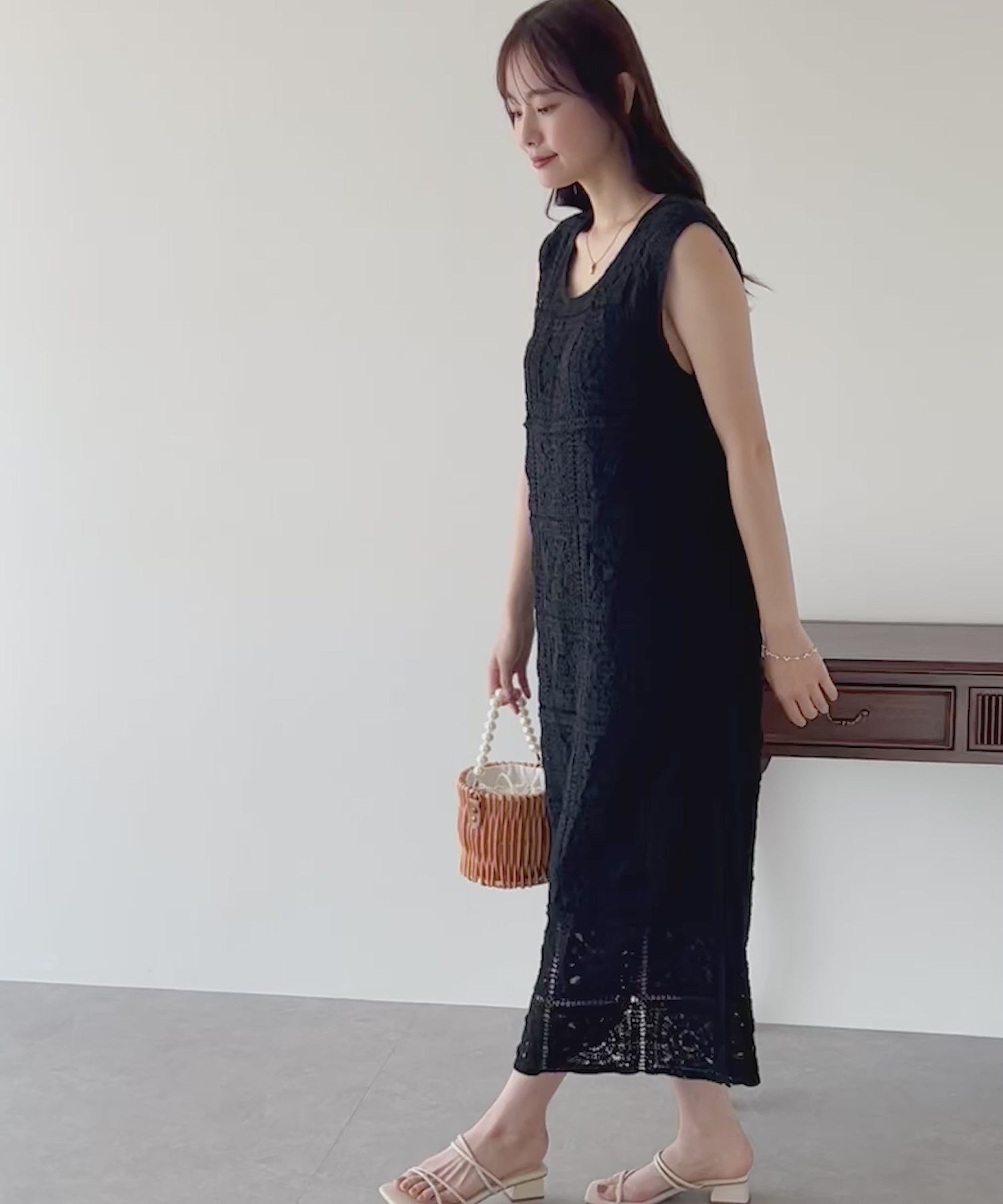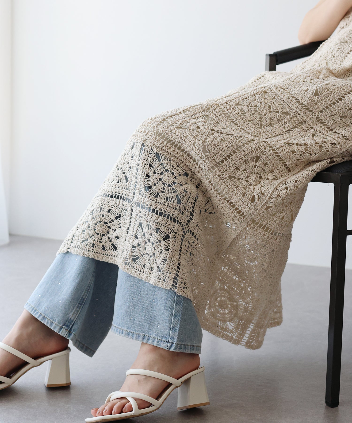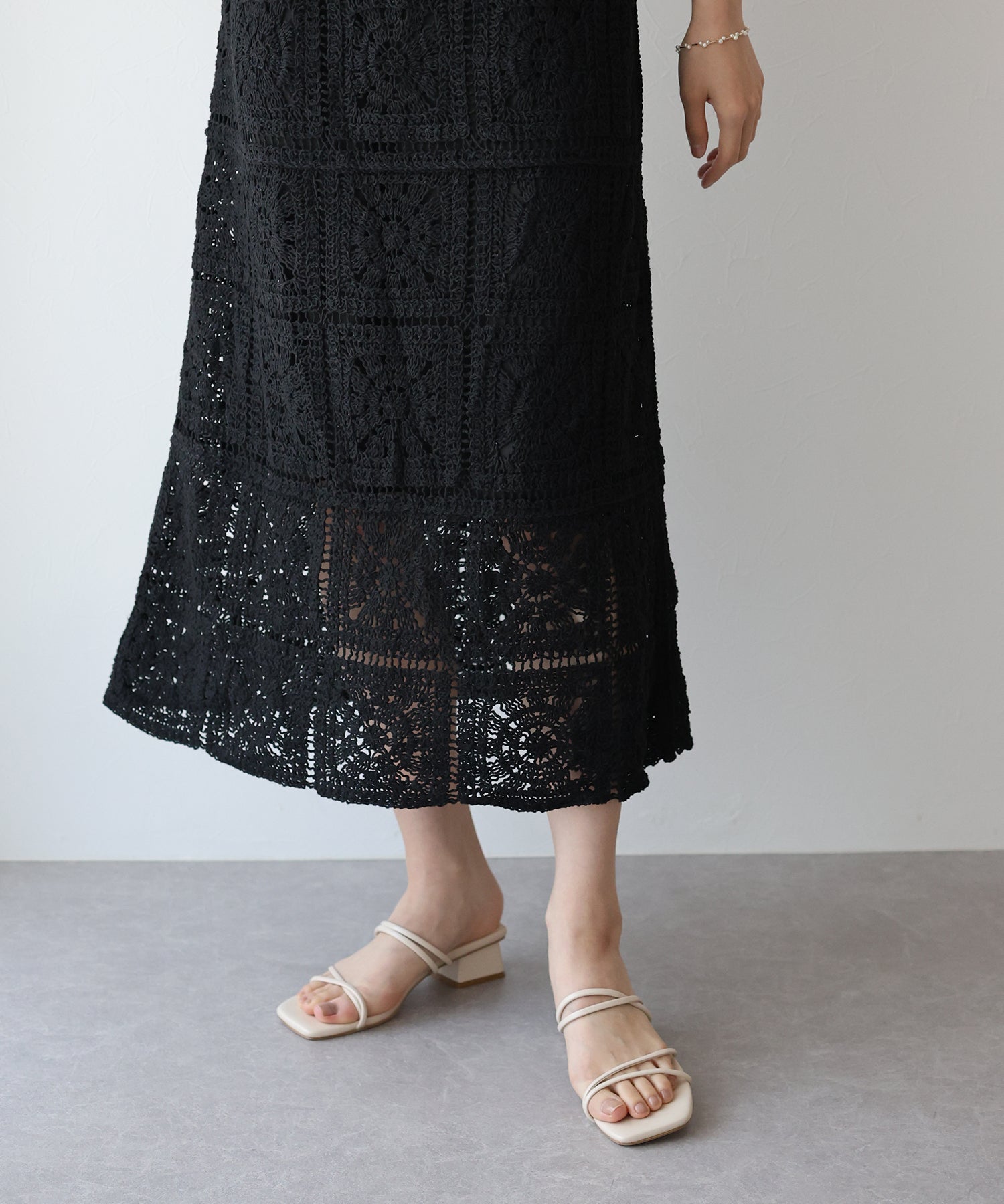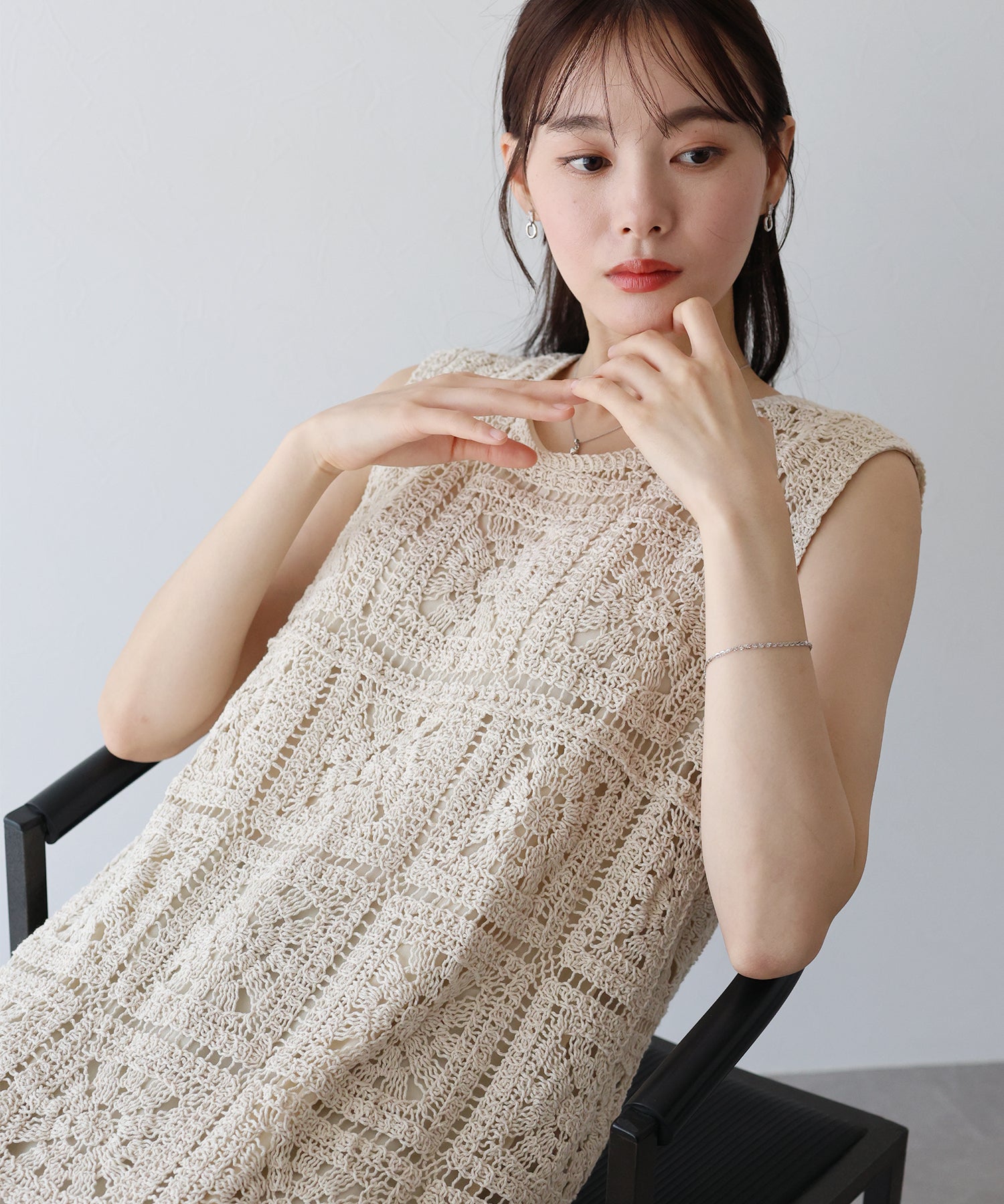スクエア×フラワーモチーフが華やかなデザイン。ざっくりとした網目が涼しげで、抜け感を出してくれます。