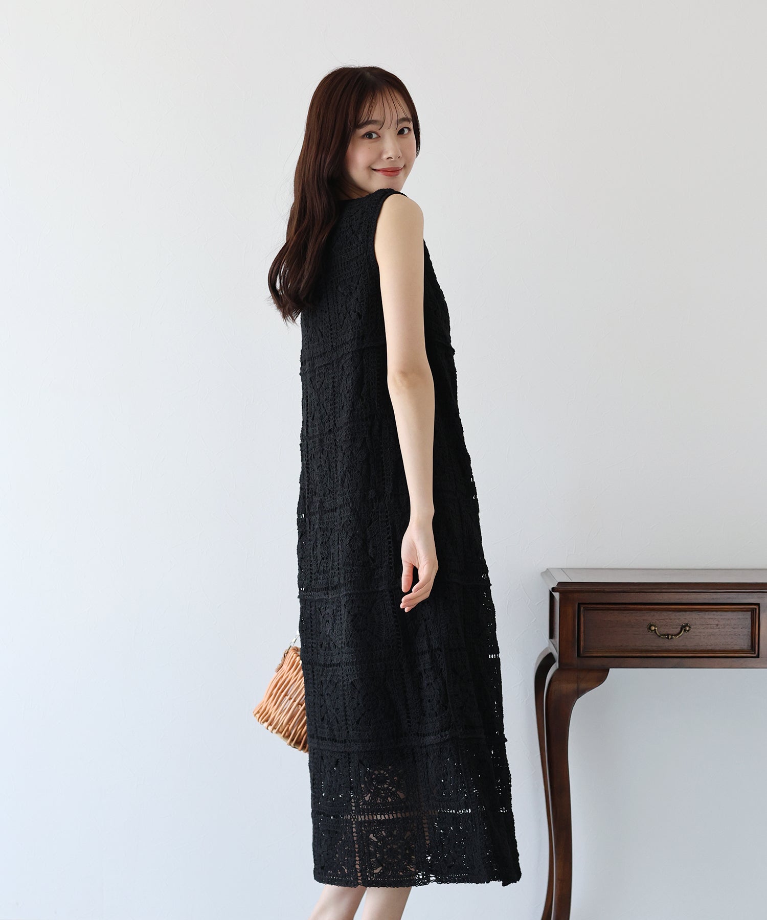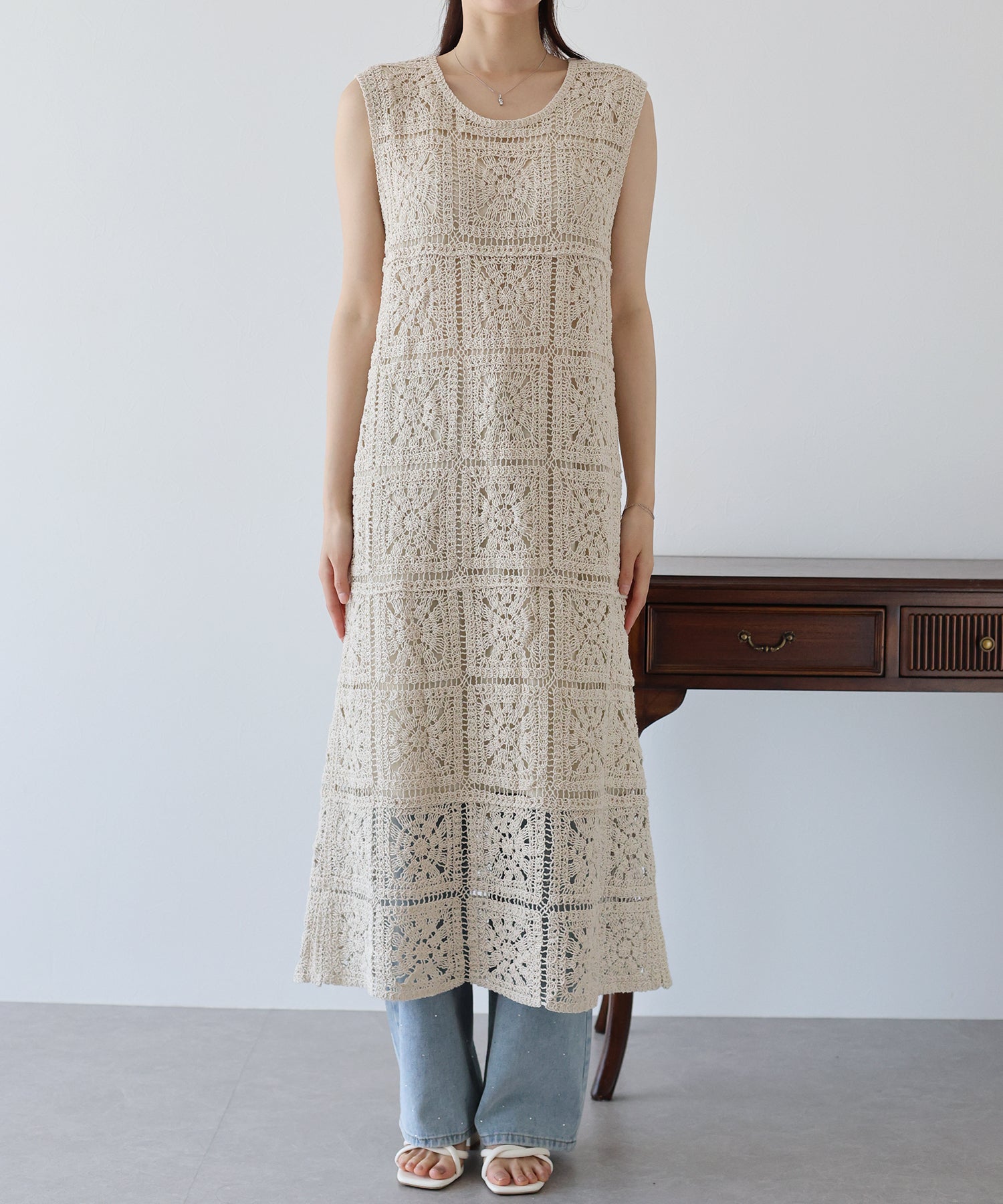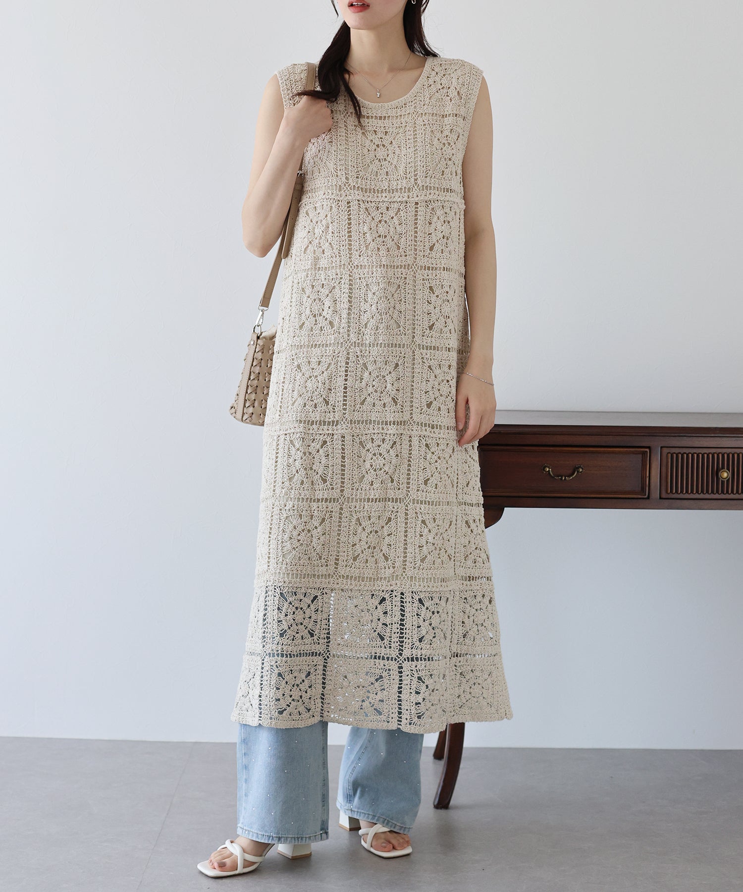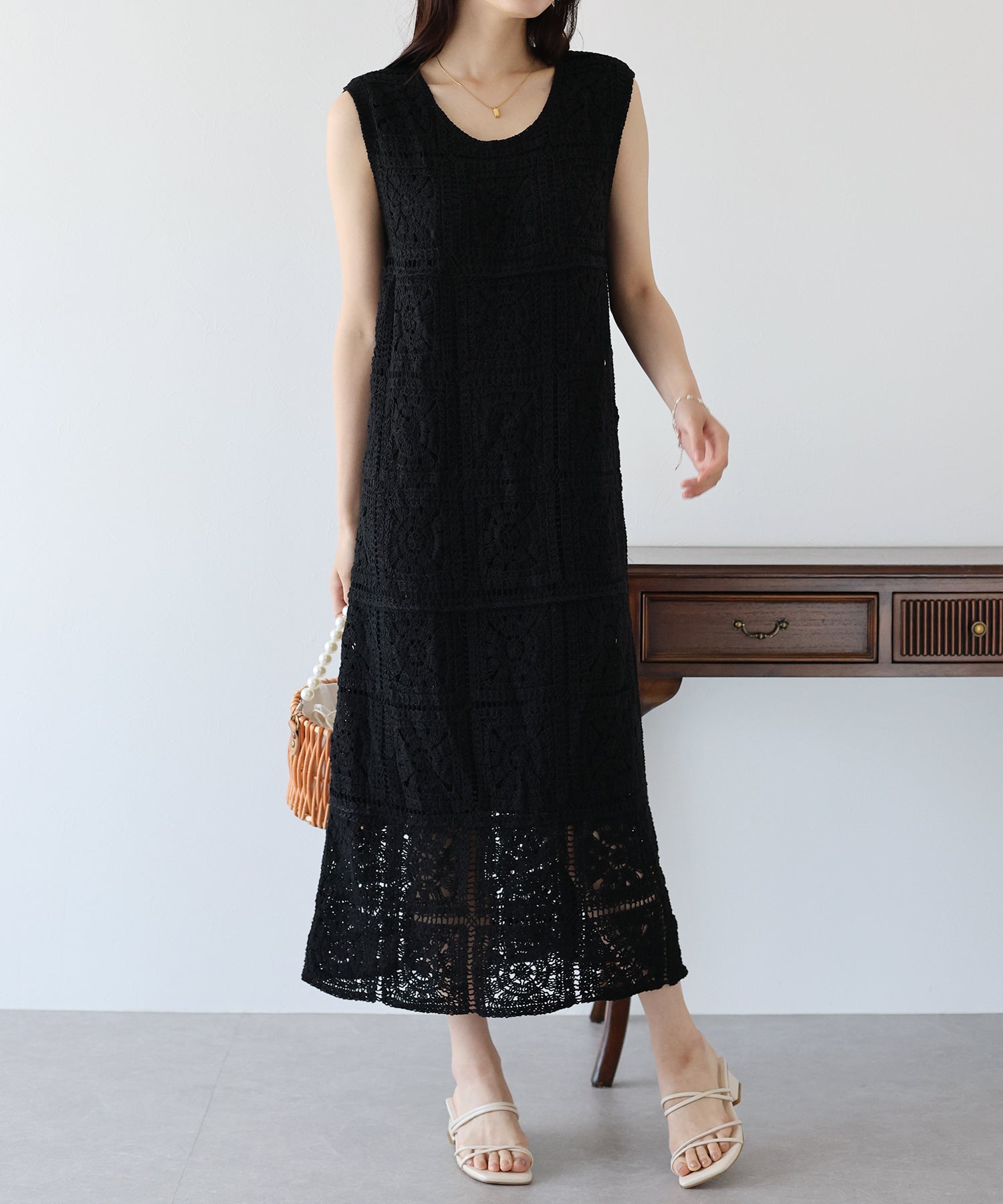 フラワーモチーフをあしらったクロシェ編みが1枚でサマになる着映えワンピース。