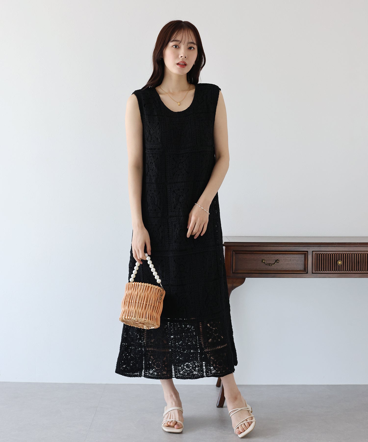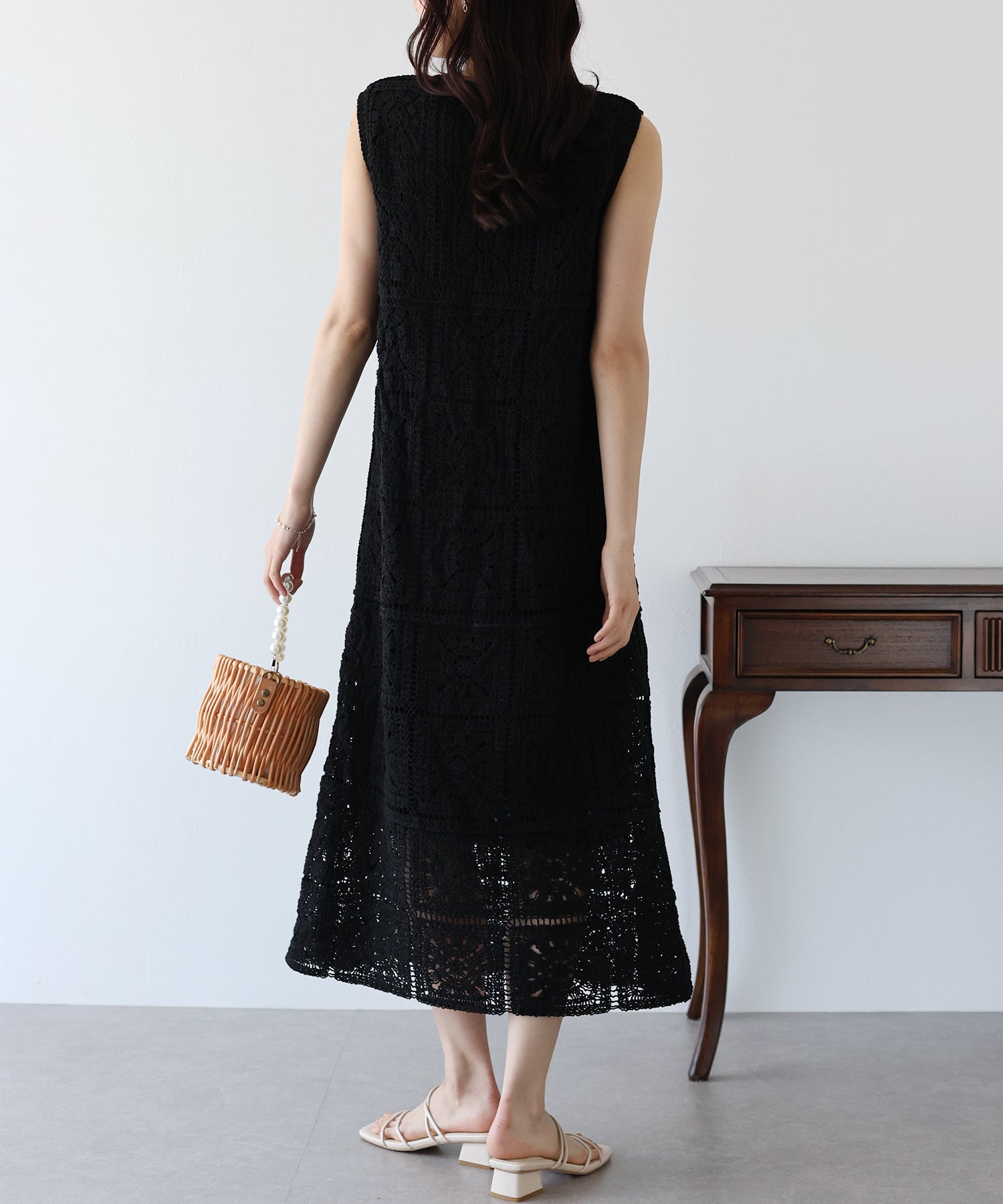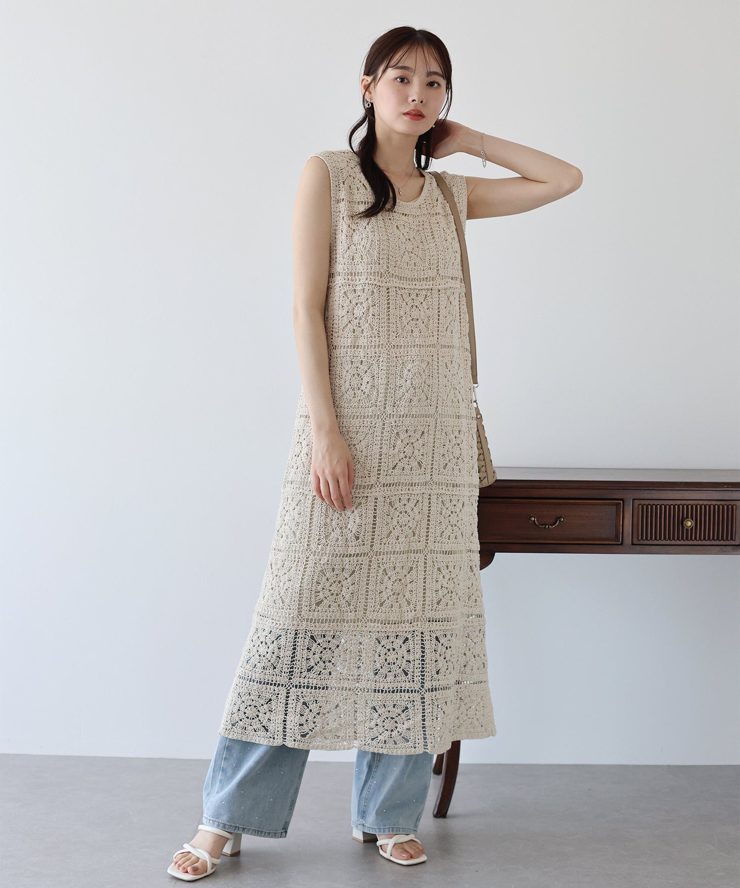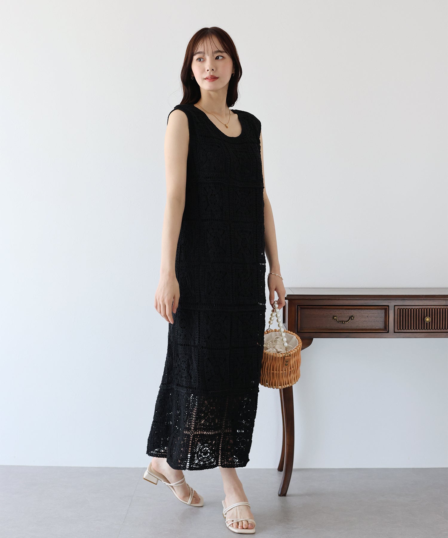 フラワーモチーフをあしらったクロシェ編みが1枚でサマになる着映えワンピース。