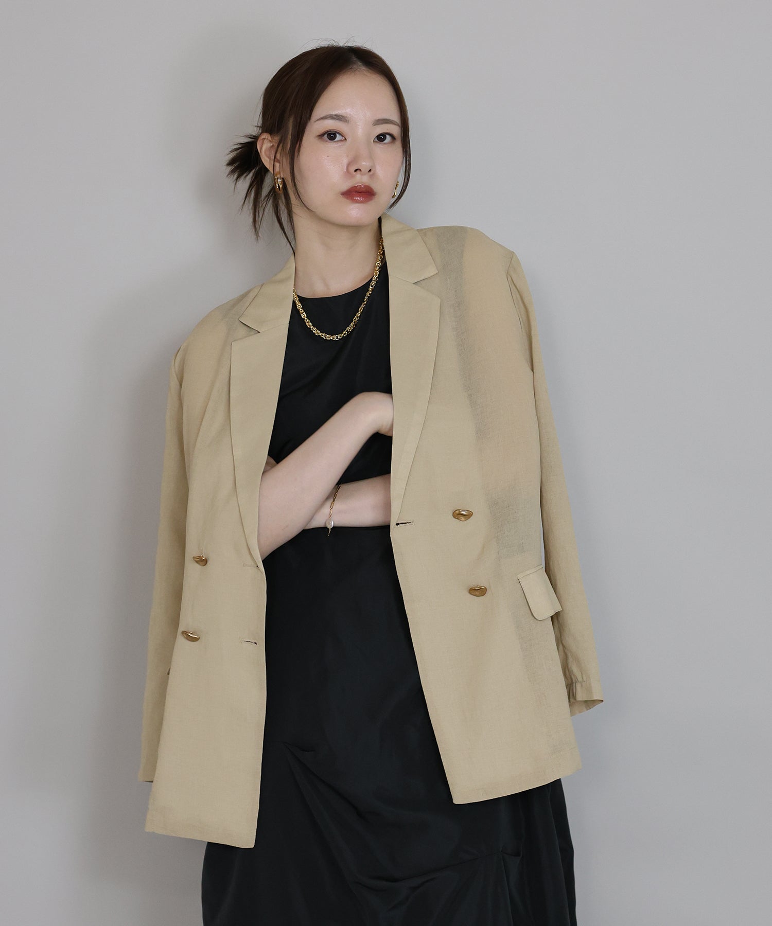 ダブル仕立てのデザインできちんと感のあるジャケットなので、キレイめなブラウスやボトムと合わせるとオフィスカジュアルにも◎