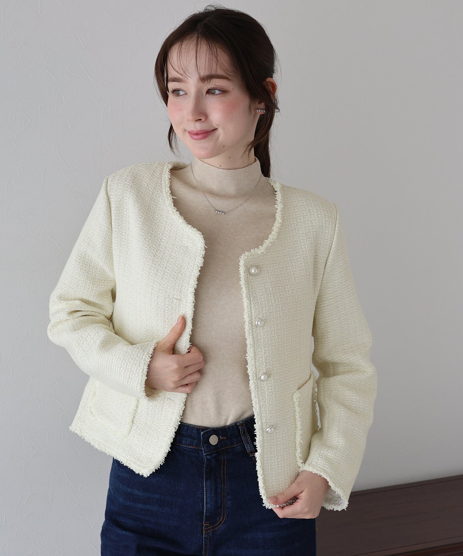 コンパクトなシルエットが特徴のクラシカルな雰囲気を漂わせるノーカラーツイードジャケット。
