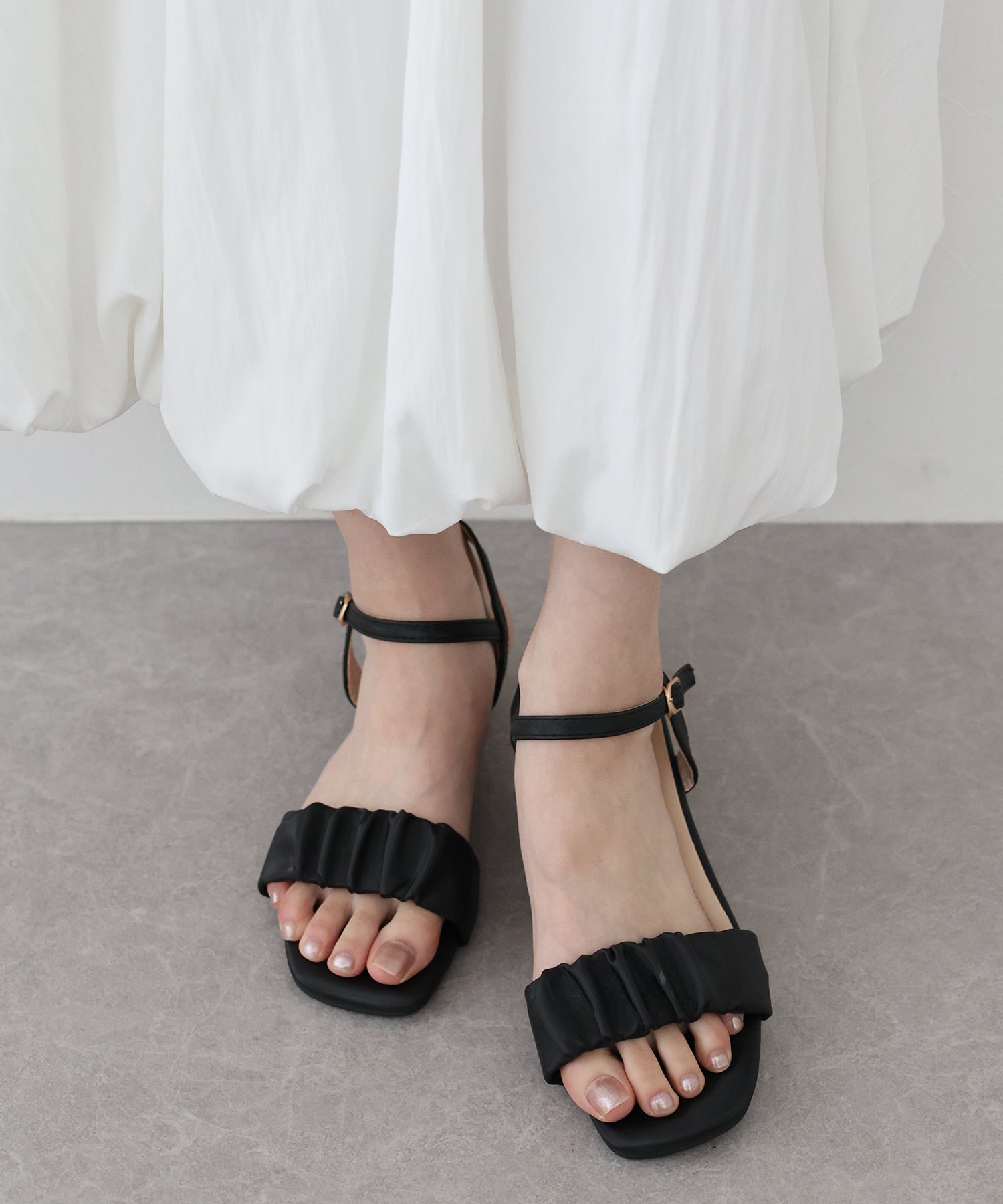 ?DETAIL スクエアトゥ 太ヒール ストラップ付き 5つ穴で調整可能 踵クッション有り 甲部分:ギャザーデザイン