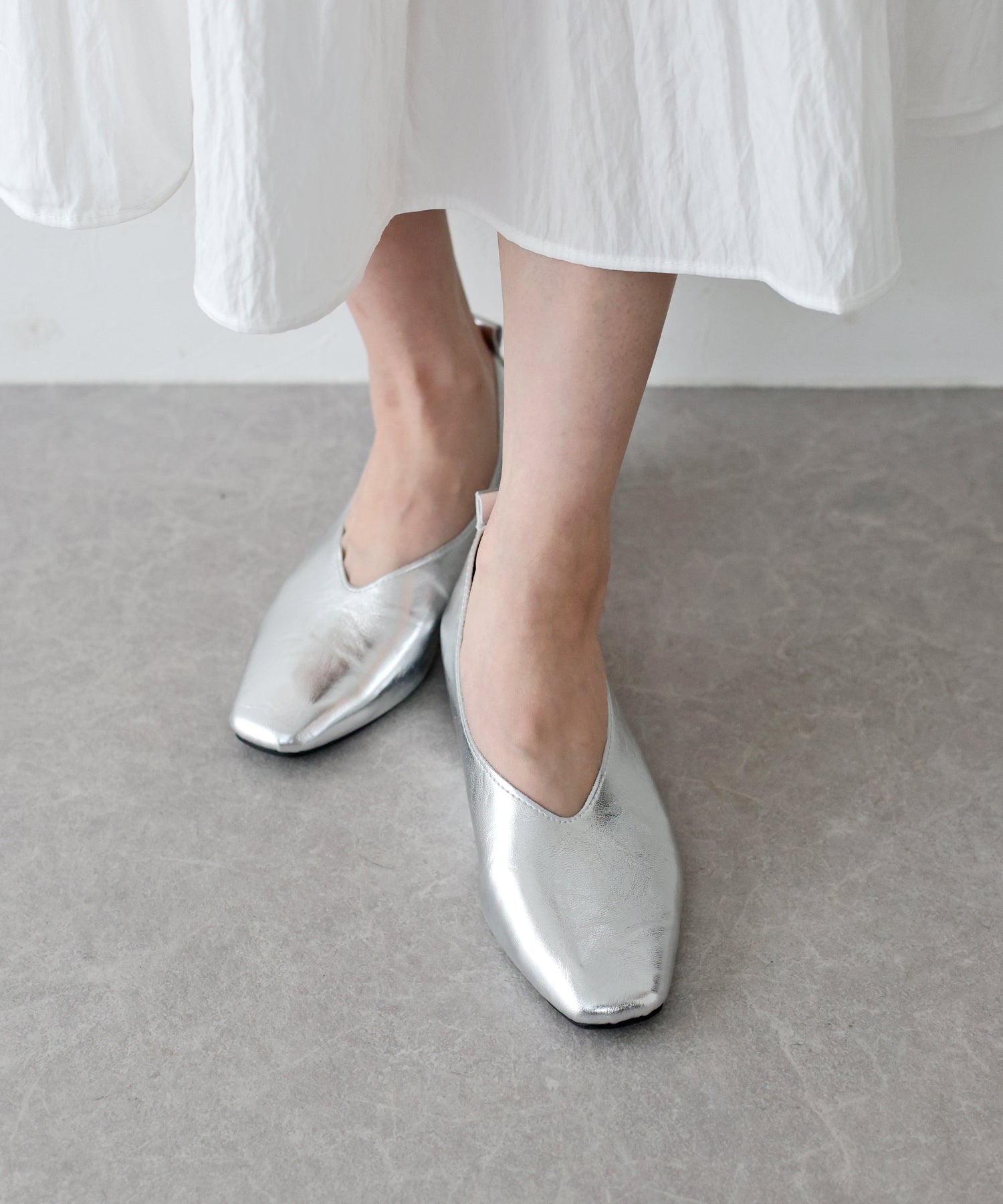 ?POINT 今っぽさを演出するスクエアトゥが魅力のフラットパンプス。 つま先のVカットラインが足元に抜け感をプラスし、きれいめで洗練された印象に。 甲深めのデザインで足をしっかり包み込み、安定感のある履き心地を実現しています。 さりげないインヒールとふかふかのクッション入りで軽量なので、見た目以上に快適な履き心地も◎ ブラックはデイリーに使いやすく、メタリックカラーなら、春夏らしく軽やかに足元を引き締めてくれます。