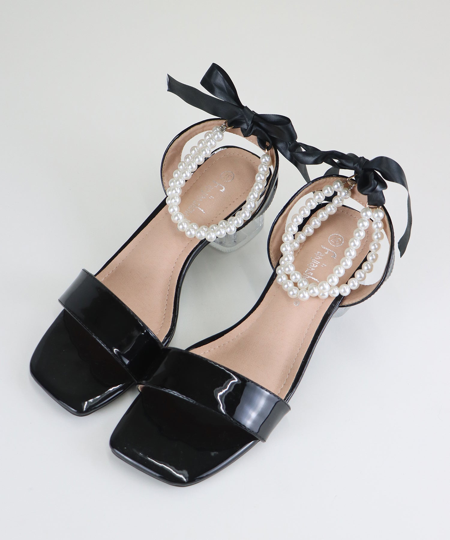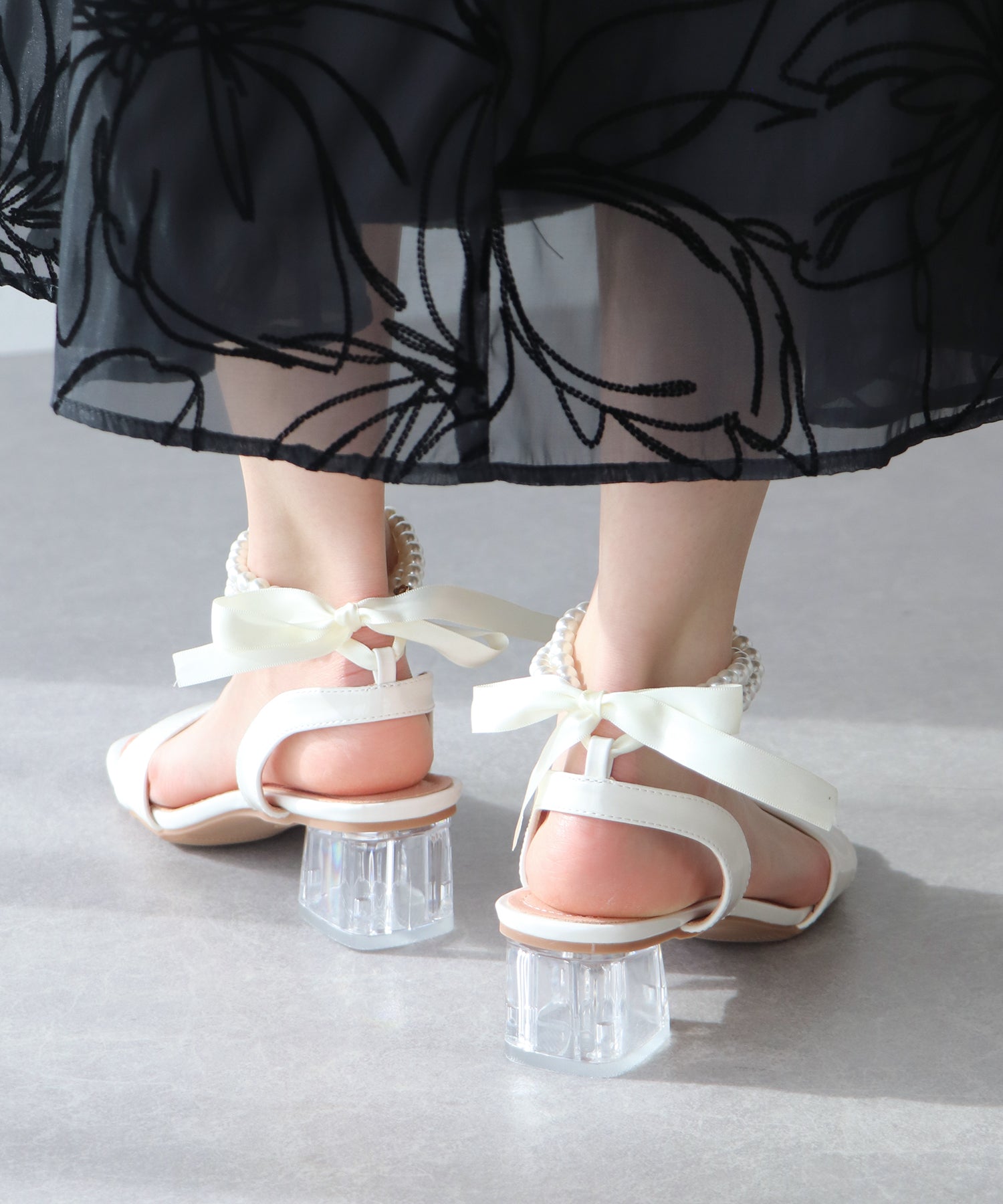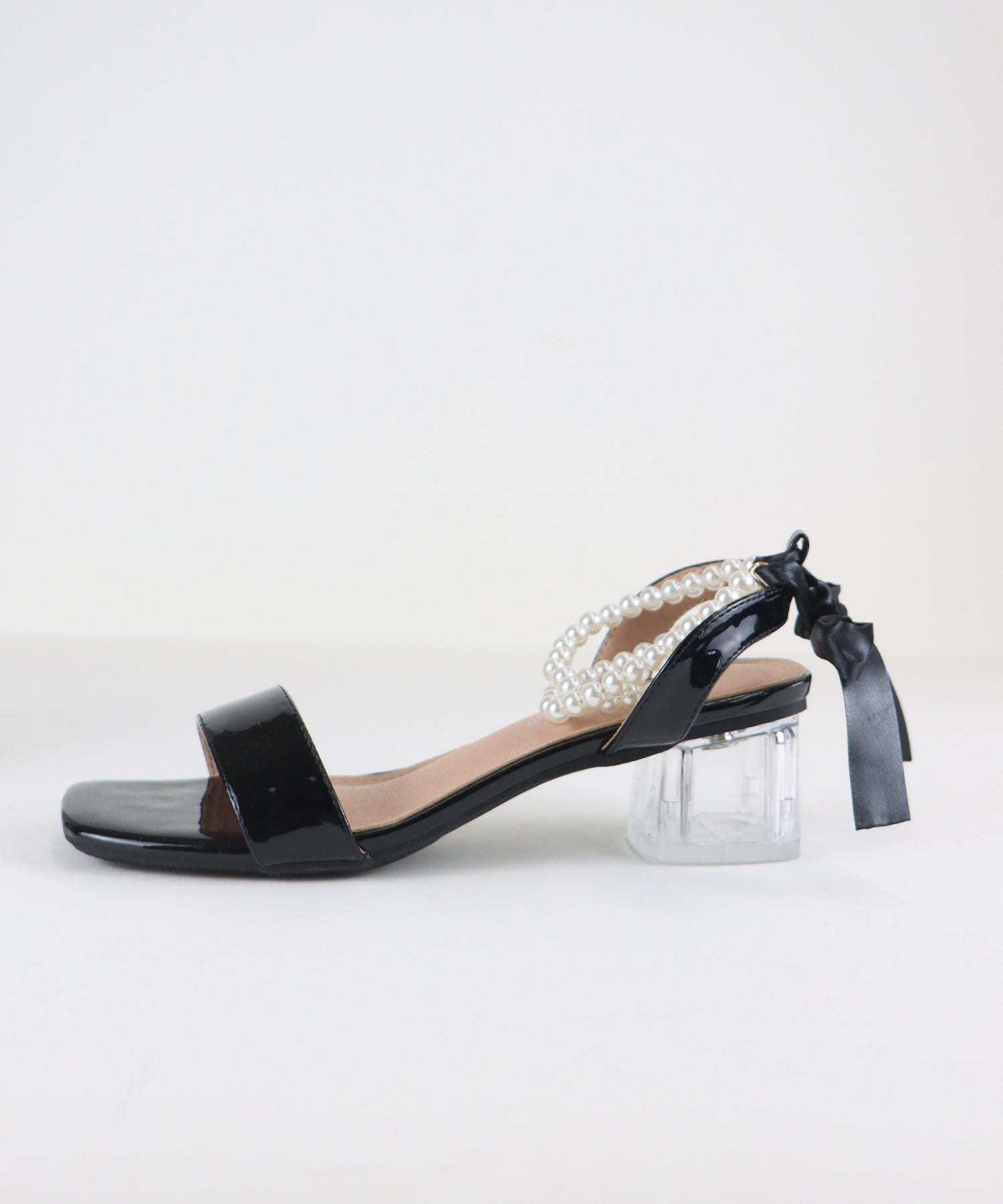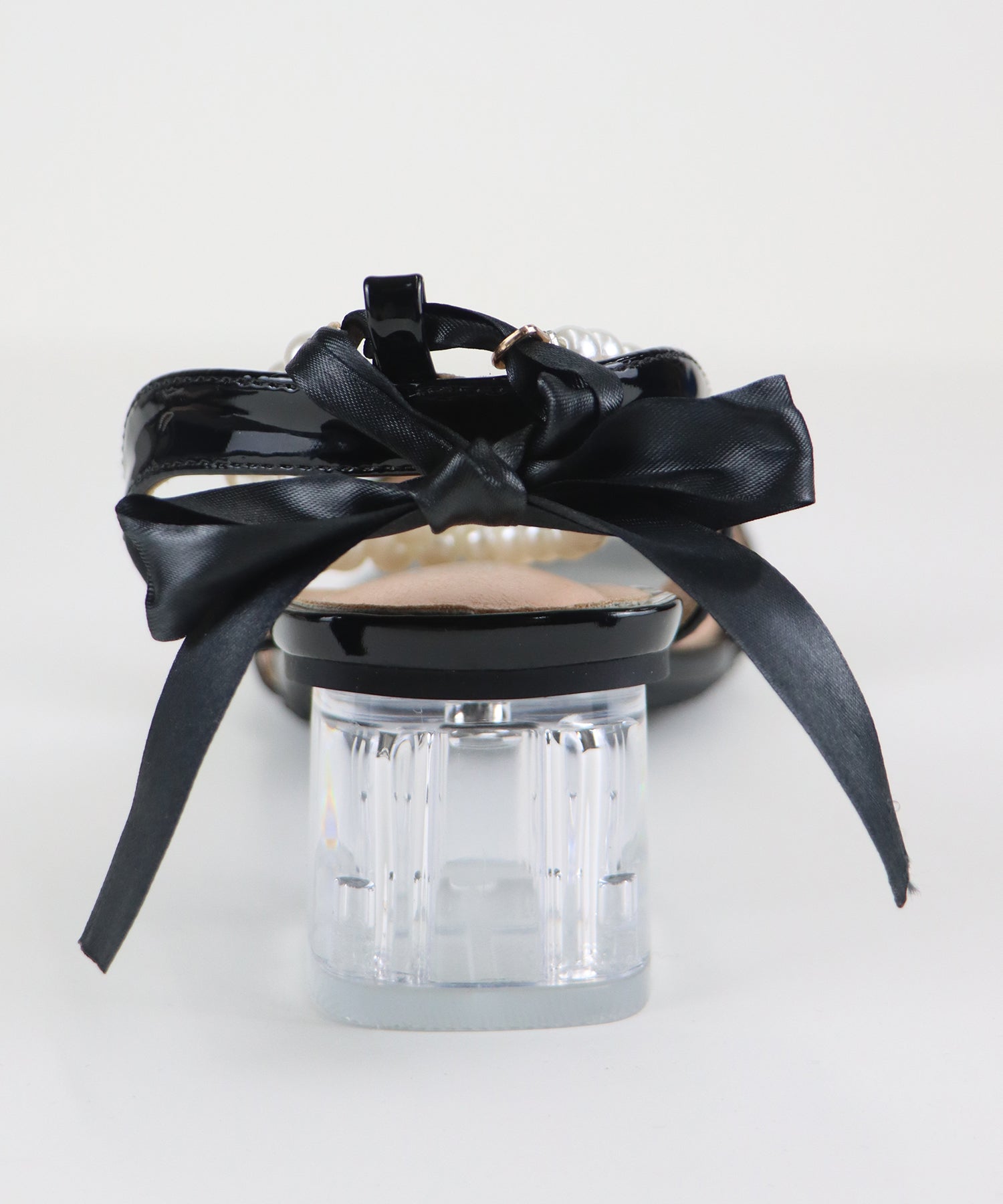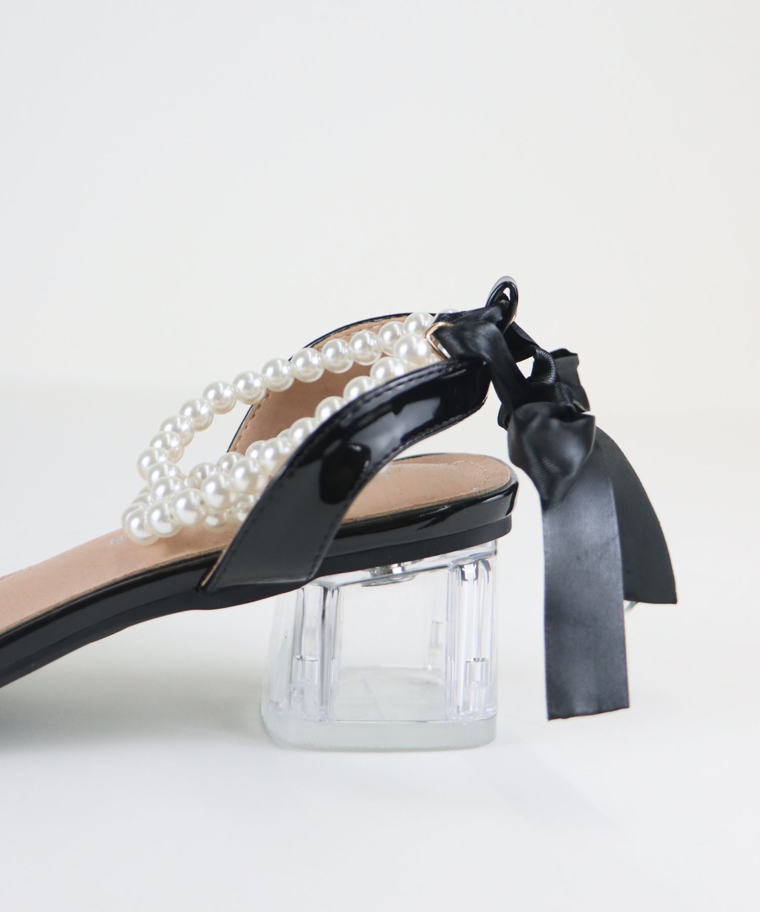 ?DETAIL クリア太ヒール パール&リボンアンクルストラップ スクエアトゥ クッション有り