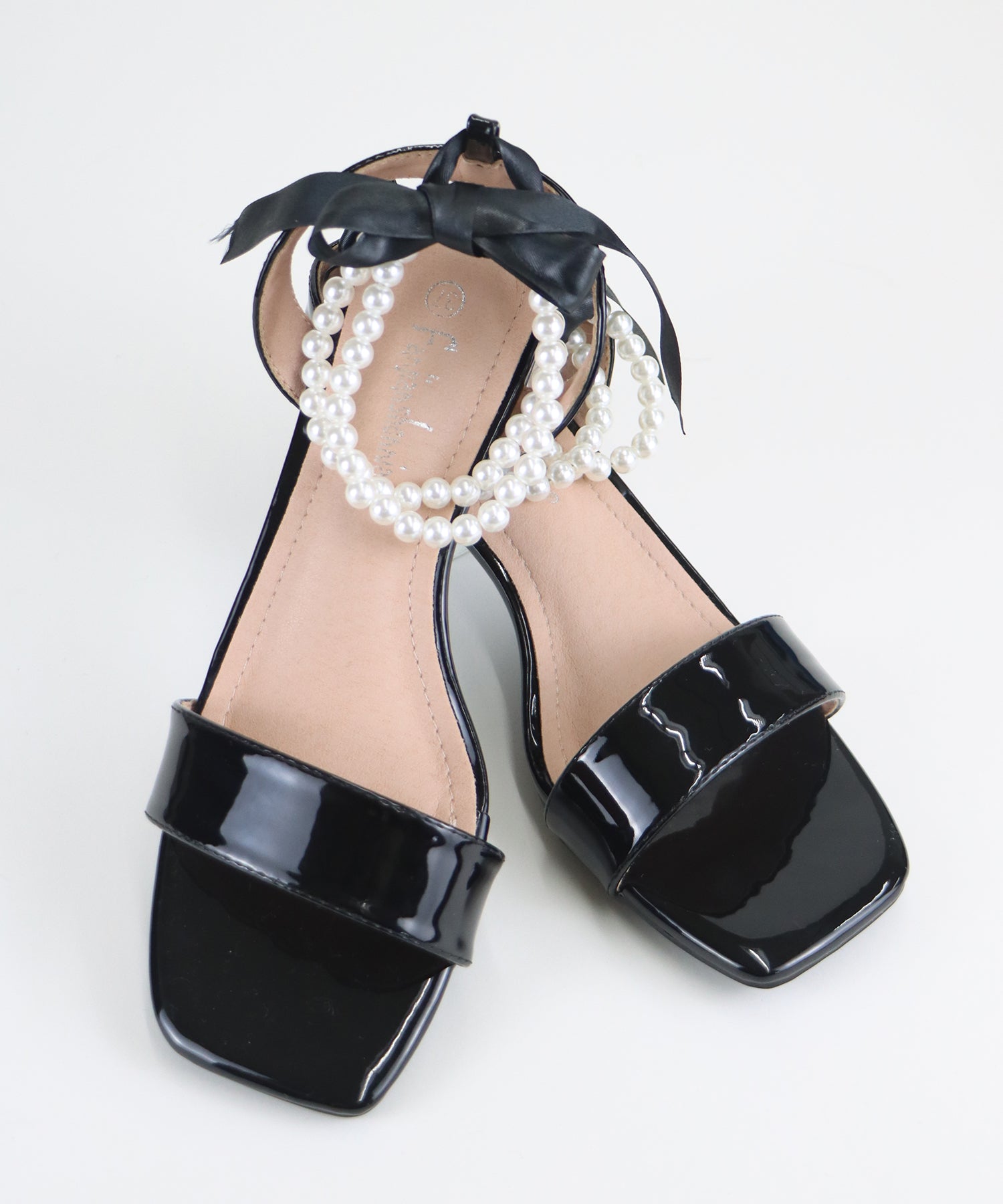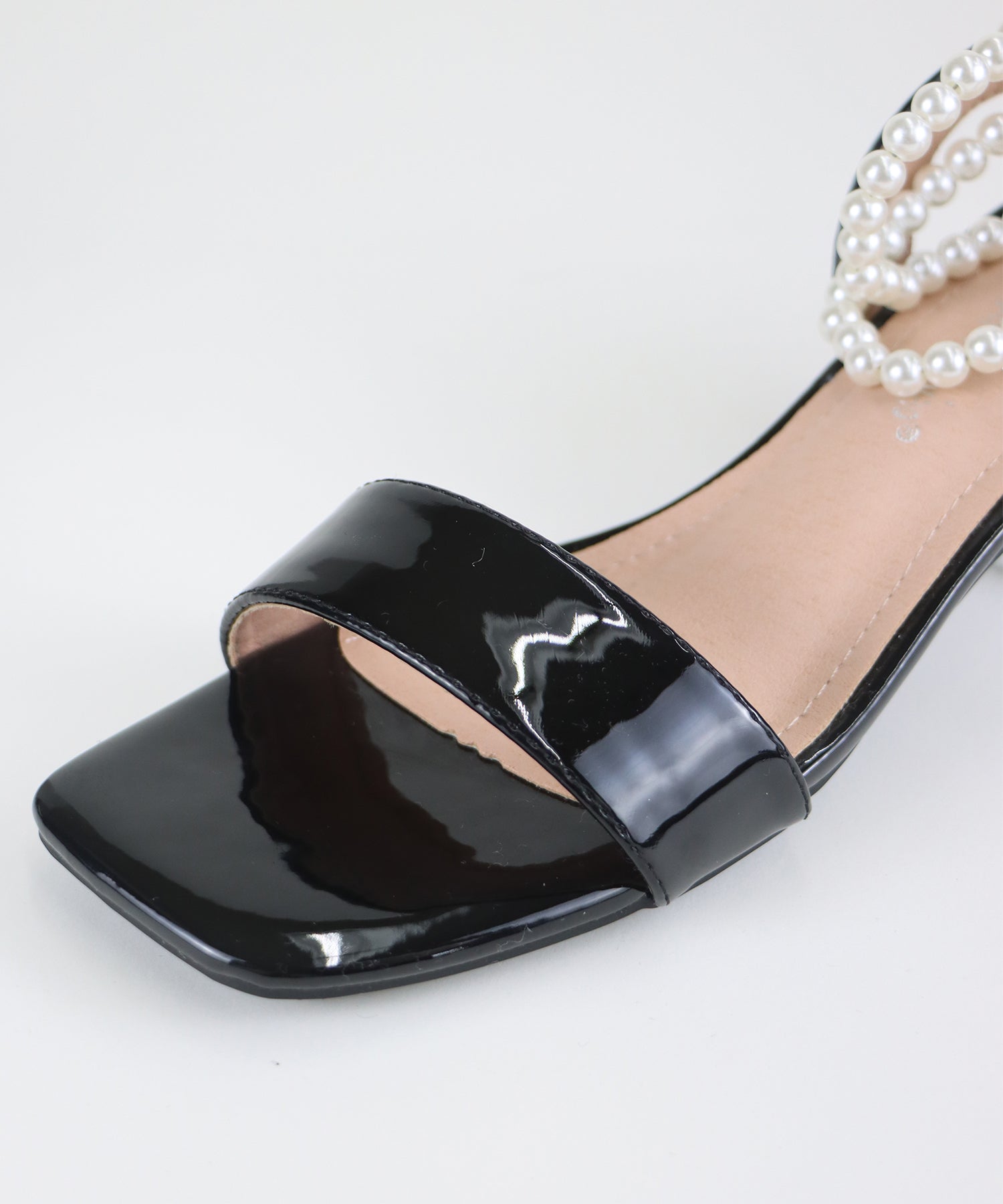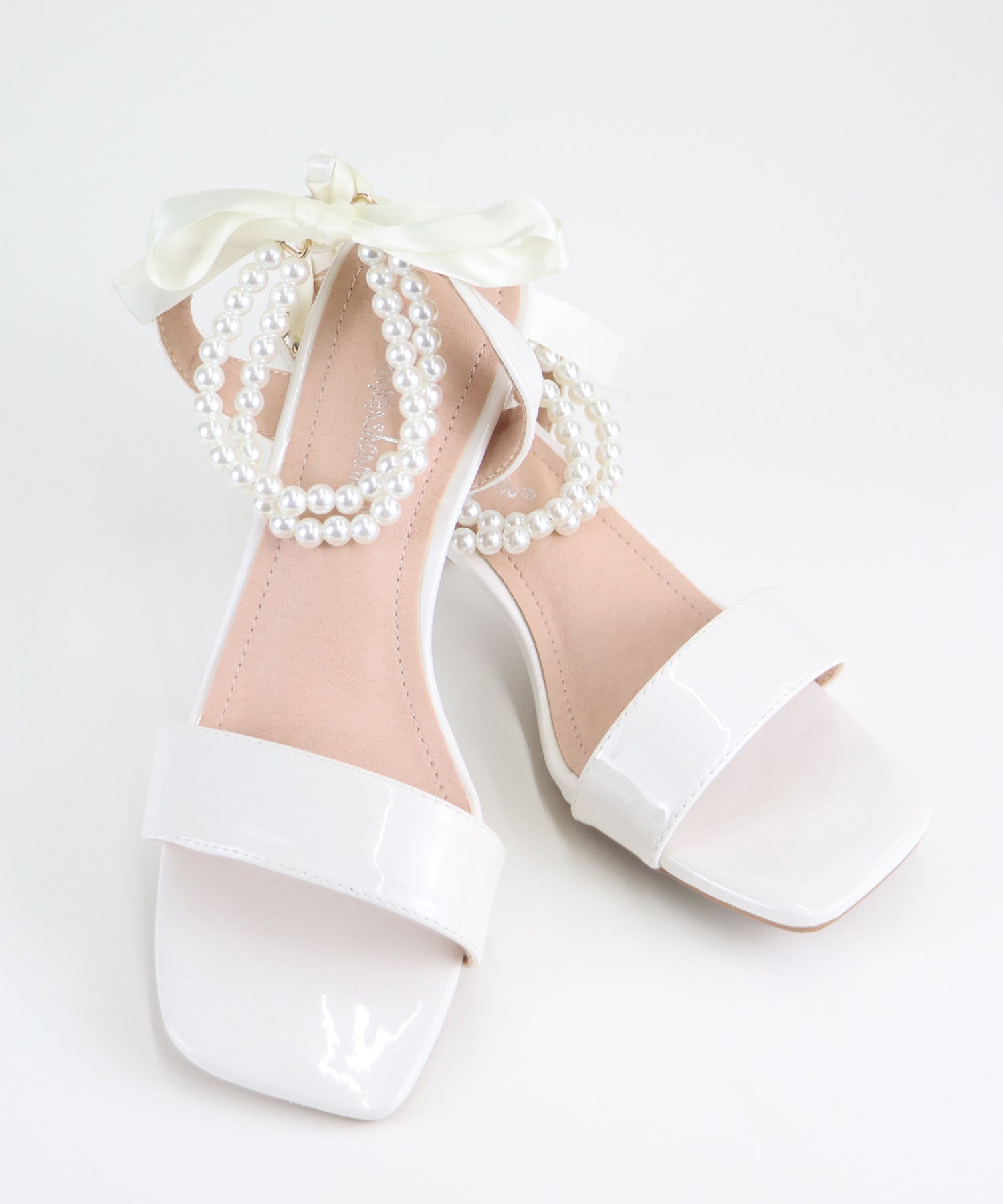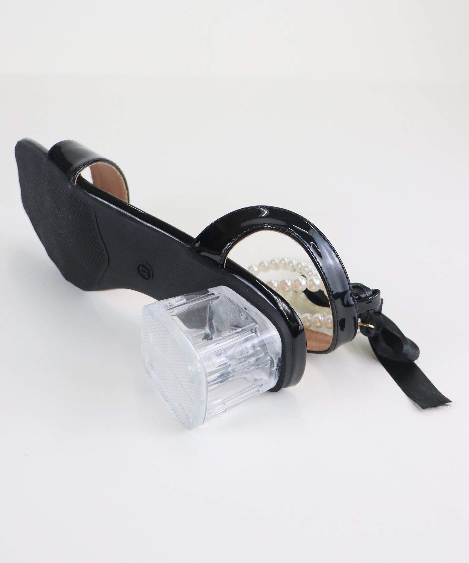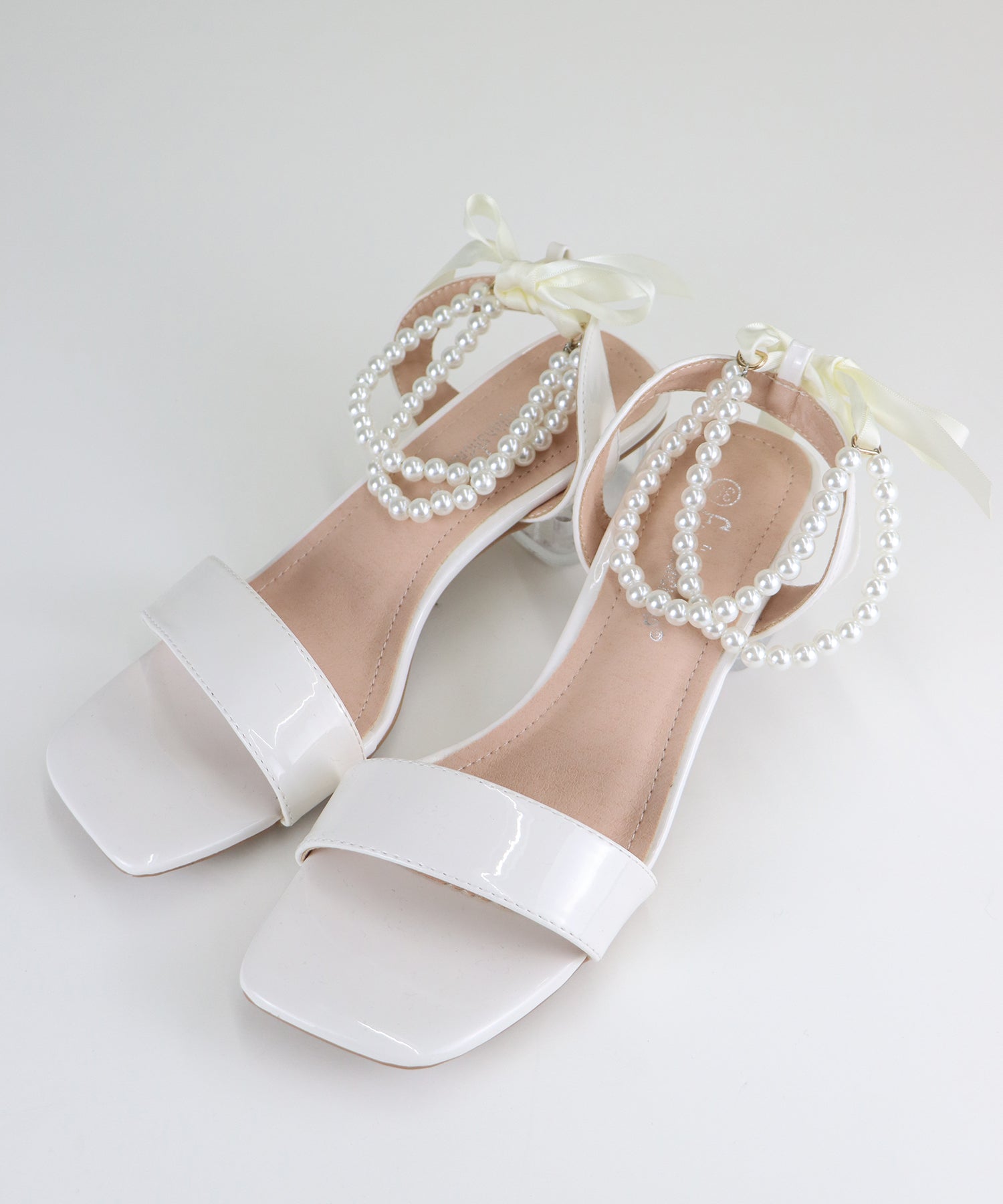 ?DETAIL クリア太ヒール パール&リボンアンクルストラップ スクエアトゥ クッション有り