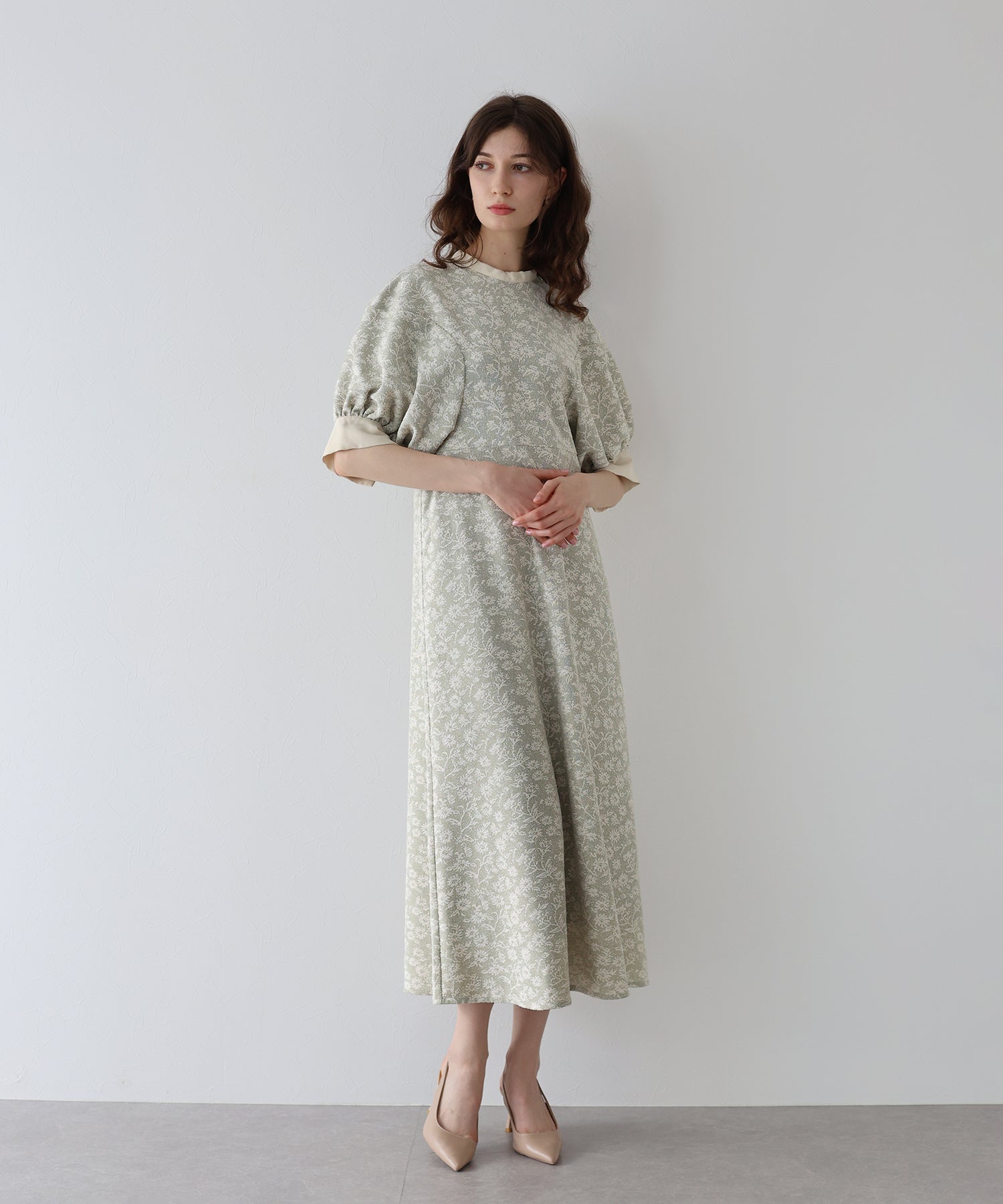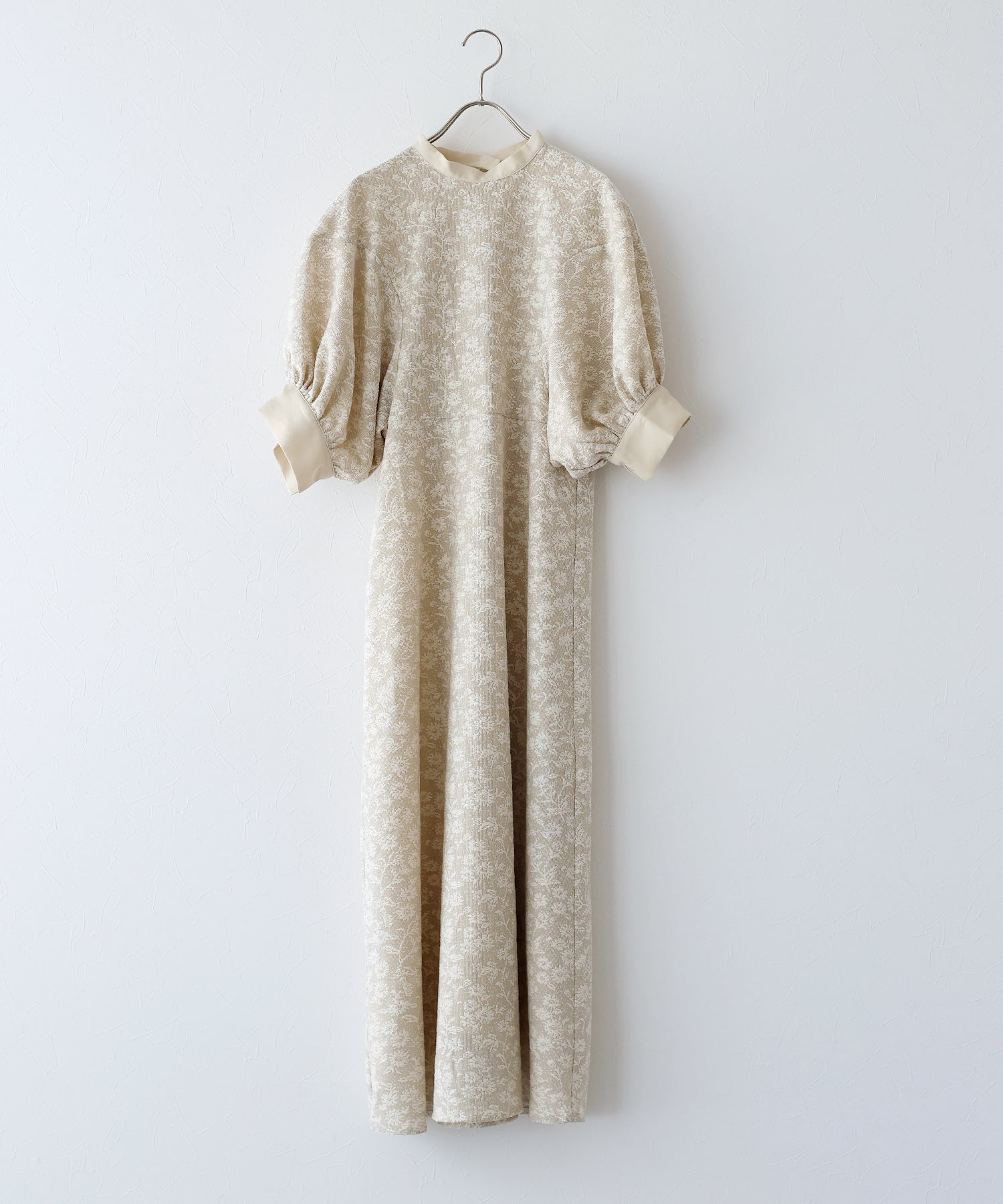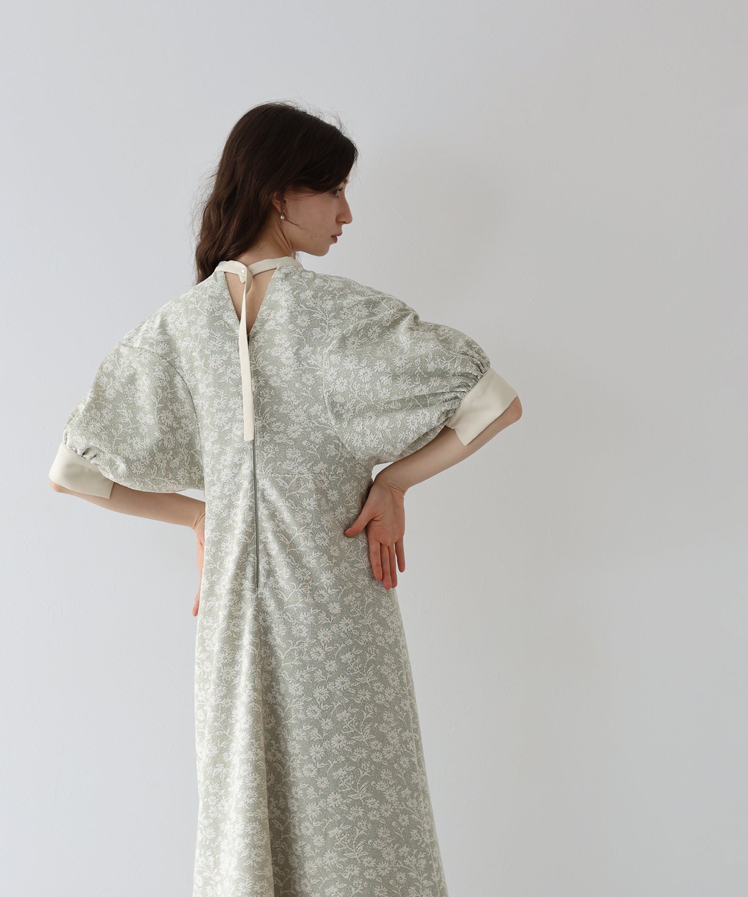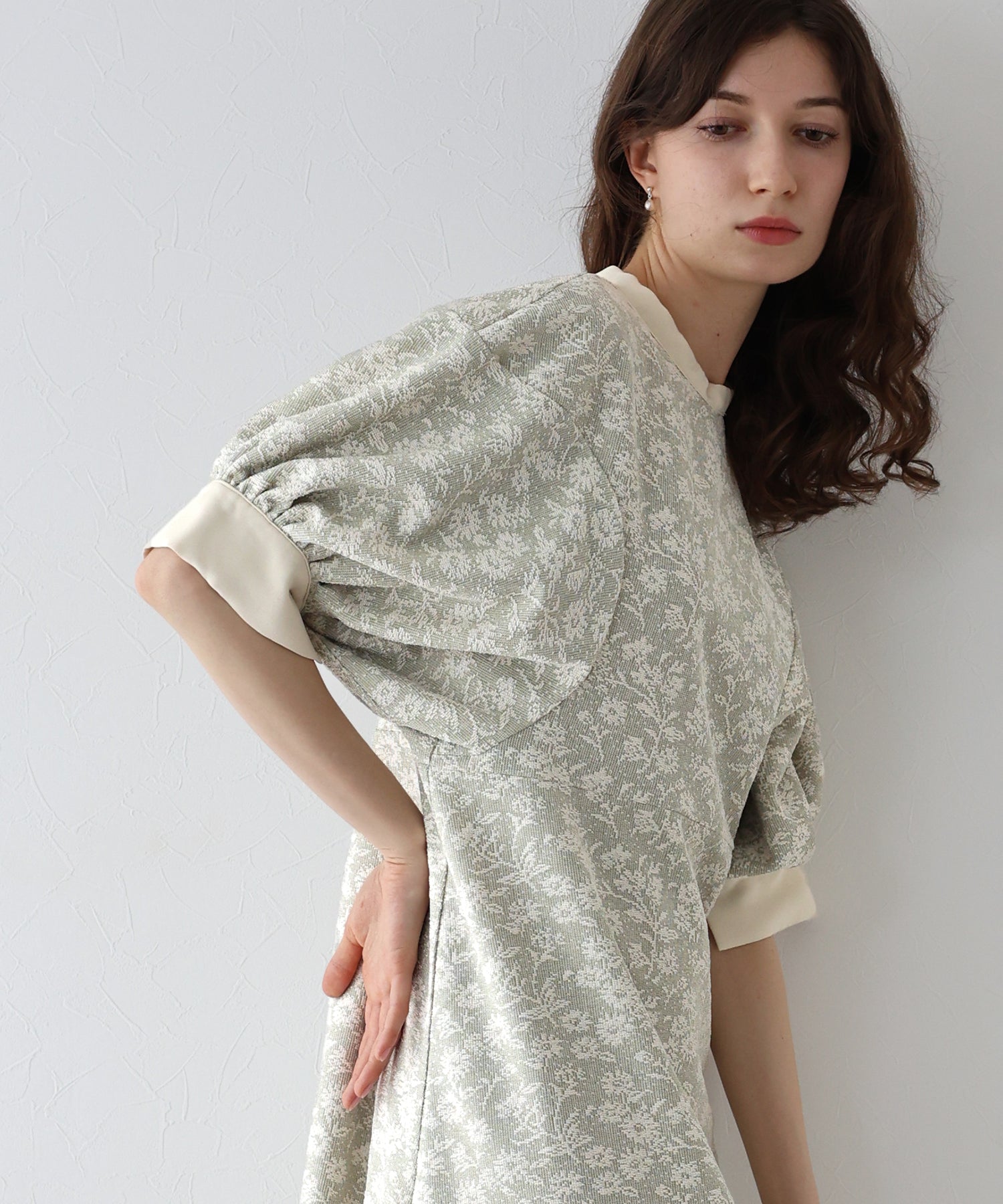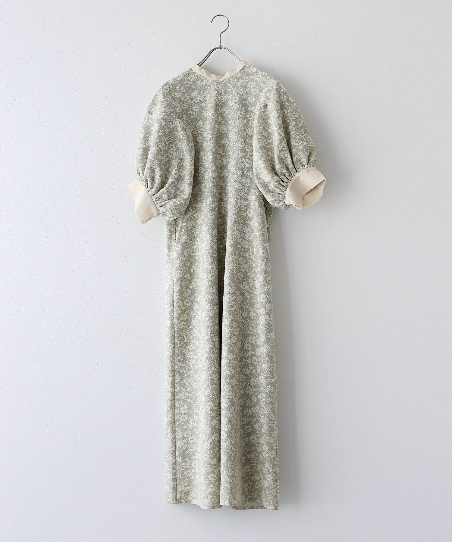 | 生地 | ワンピース全体に福井県で生産された杢調花柄のジャガードレースを贅沢に使用。 グラウンドに杢糸を使用した珍しいレースで、立体的な花柄表現と豊かな色調が特徴的な素材です。 |