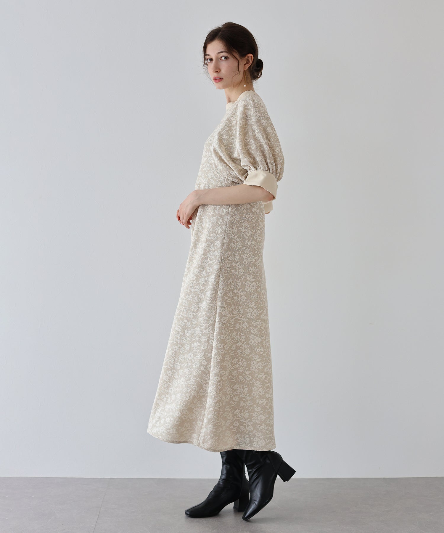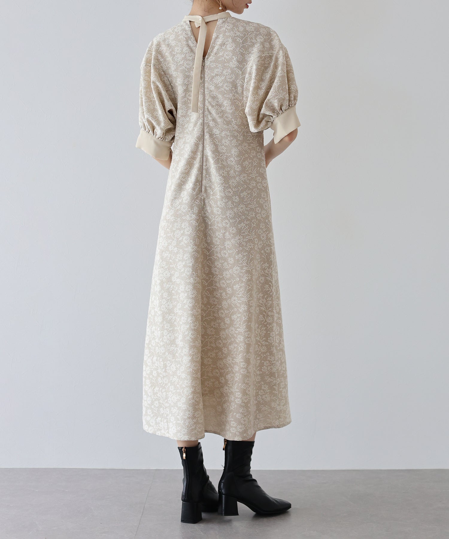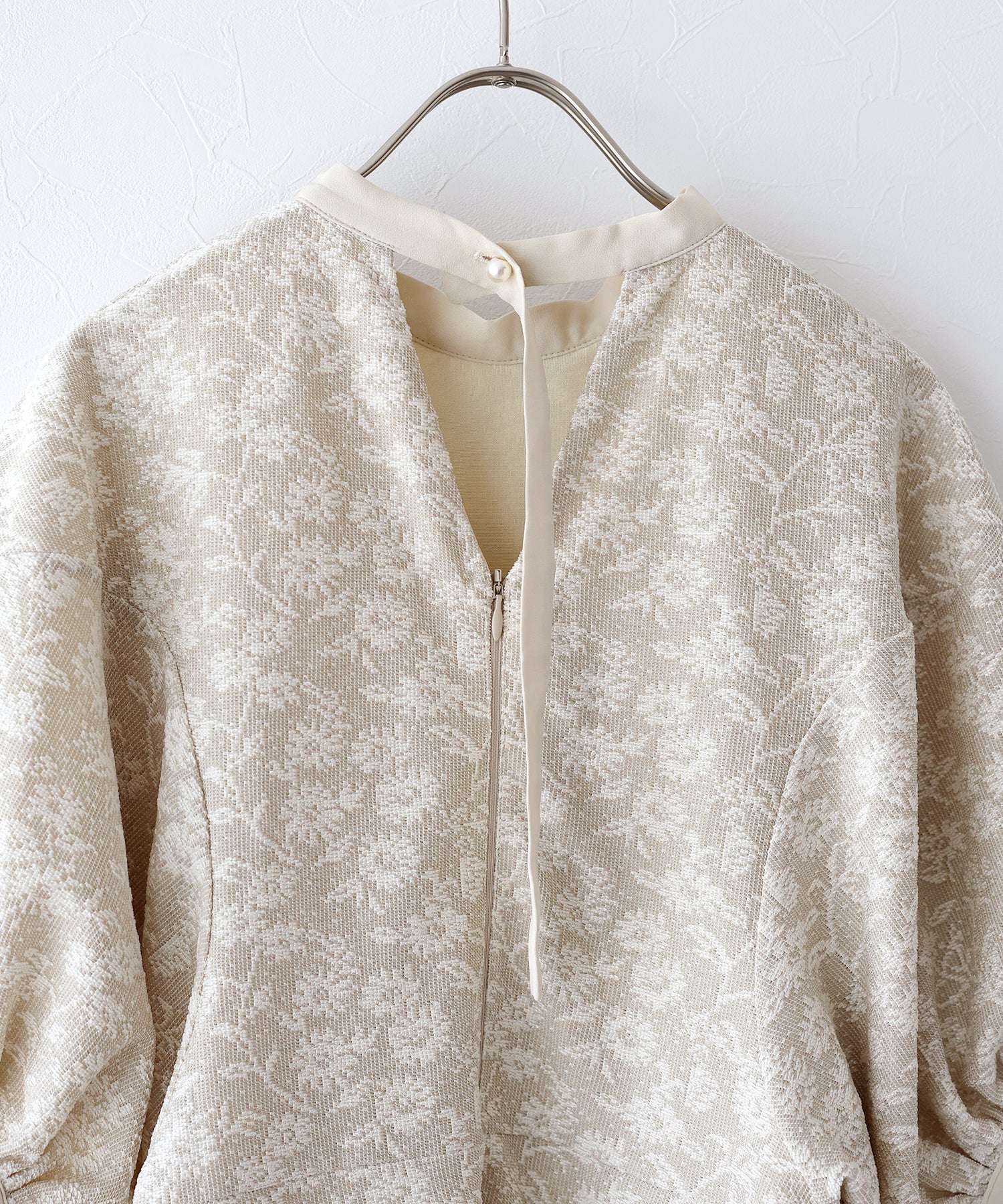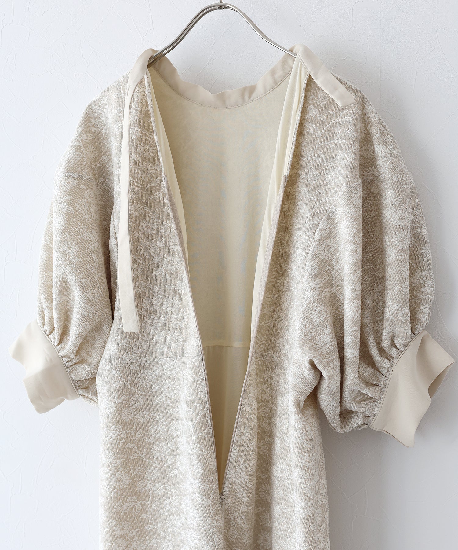 | 生地 | ワンピース全体に福井県で生産された杢調花柄のジャガードレースを贅沢に使用。 グラウンドに杢糸を使用した珍しいレースで、立体的な花柄表現と豊かな色調が特徴的な素材です。 |