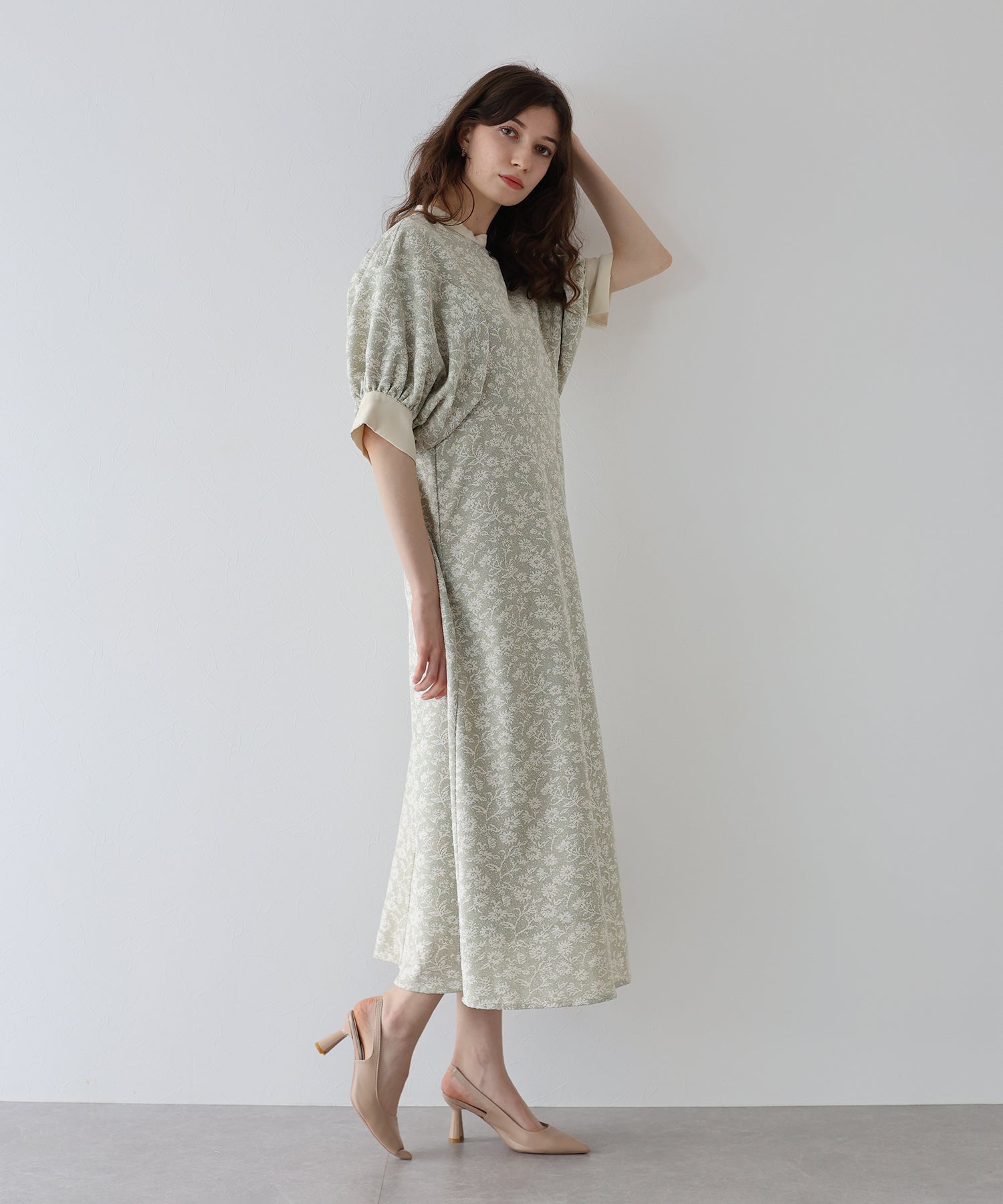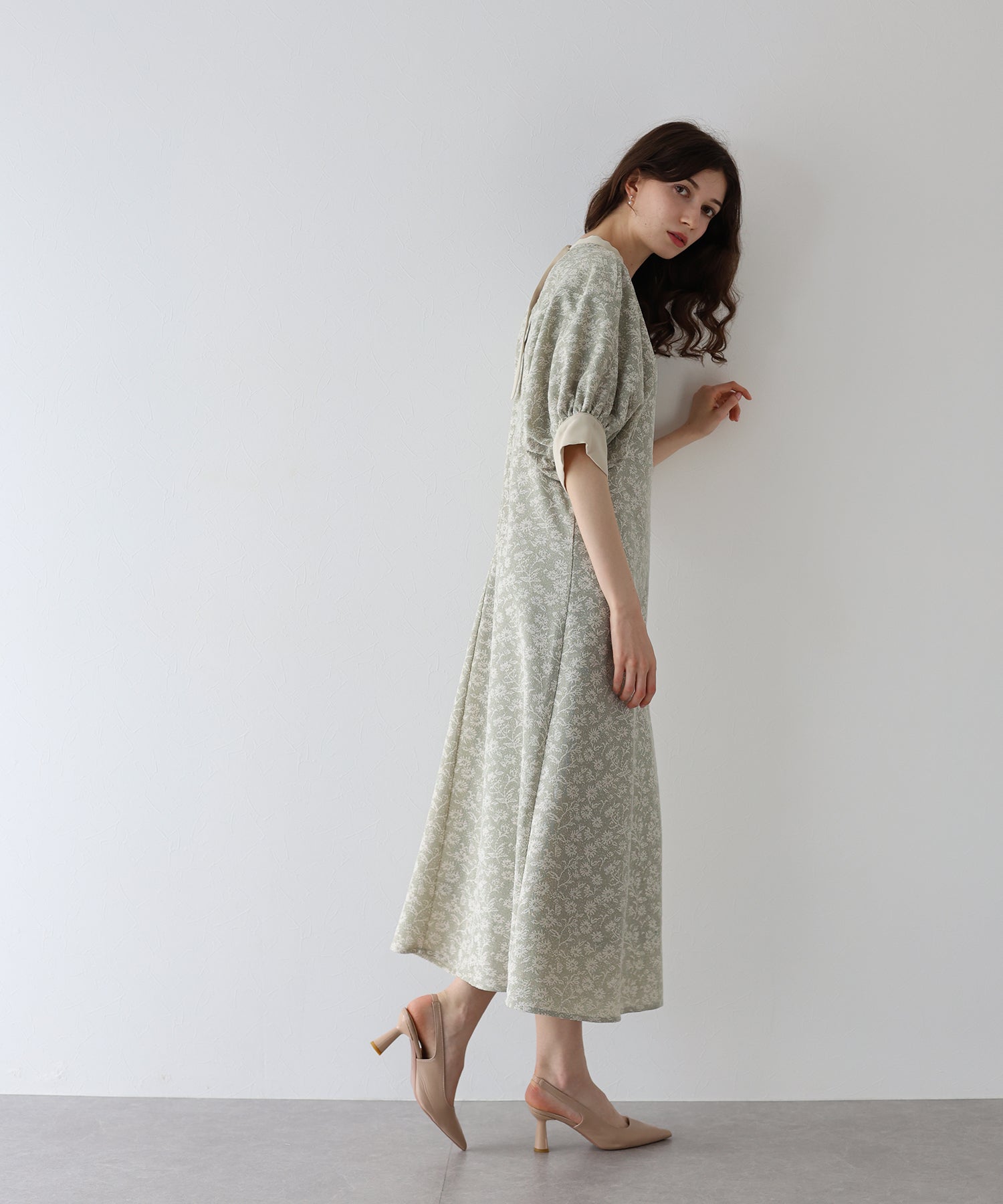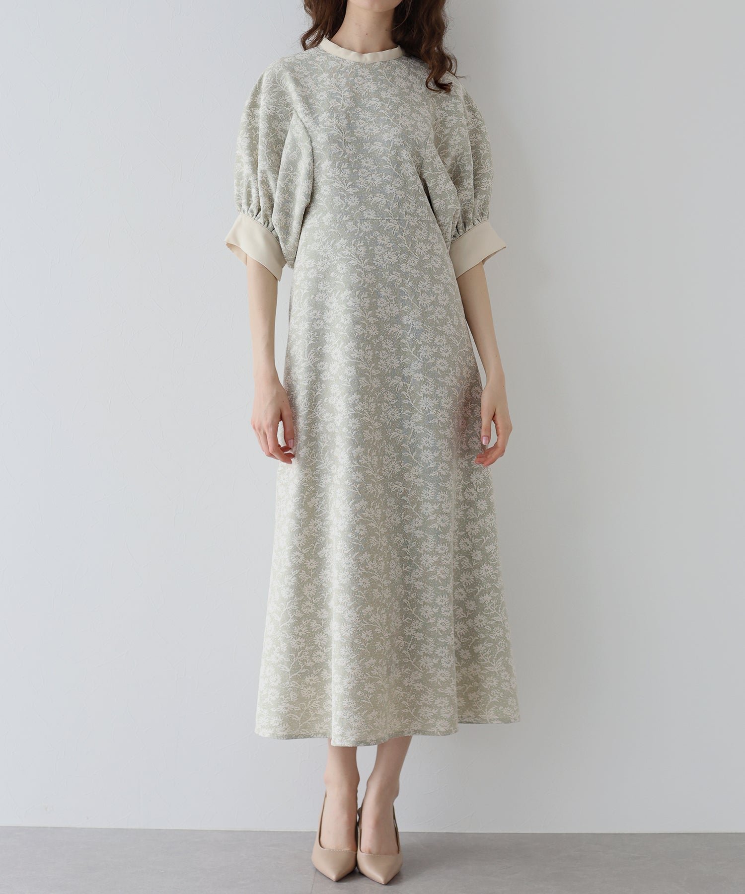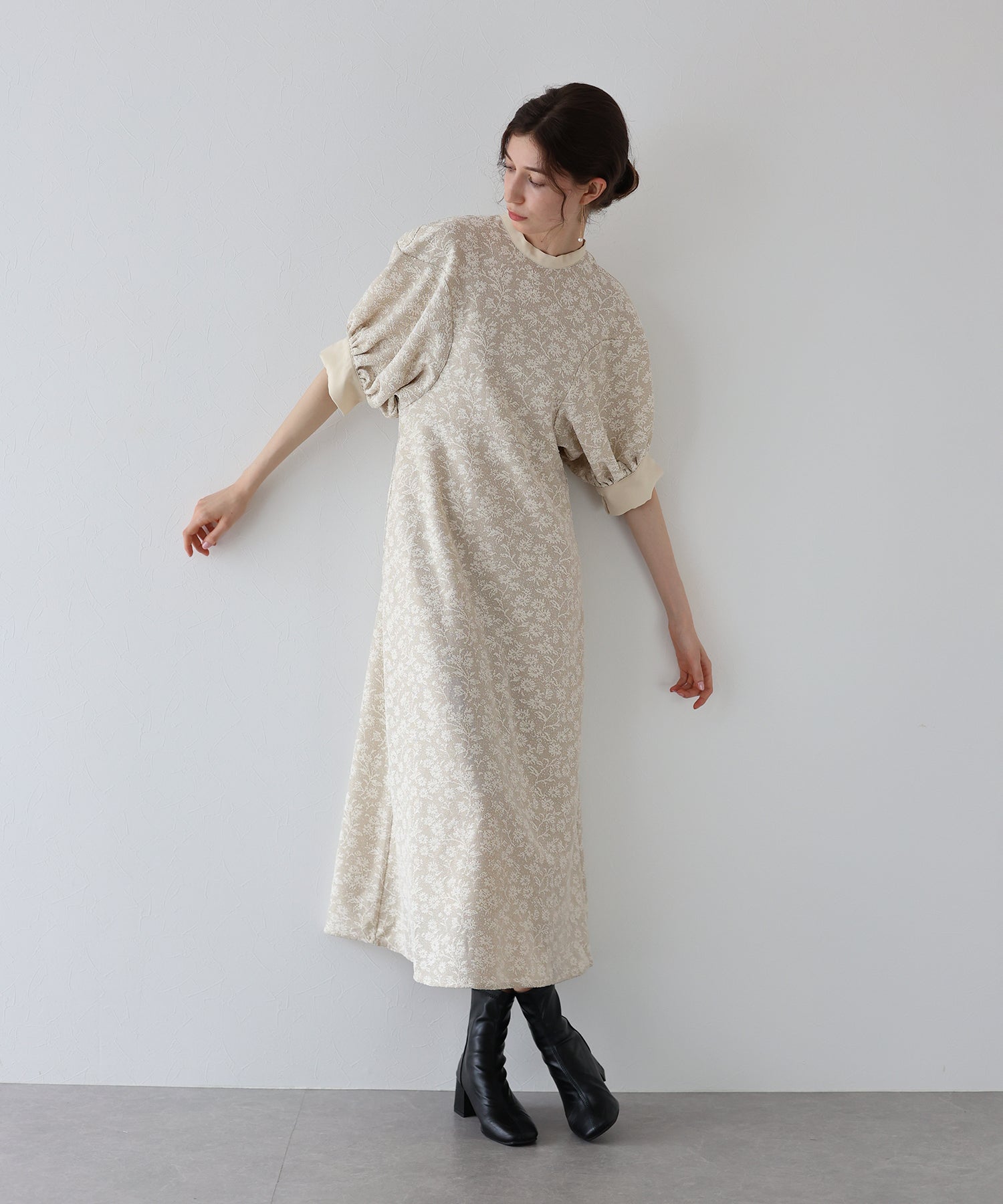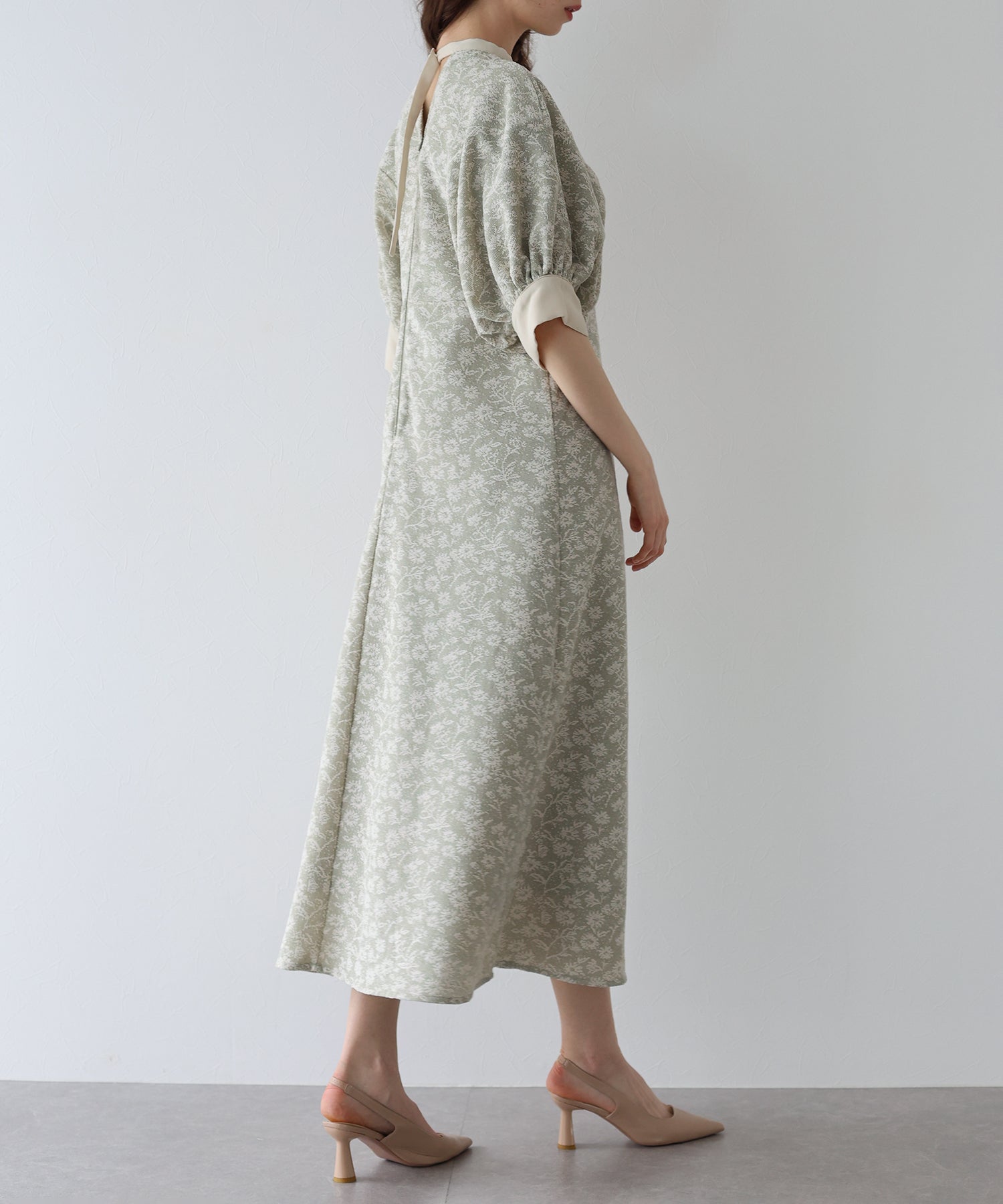 | 生地 | ワンピース全体に福井県で生産された杢調花柄のジャガードレースを贅沢に使用。 グラウンドに杢糸を使用した珍しいレースで、立体的な花柄表現と豊かな色調が特徴的な素材です。 |