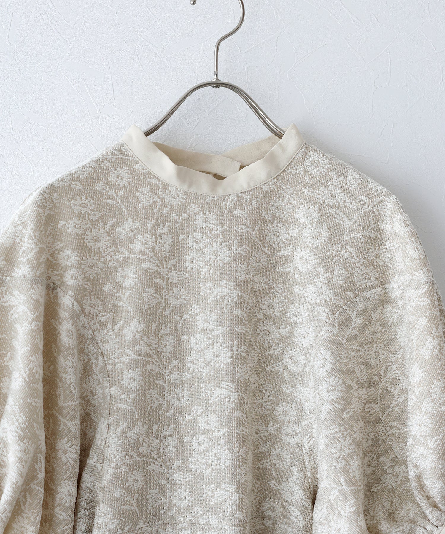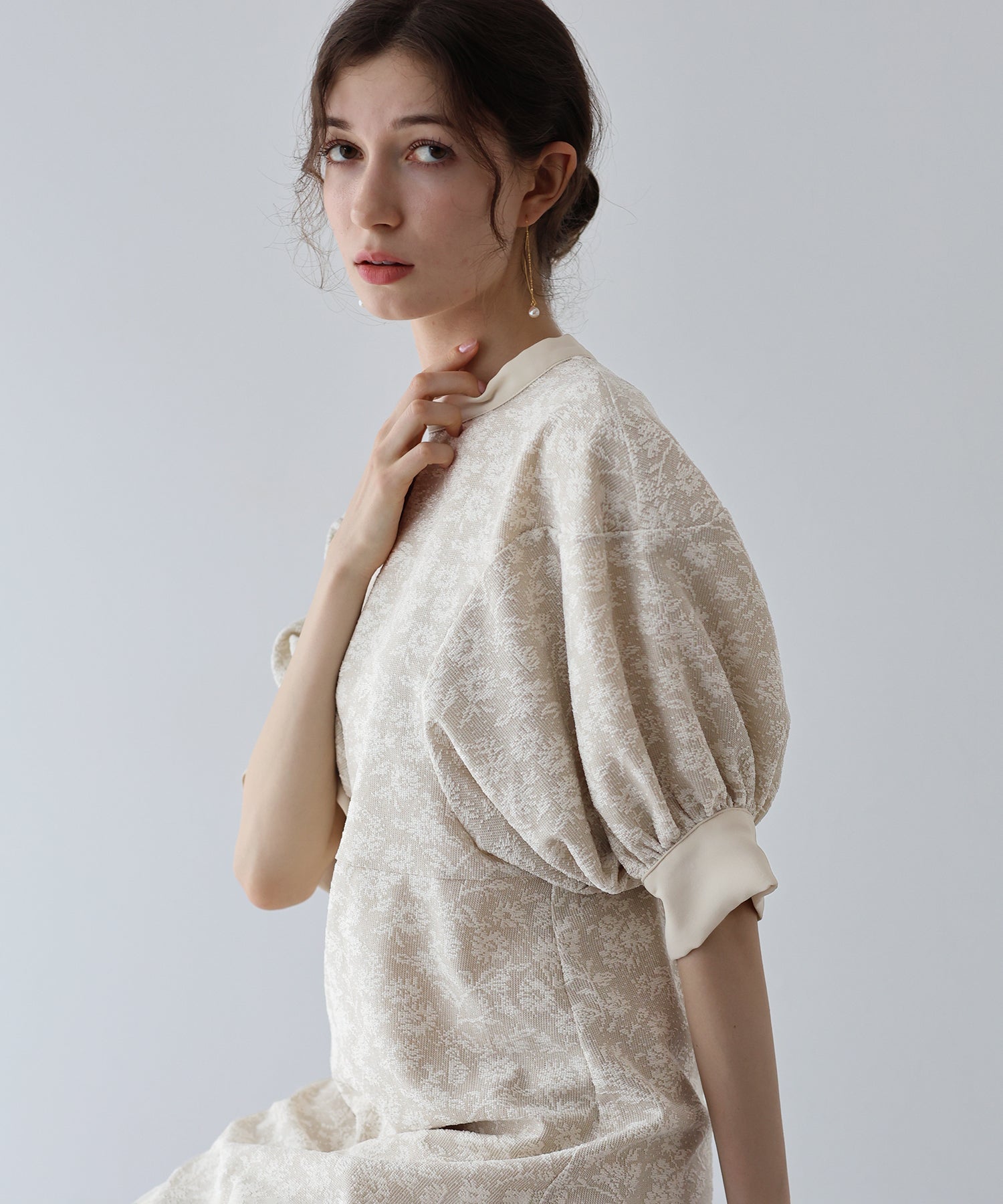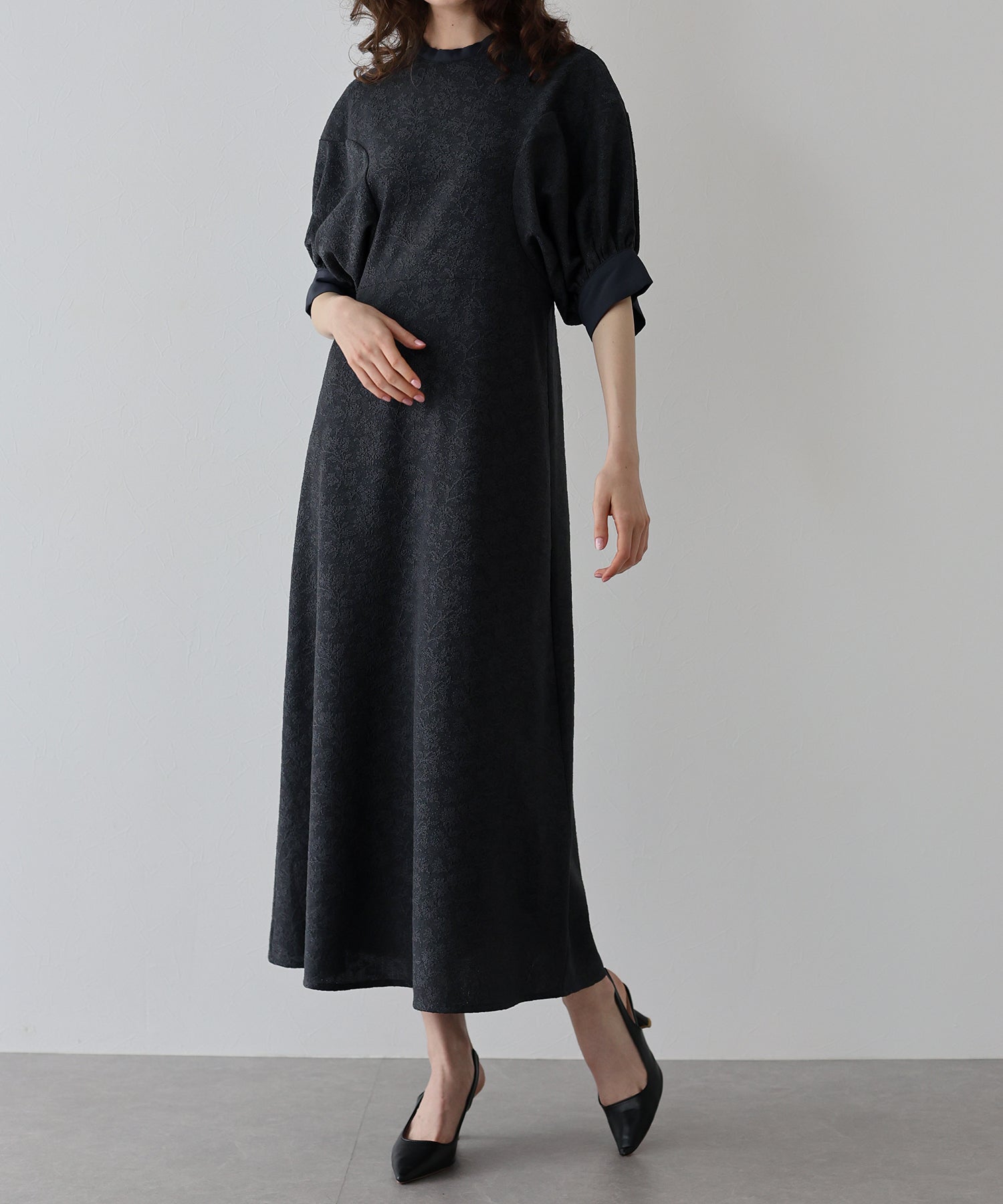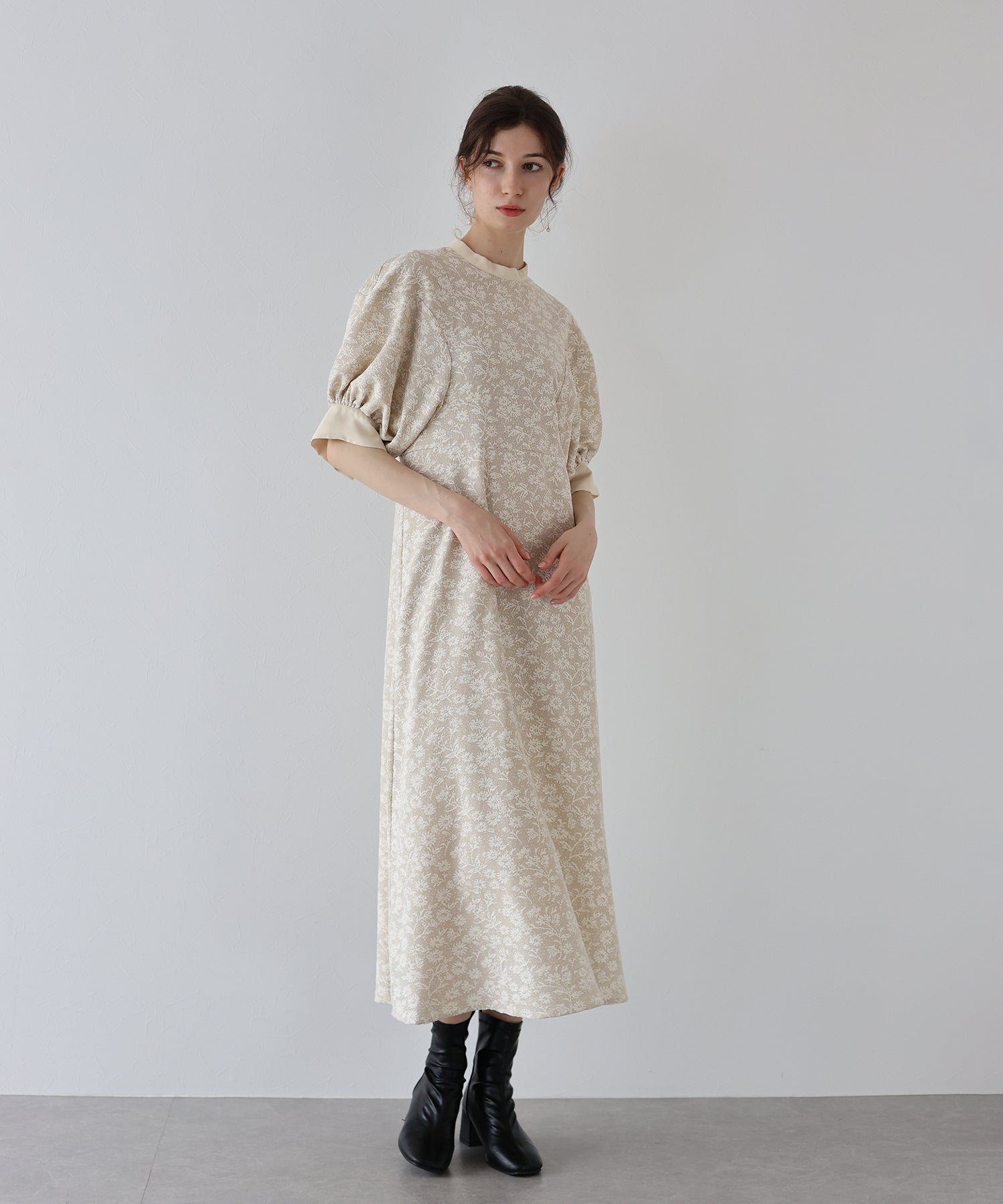 | 生地 | ワンピース全体に福井県で生産された杢調花柄のジャガードレースを贅沢に使用。 グラウンドに杢糸を使用した珍しいレースで、立体的な花柄表現と豊かな色調が特徴的な素材です。 |