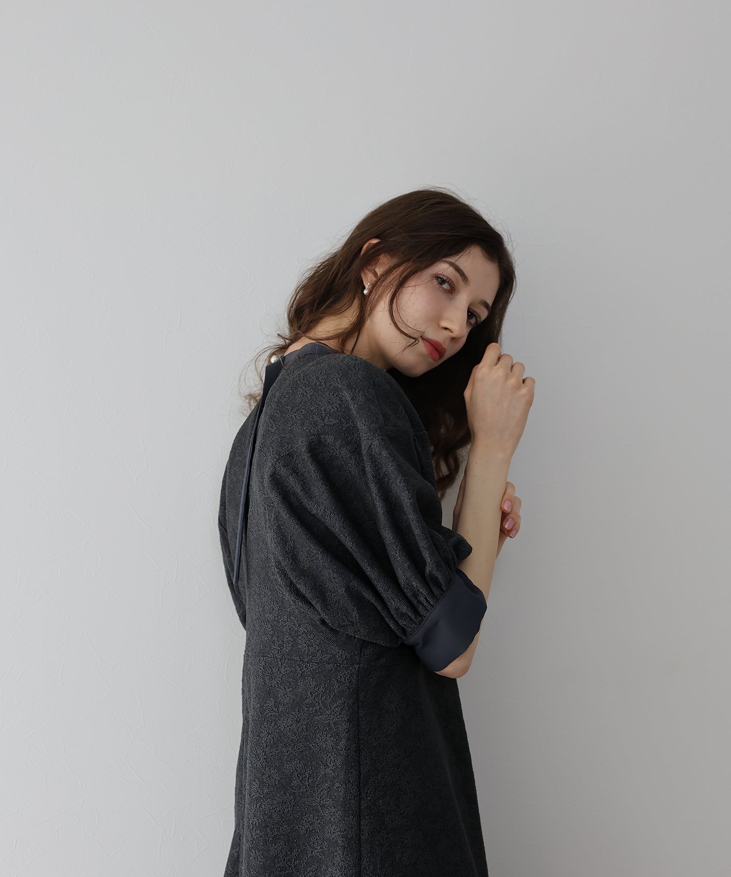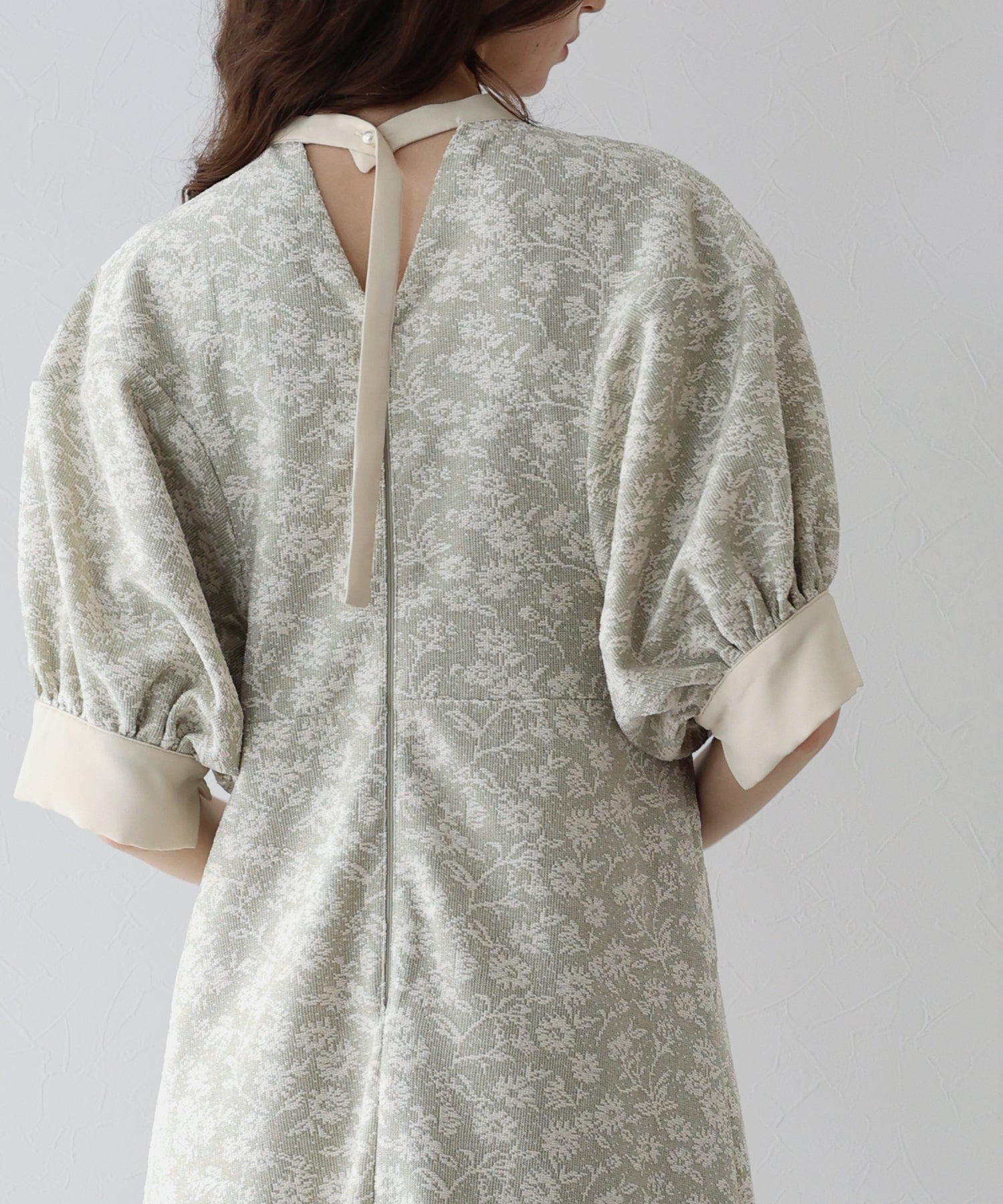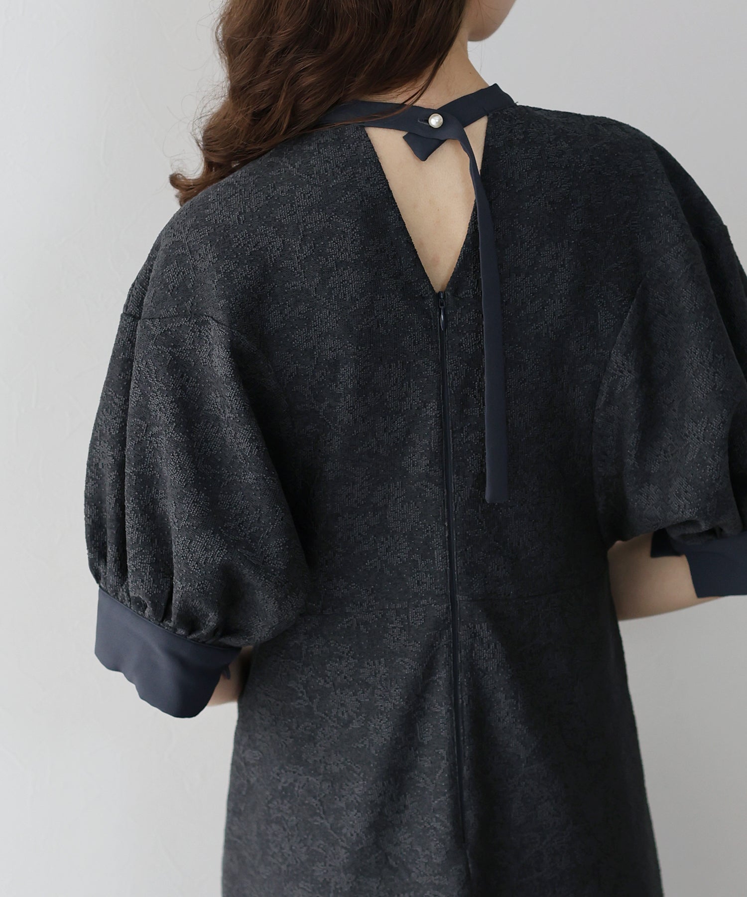 ?POINT 少し広めの背中開きにすることで抜け感がプラスされ、長めに垂れるリボンとポイントのパールボタンで後ろ姿から洗練された雰囲気が漂います。 また、襟と袖口に異素材を使用することでデザイン性をプラス。 袖はぽわんとしたドルマンスリーブで気になる腕がカバーでき、高めのウエストラインでスタイルアップ効果も。