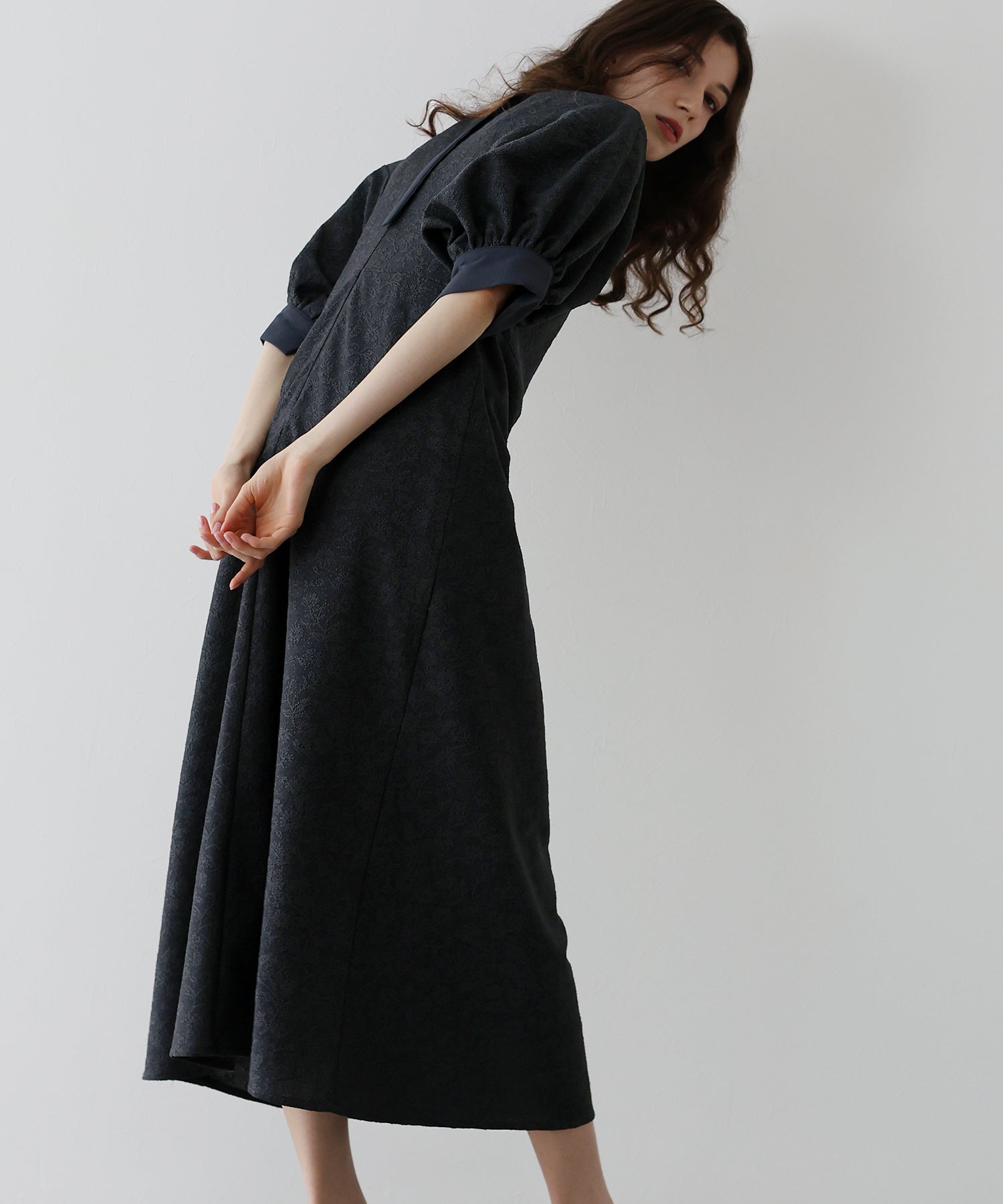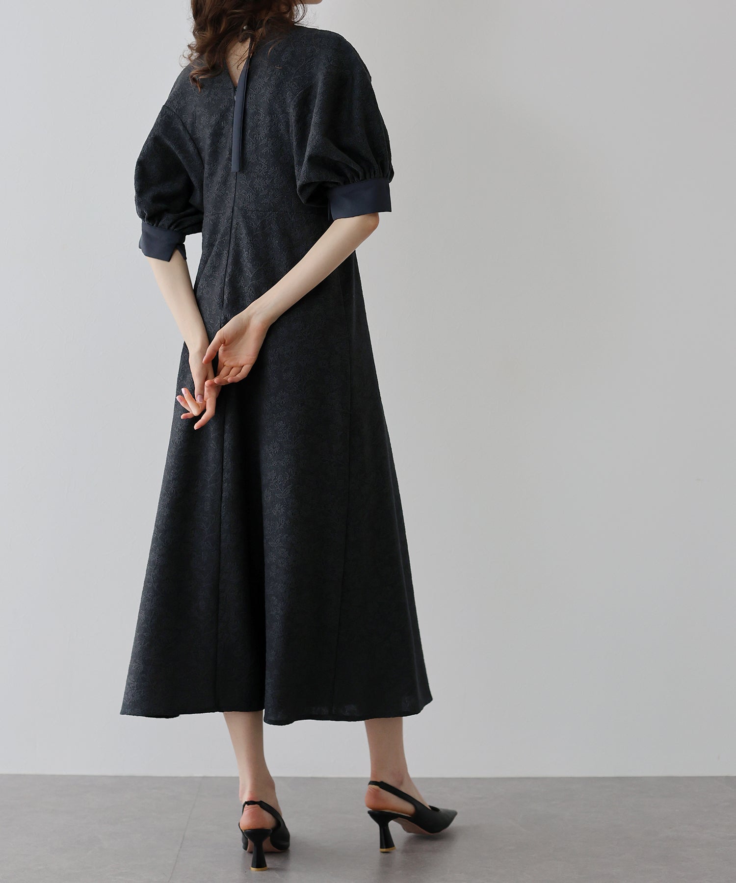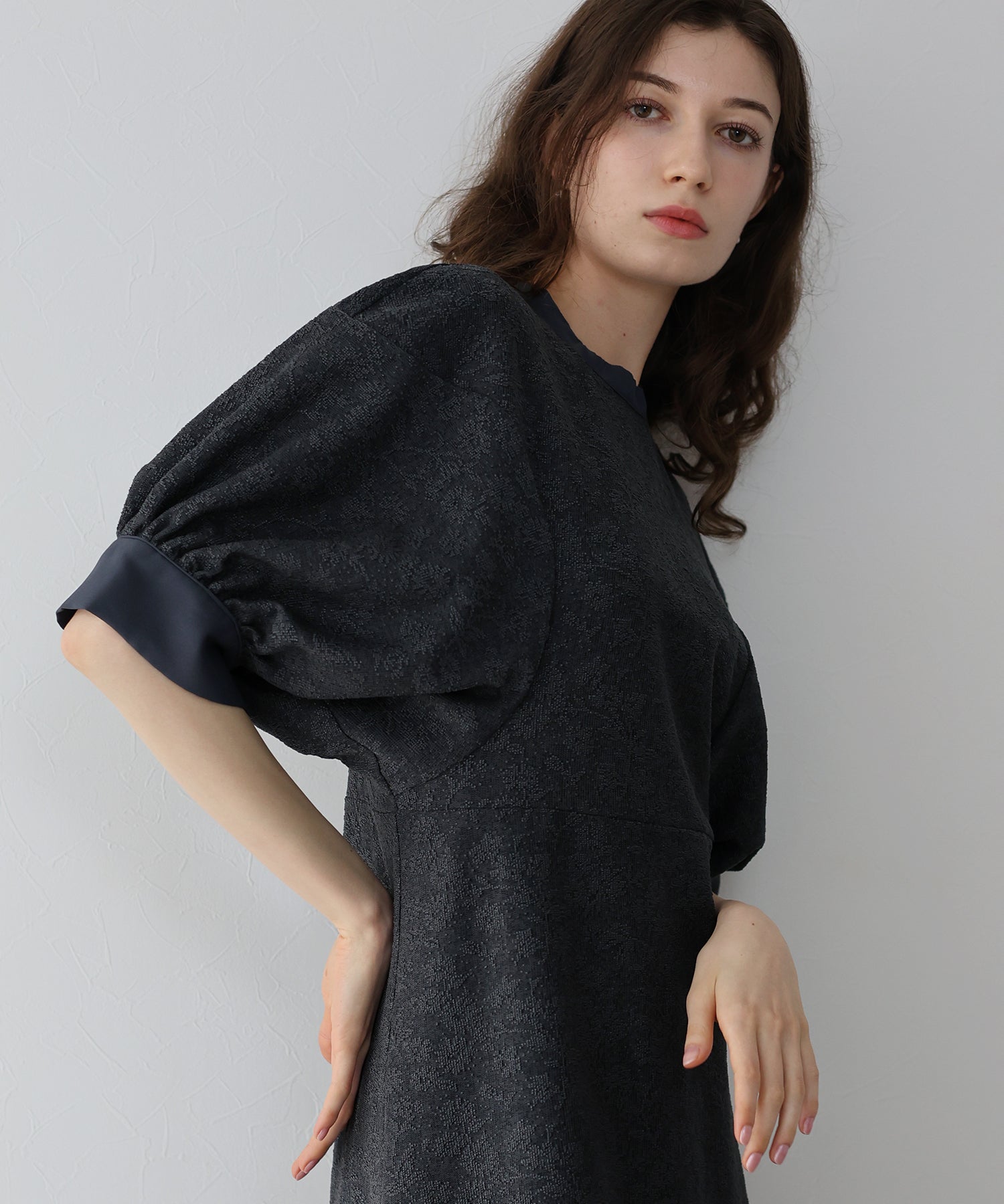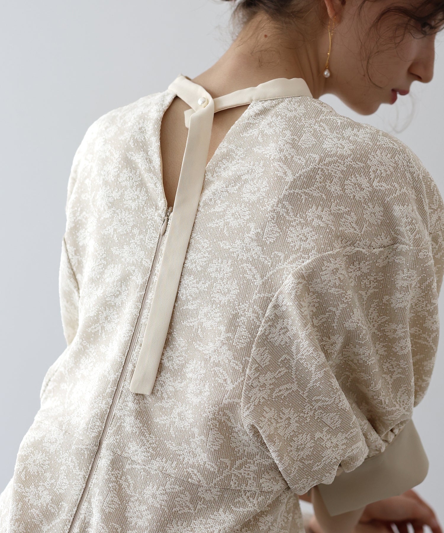 ?POINT 少し広めの背中開きにすることで抜け感がプラスされ、長めに垂れるリボンとポイントのパールボタンで後ろ姿から洗練された雰囲気が漂います。 また、襟と袖口に異素材を使用することでデザイン性をプラス。 袖はぽわんとしたドルマンスリーブで気になる腕がカバーでき、高めのウエストラインでスタイルアップ効果も。