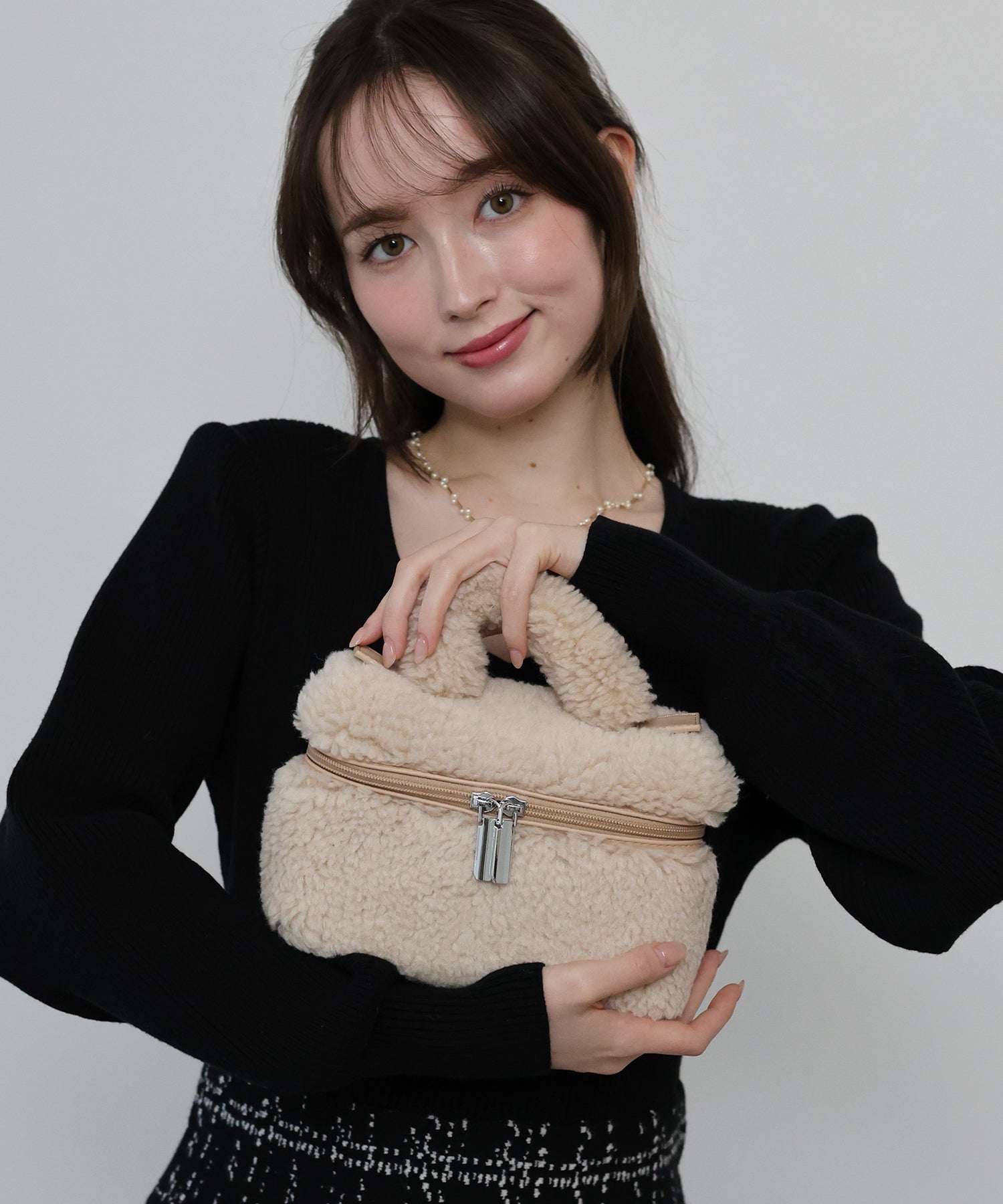 秋冬らしいボアが魅力のミニバニティバッグ ?POINT ころんとしたサイズ感が愛らしいミニバッグ。 ふわふわのボア素材がシーズンライクなムードを演出します。 ハンドルに施したフェイクレザーがアクセントとなってかわいらしい印象に。 ファスナーでぱかっと大きく開くので、中身も見やすく取り出しやすいです。 ミニ財布やスマートフォン?リップなど、お出掛けに必要なアイテムも入ります。 手に持つだけでシーズンムードがあふれるひとつ持っていて損はないアイテムです。