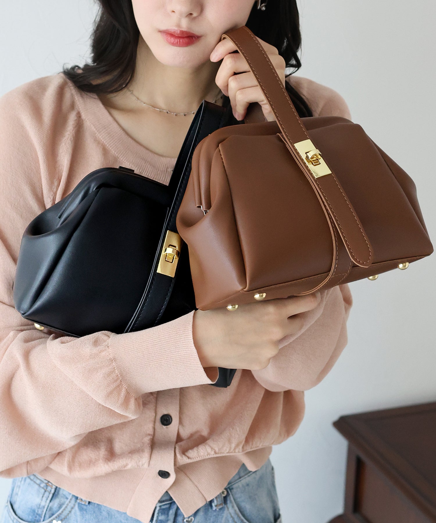 コーデをクラシック&キレイめに仕上げるがま口ハンドバッグ