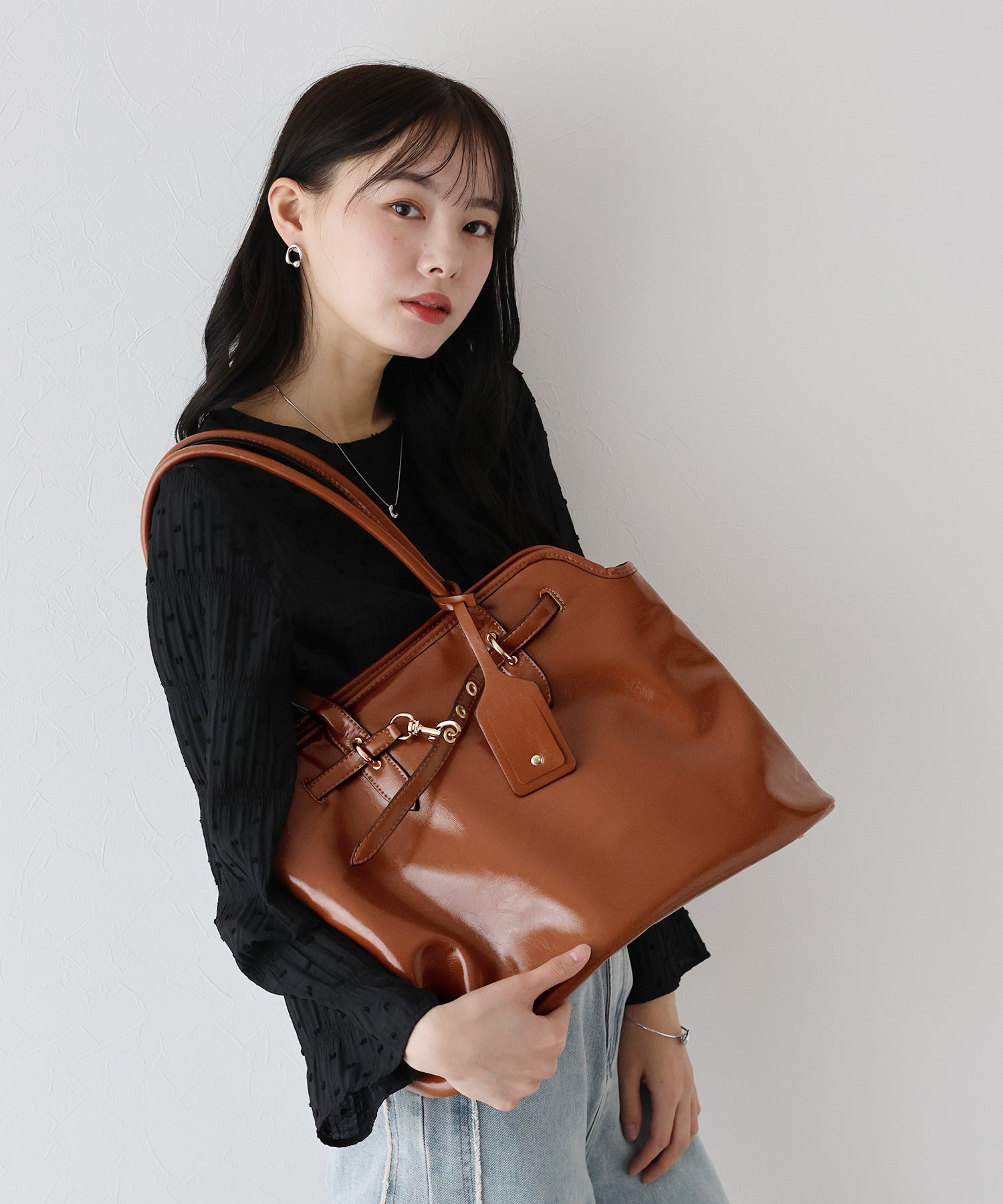?POINT フロントのベルトデザインが目を惹くバッグ。 光沢感のあるヴィンテージライクな合皮を使用し、Y2Kスタイルや90sの雰囲気を醸し出すトレンド感溢れるデザイン。 マチがたっぷりある大きめのサイズ感のバッグなのでデイリーに使いやすく、 スマートフォン、財布やハンカチ、ペットボトルなど、お出掛けに必要なアイテムも入ります。 500mlのペットボトルやタブレット、お弁当箱が入る広めのマチでA4収納可能なので通勤通学にも◎ ファスナー付きの内ポケットがあるのでリップなどのちょっとした小物を入れて頂くのに便利です。