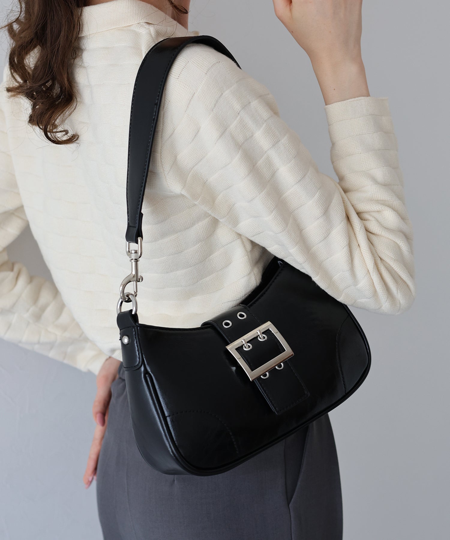 フロントの太めなベルトバックルデザインが目を惹くワンハンドルバッグ。