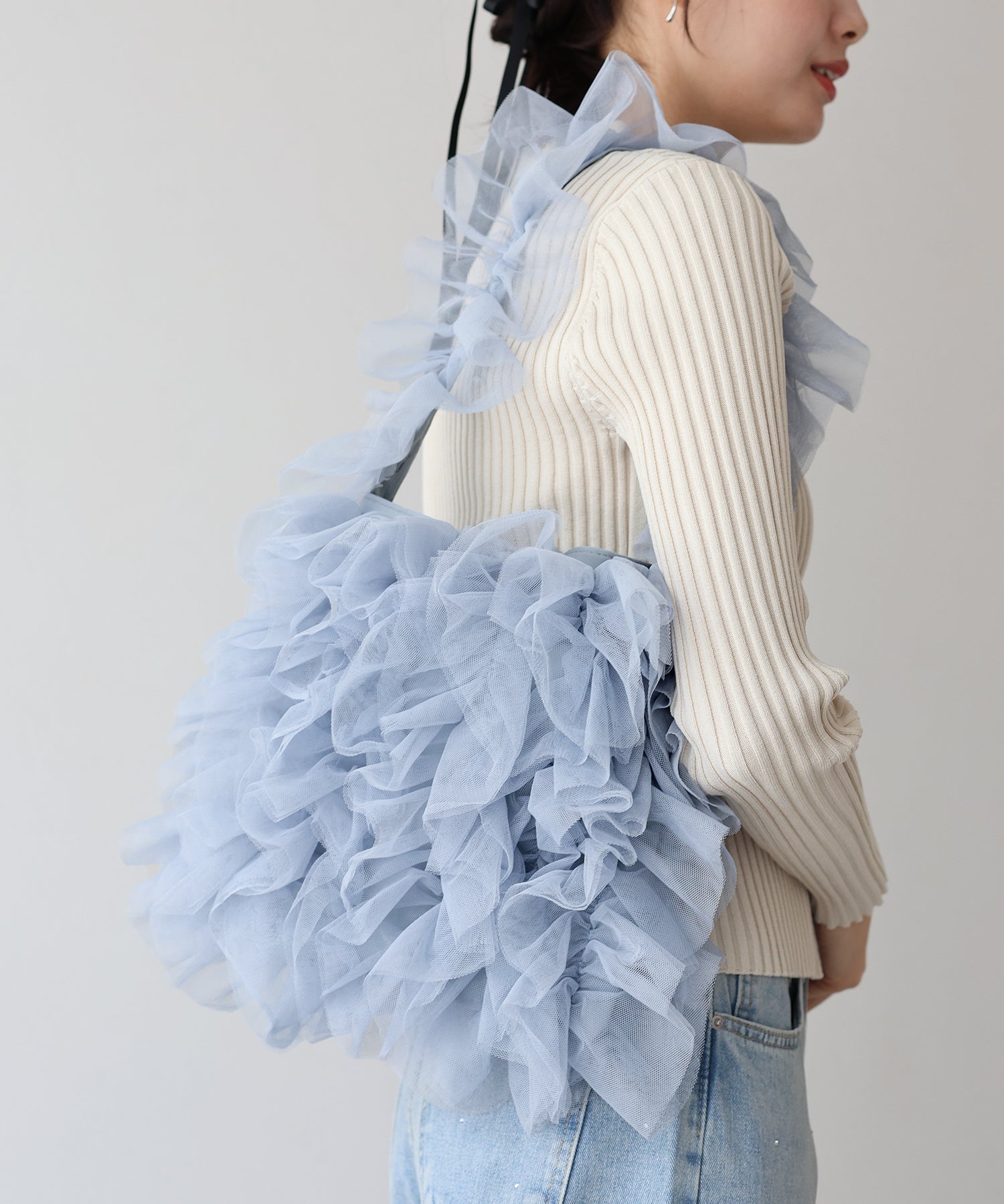 チュールが主役のトレンドライクなチュールバッグ ?POINT つい手に取りたくなる、ふんだんにチュールを使ったフリルが可愛いトートバッグ。 フリルのボリューム感で存在感があり、いつものコーディネートに取り入れるだけでコーデのオシャレなポイントに! 長財布やスマホ、小物などの必要な荷物が収まるサイズ感で、500mlのペットボトルが縦に入ります。 内側にはポケット付きなので小物の仕分けもばっちり◎ ショルダー部分は肩にかけても余裕のある長さで、シーズンを問わず幅広いコーデにお使いいただけます。 何層にも重なったフリルで映えること間違いなしのアイテムです。