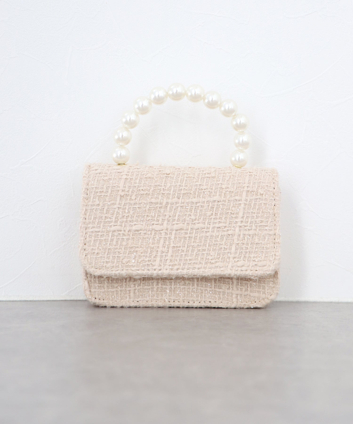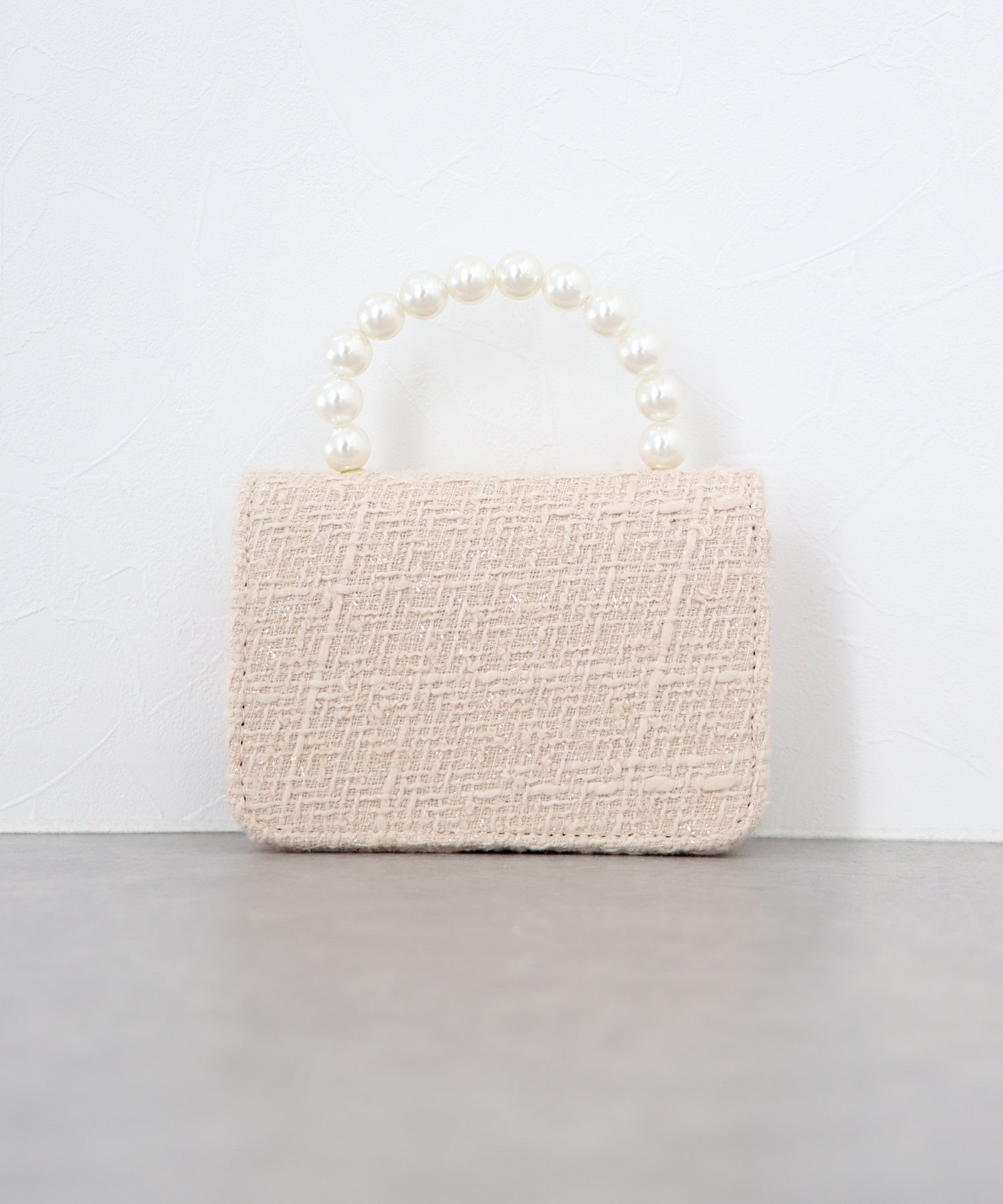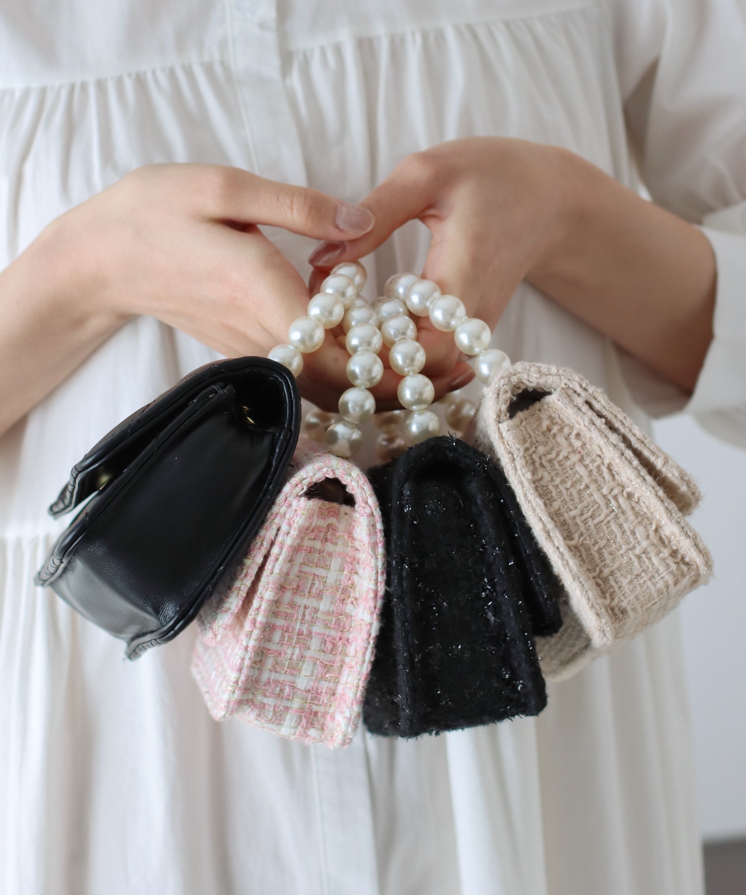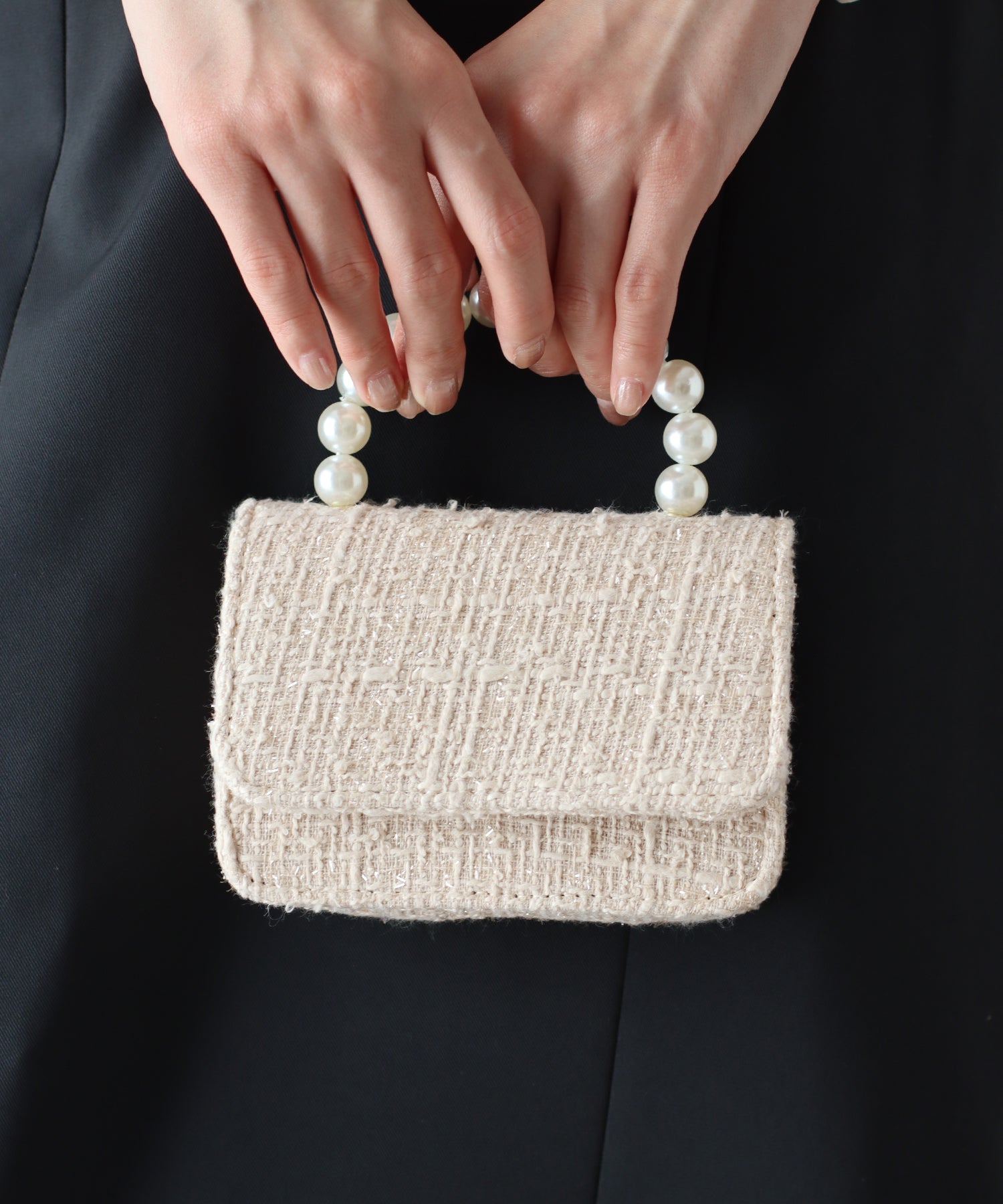 アクセサリー感覚で使える、パールハンドルのミニサイズバッグ ?POINT ころんとした小さめサイズが可愛い、ミニショルダーバッグ。 コンパクトなサイズ感なので、コーデのアクセントとしてななめ掛けでアクセサリーのように使用していただくのが◎ マットなフェイクレザーとツイードが上品で、華やかなパールがパーティードレスにも馴染むので 結婚式やパーティー、成人式、お食事会などのオケージョンシーンにもおすすめです。